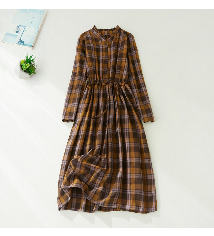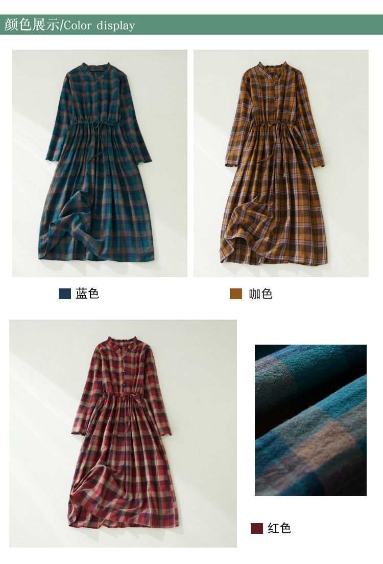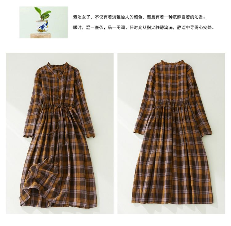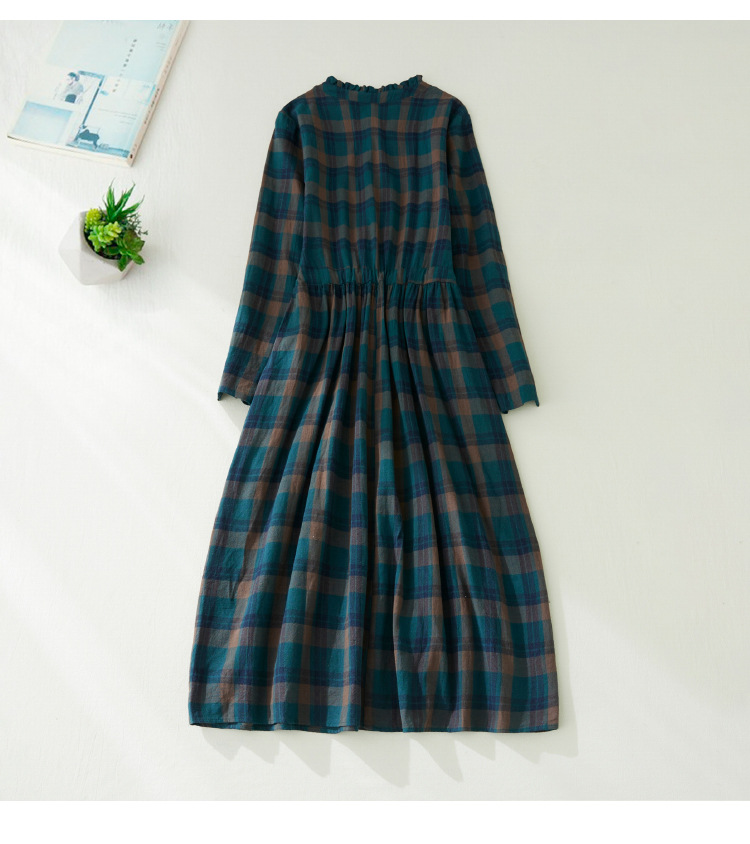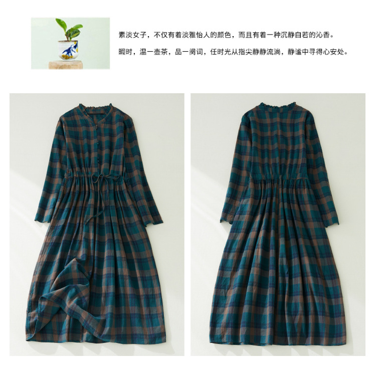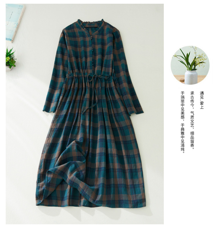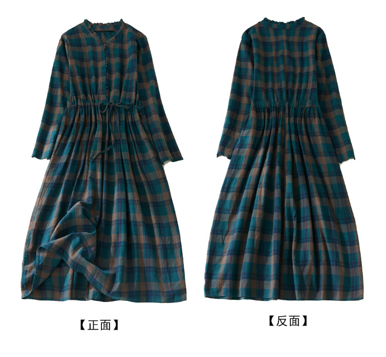 秋装新款大码女装复古收腰显瘦系带花边领长袖中长款格子连衣裙女