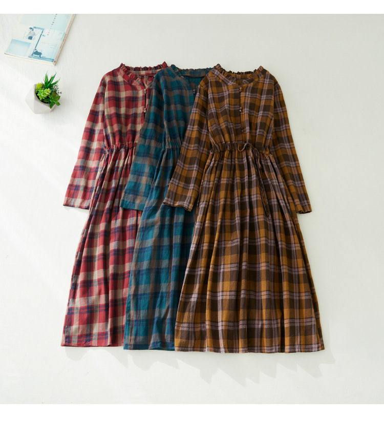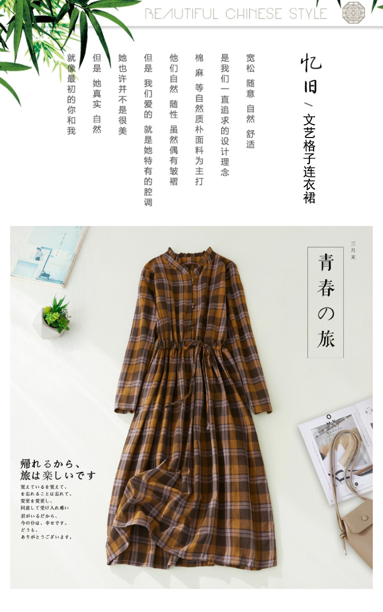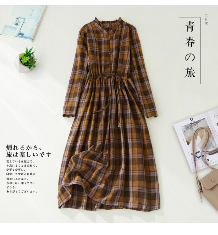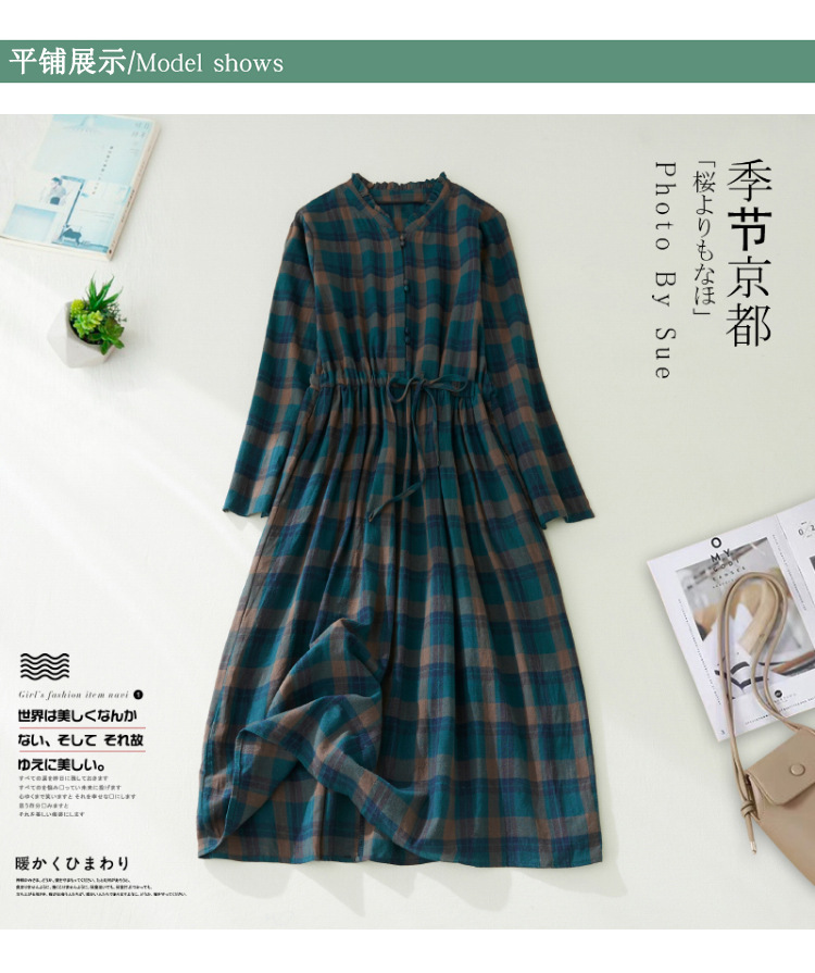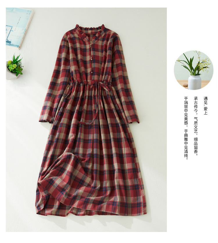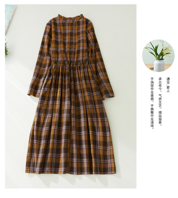 秋装新款大码女装复古收腰显瘦系带花边领长袖中长款格子连衣裙女