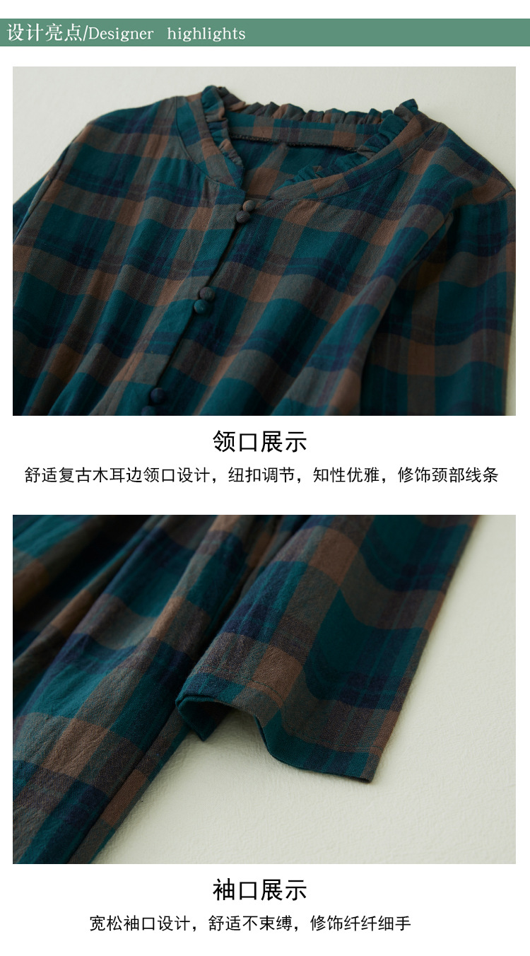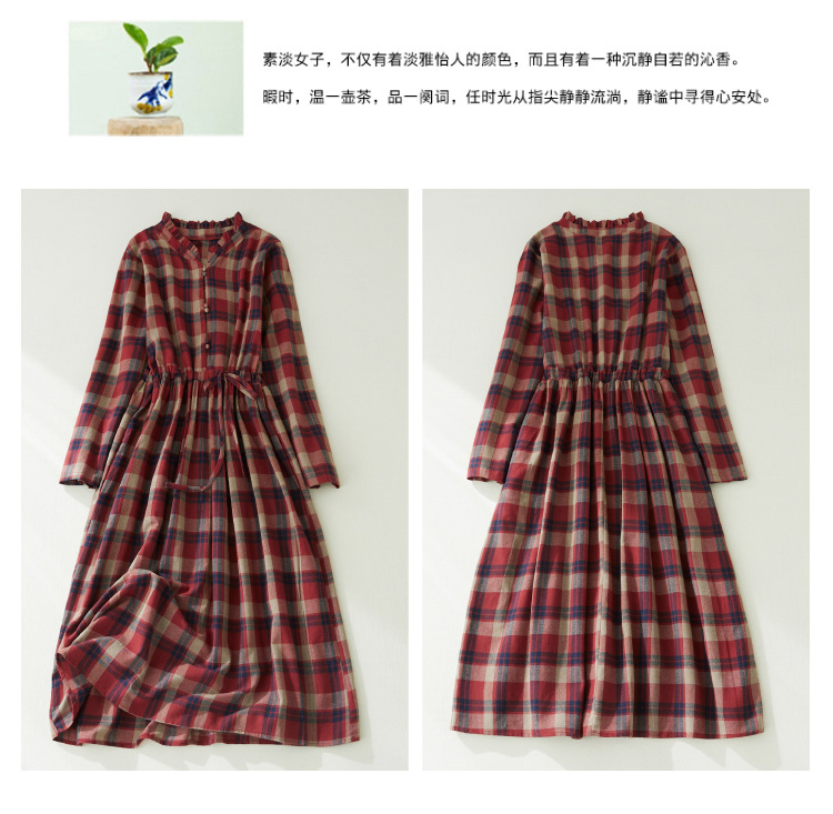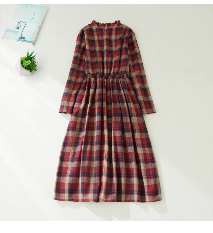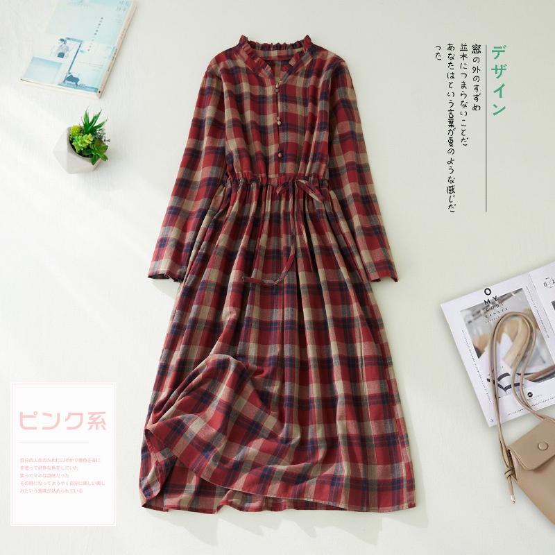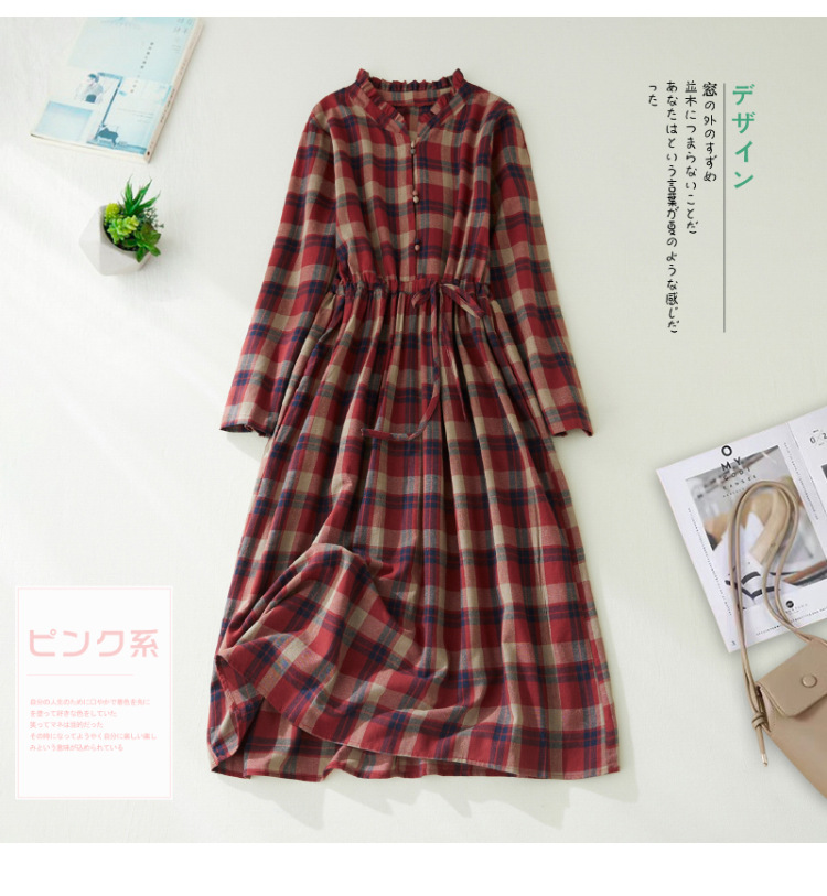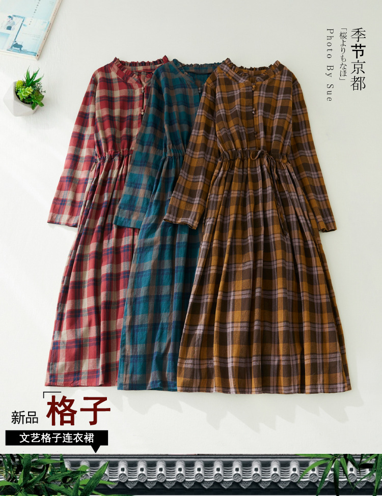 秋装新款大码女装复古收腰显瘦系带花边领长袖中长款格子连衣裙女