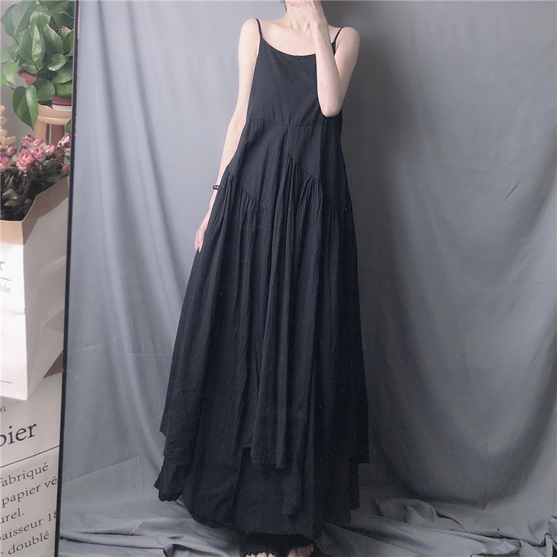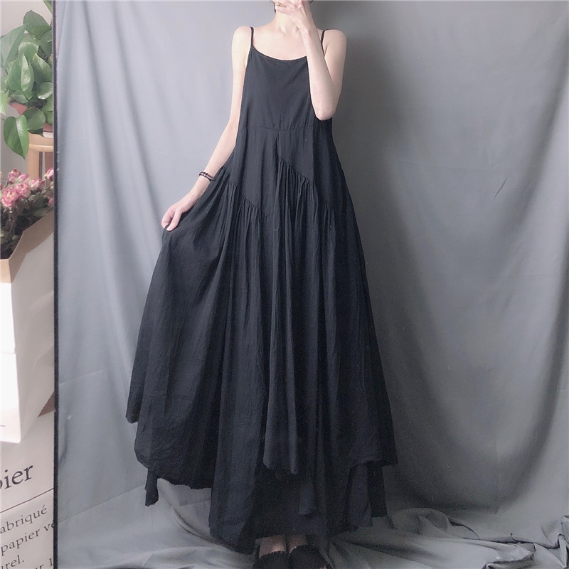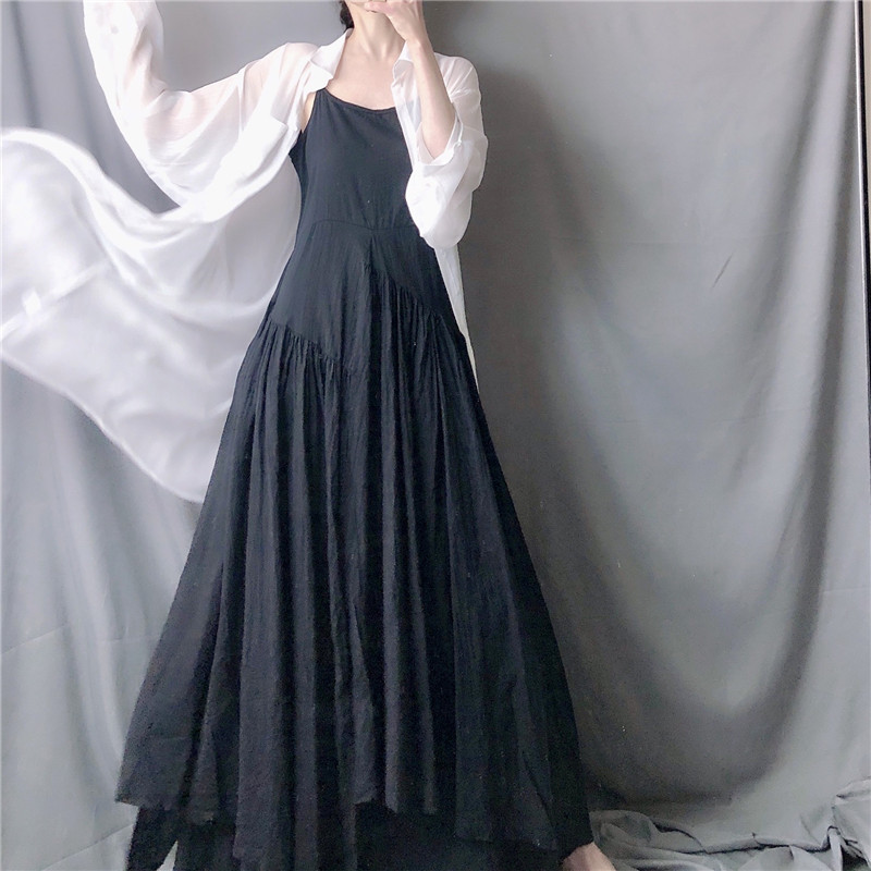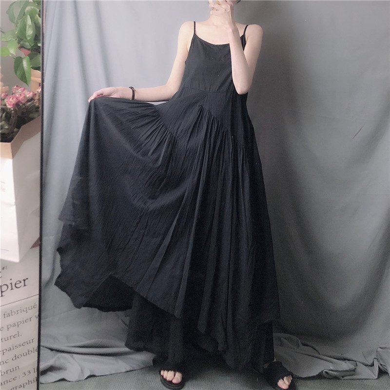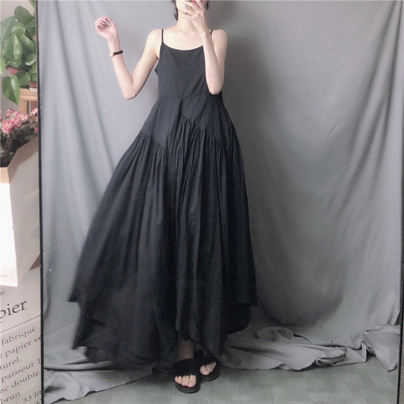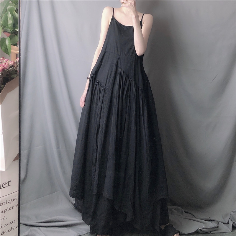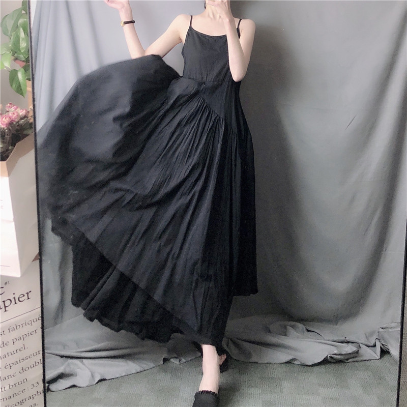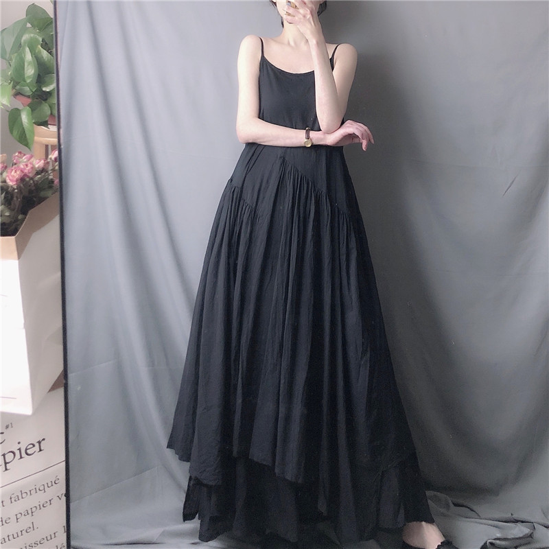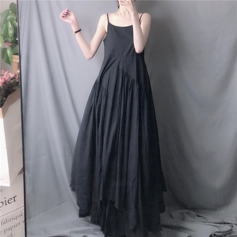 黑白超长不规则大摆吊带连衣裙女2024夏季新款文艺清新气质长裙子