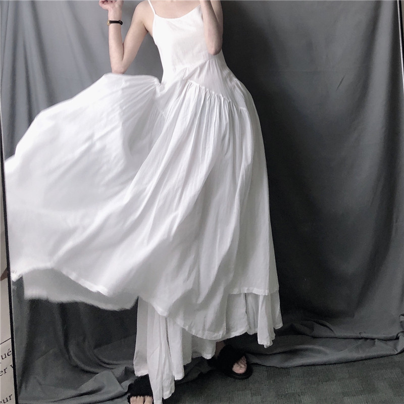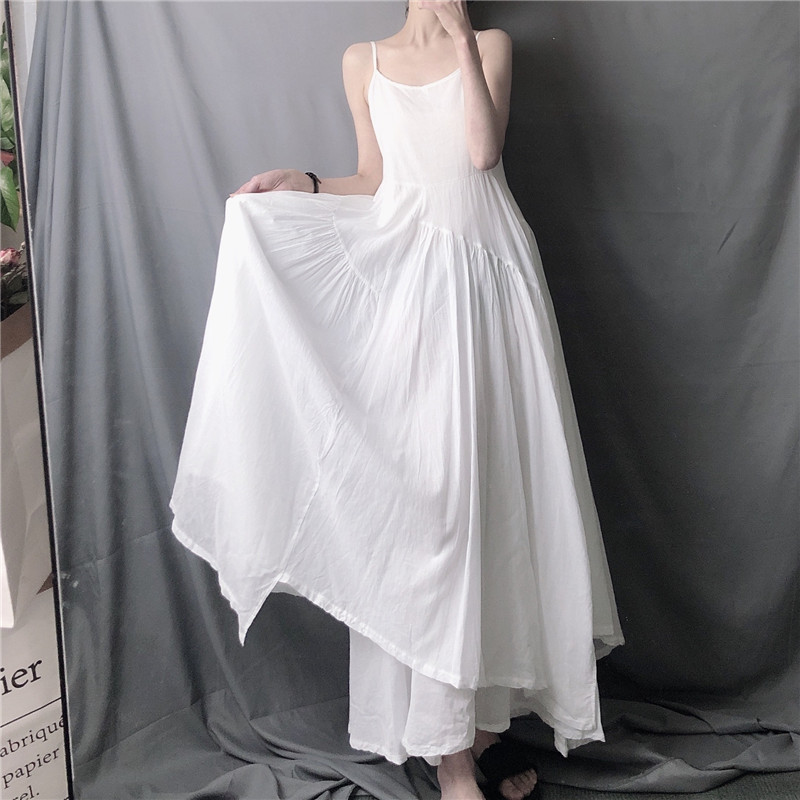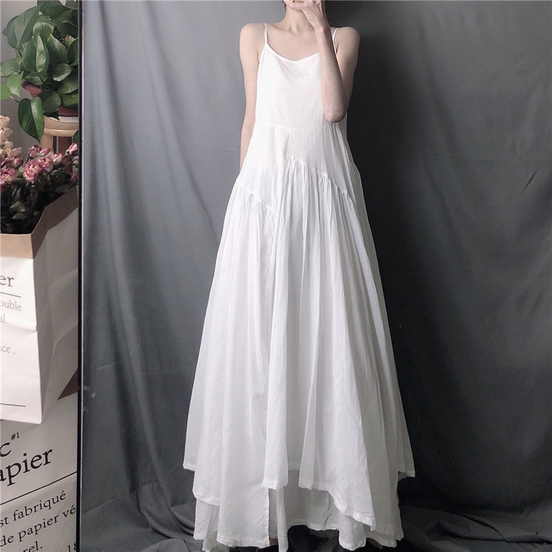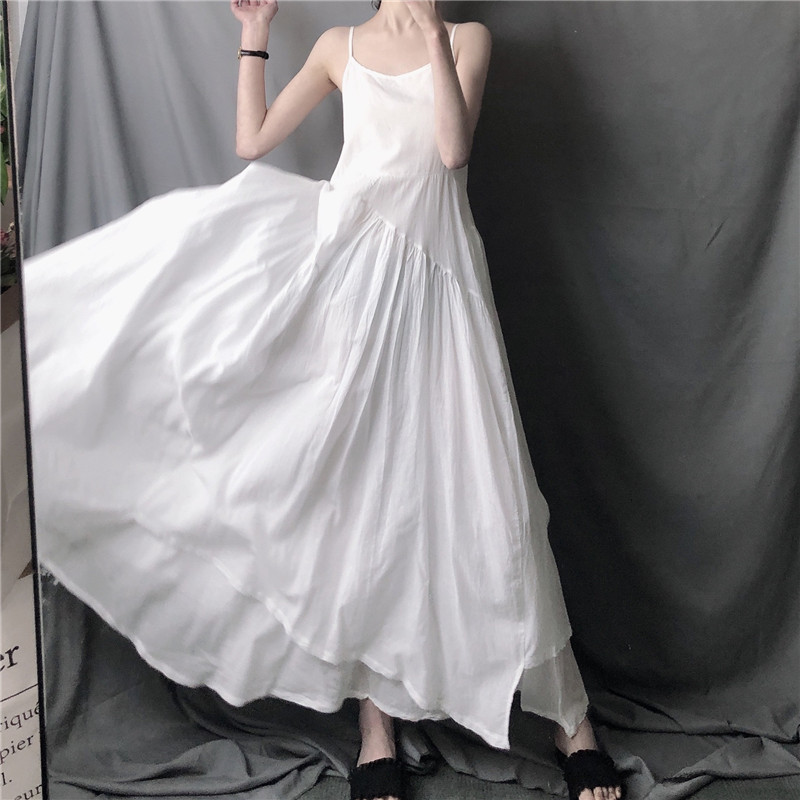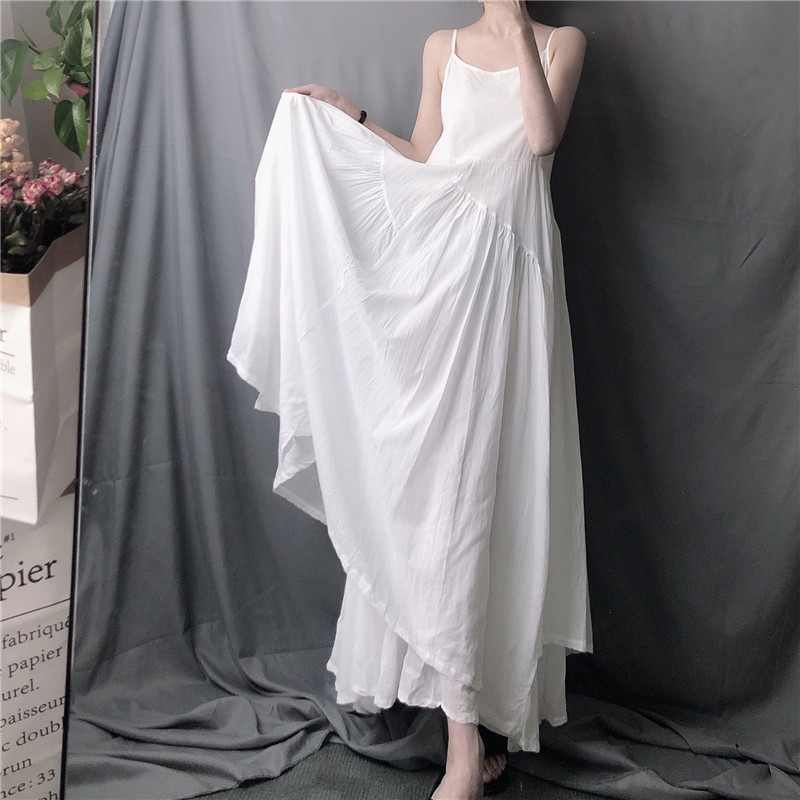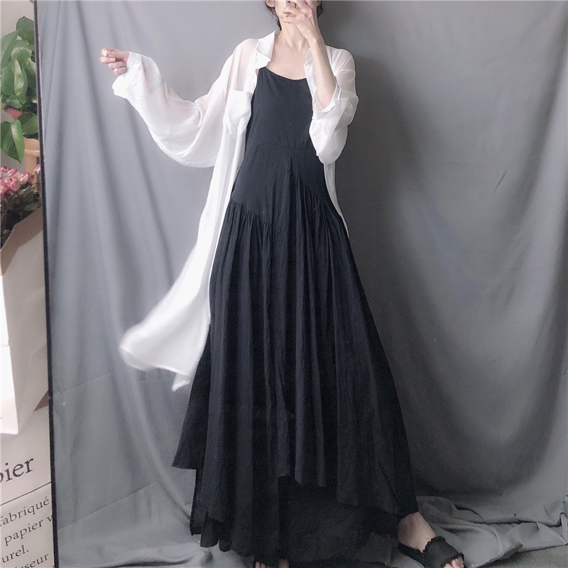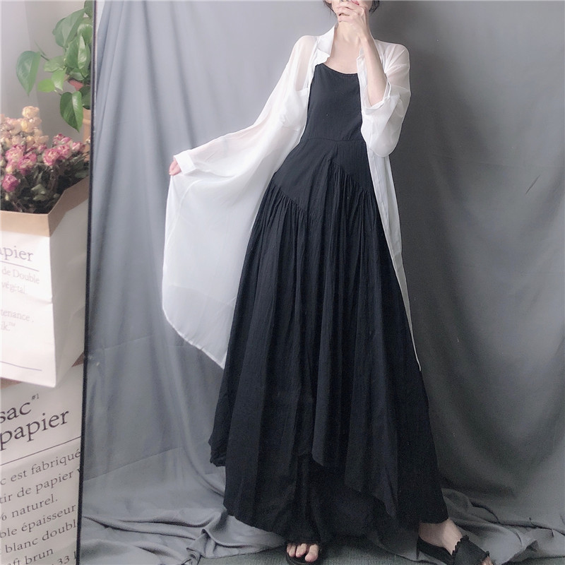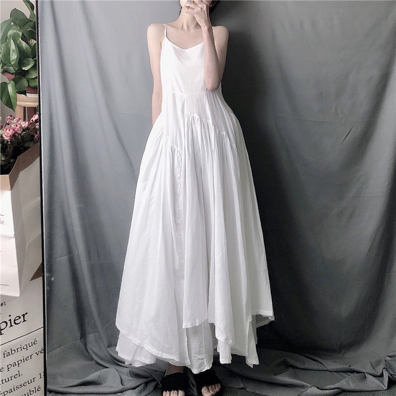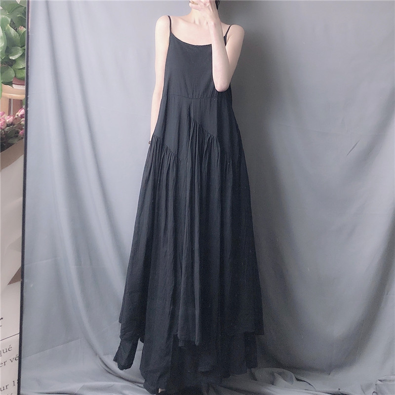 黑白超长不规则大摆吊带连衣裙女2024夏季新款文艺清新气质长裙子