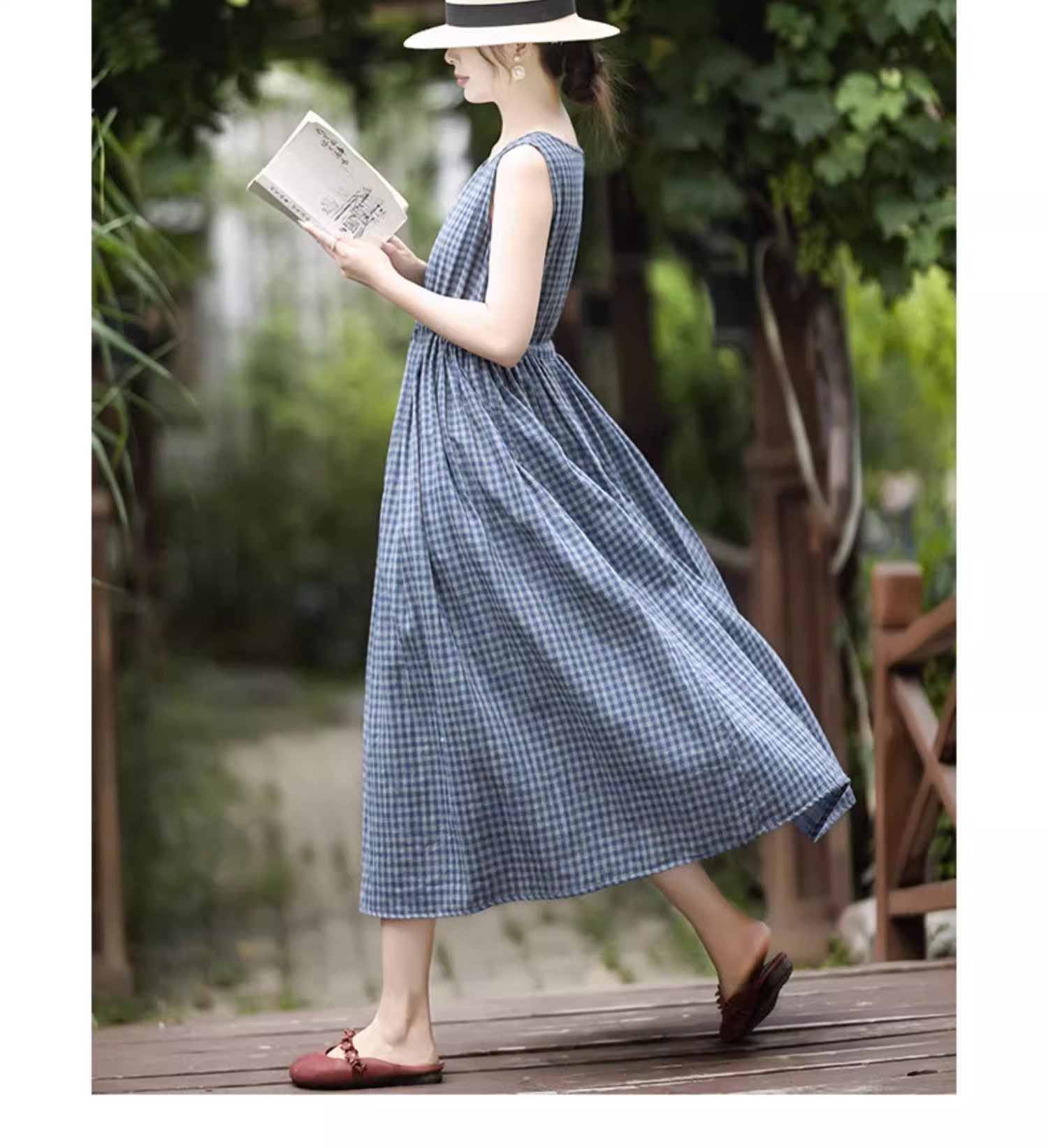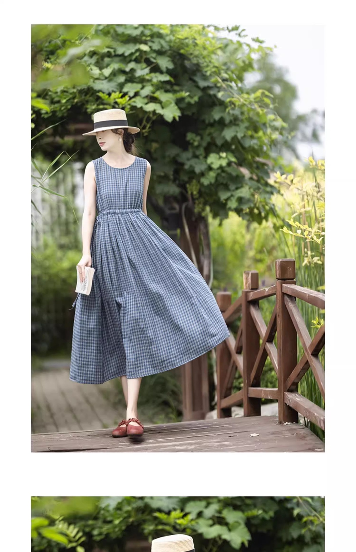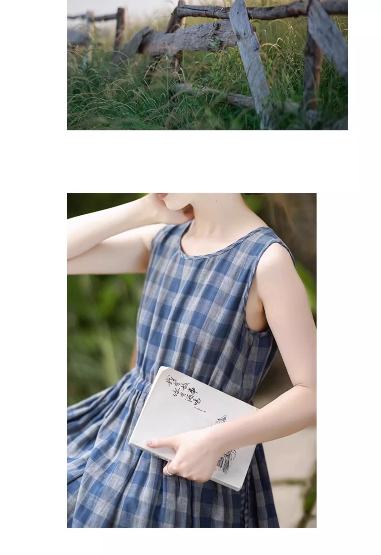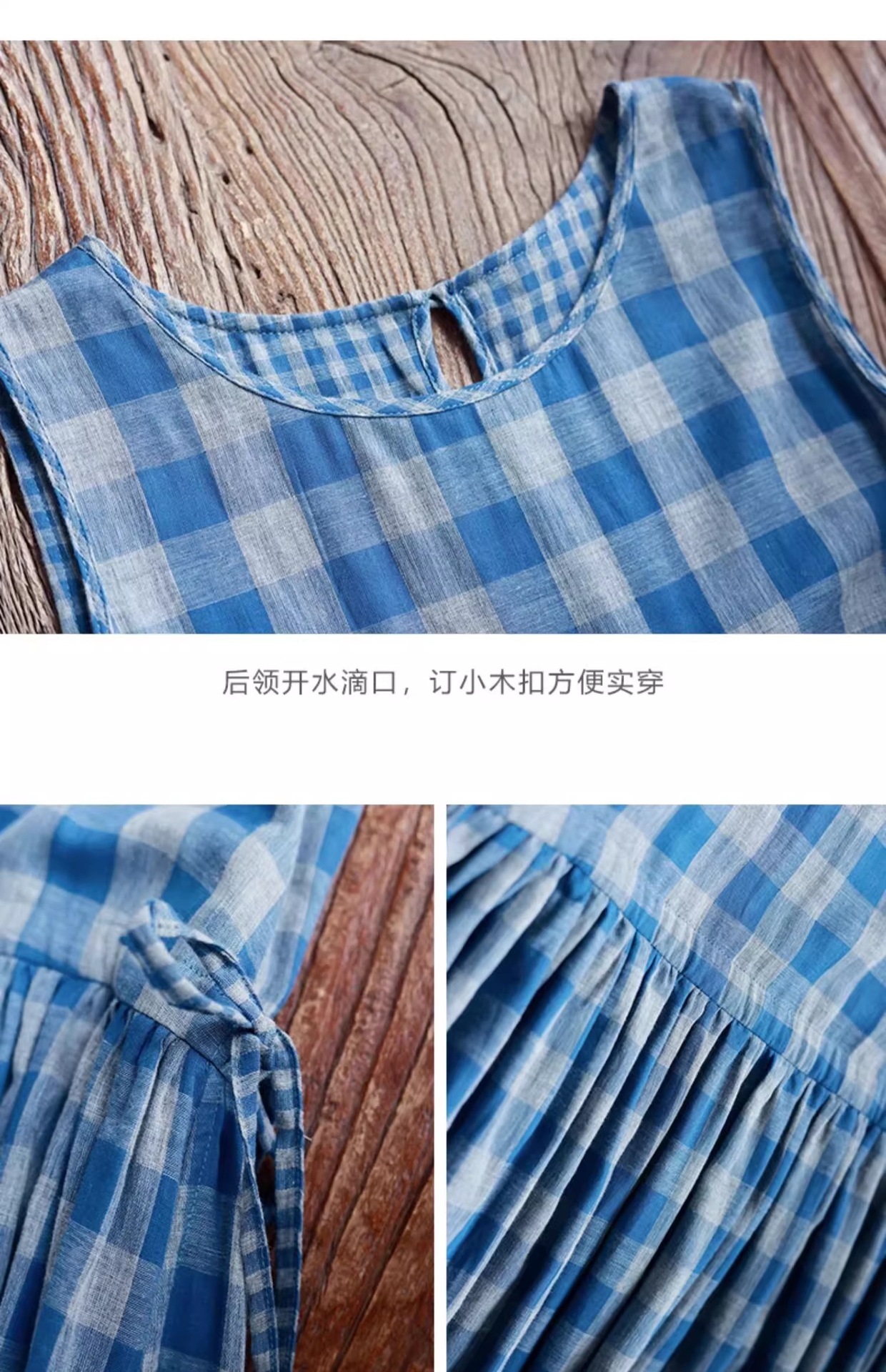 商品名称:2025夏季新款纯棉双层纱圆领格子长裙设计感小众文艺无袖连衣裙女