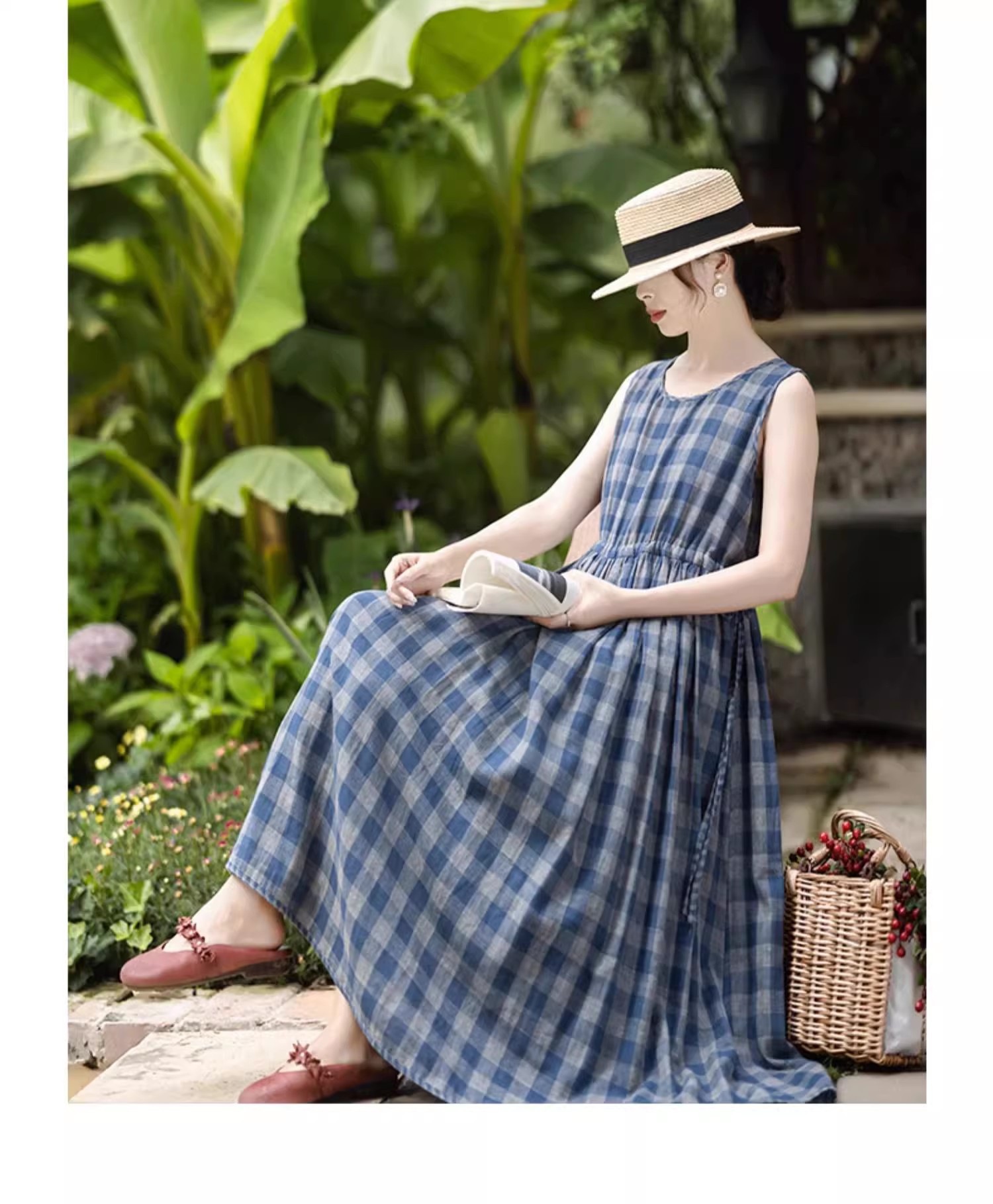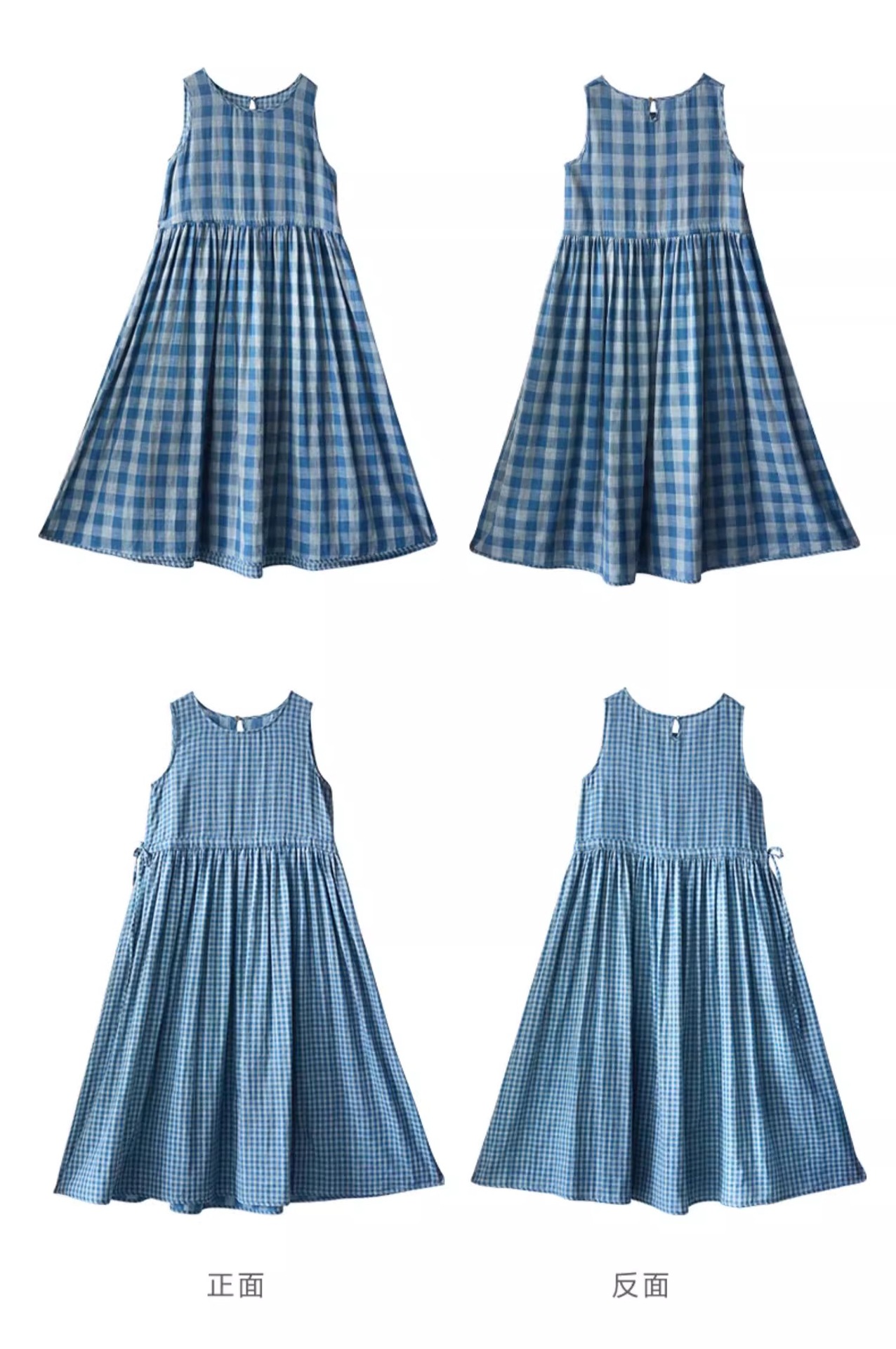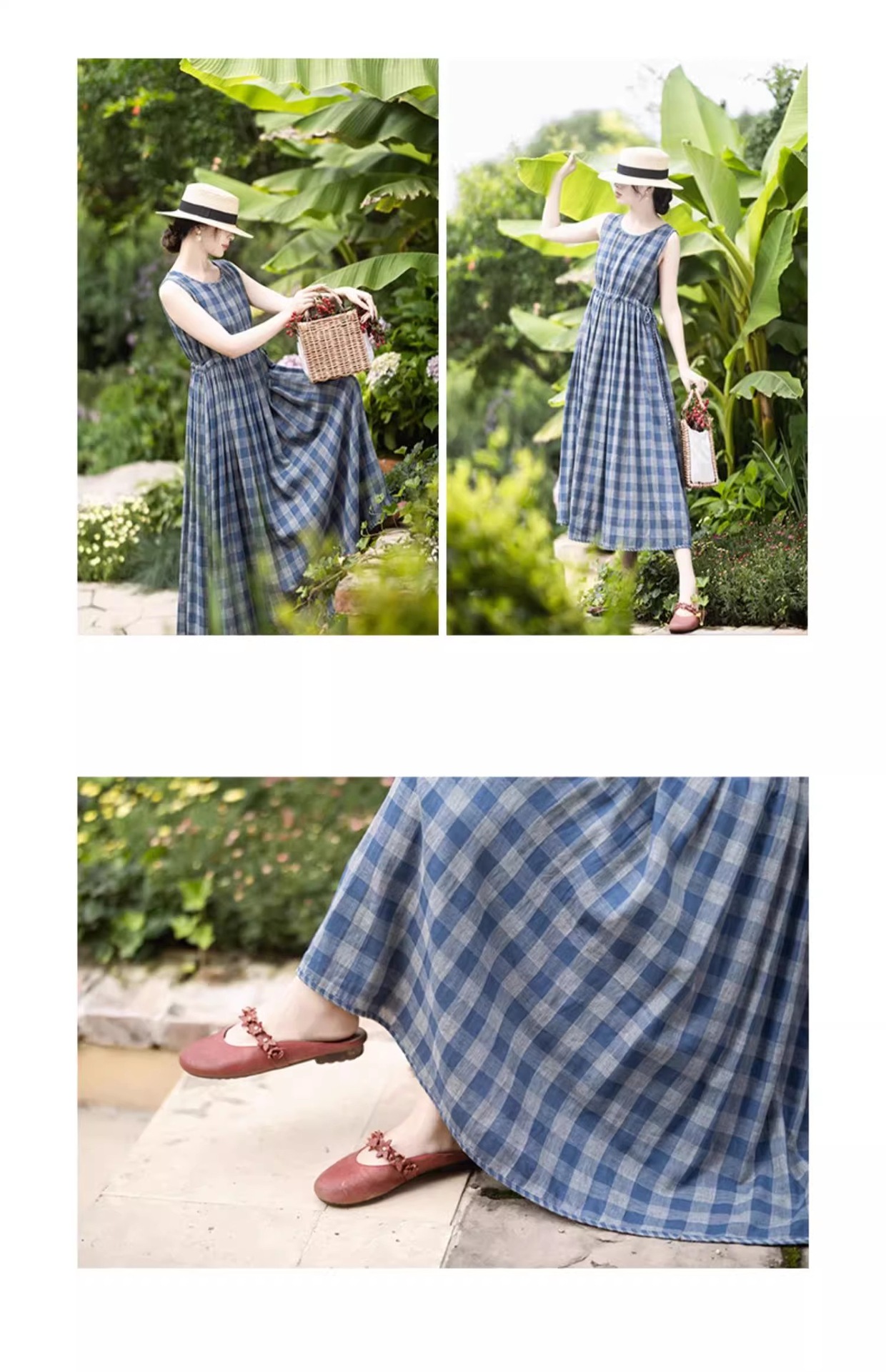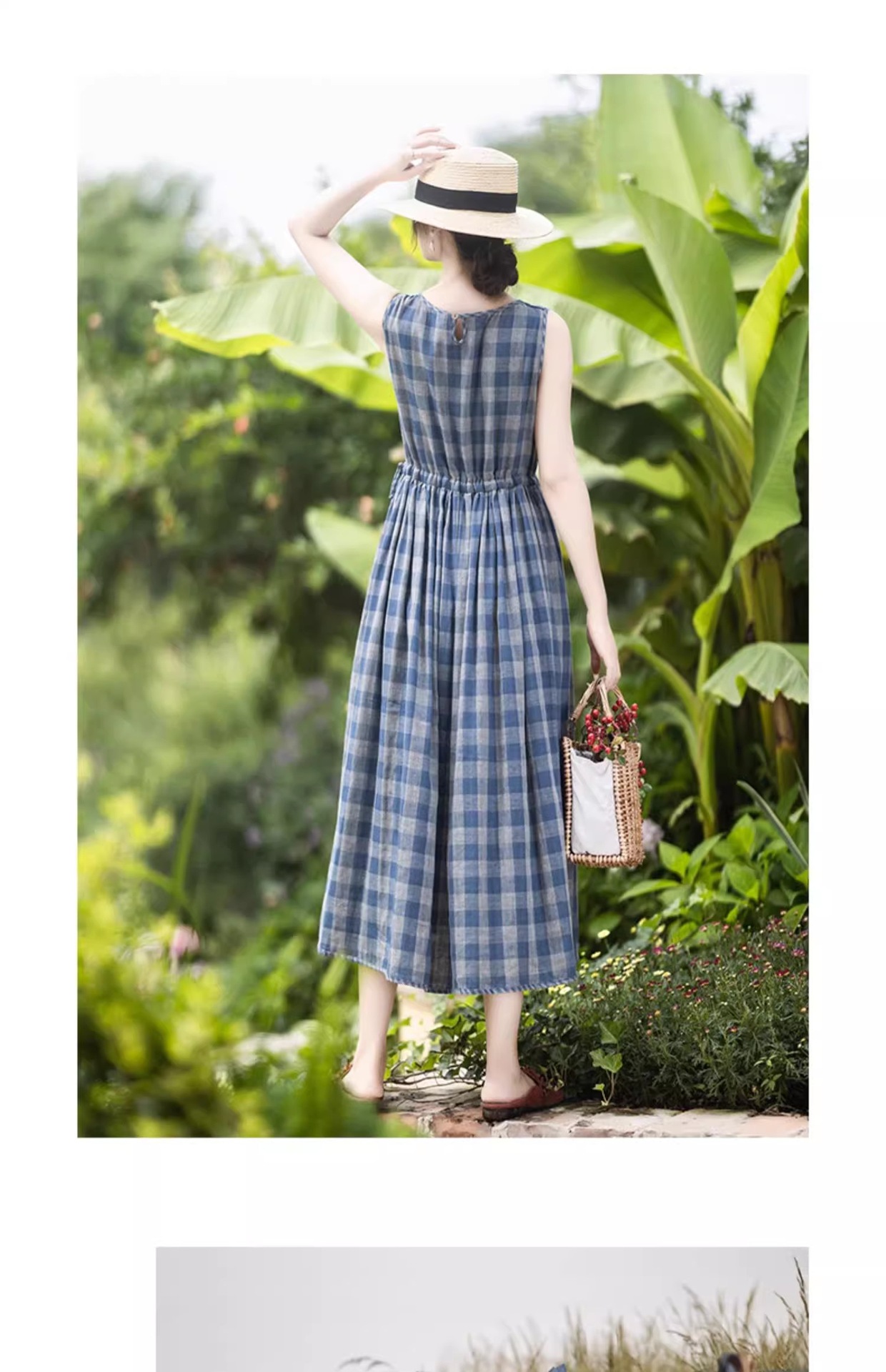 商品名称:2025夏季新款纯棉双层纱圆领格子长裙设计感小众文艺无袖连衣裙女