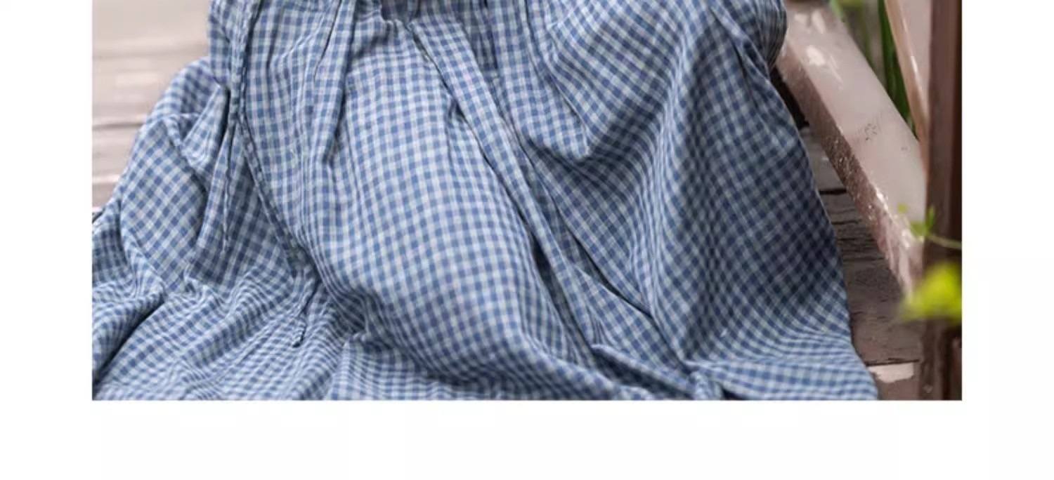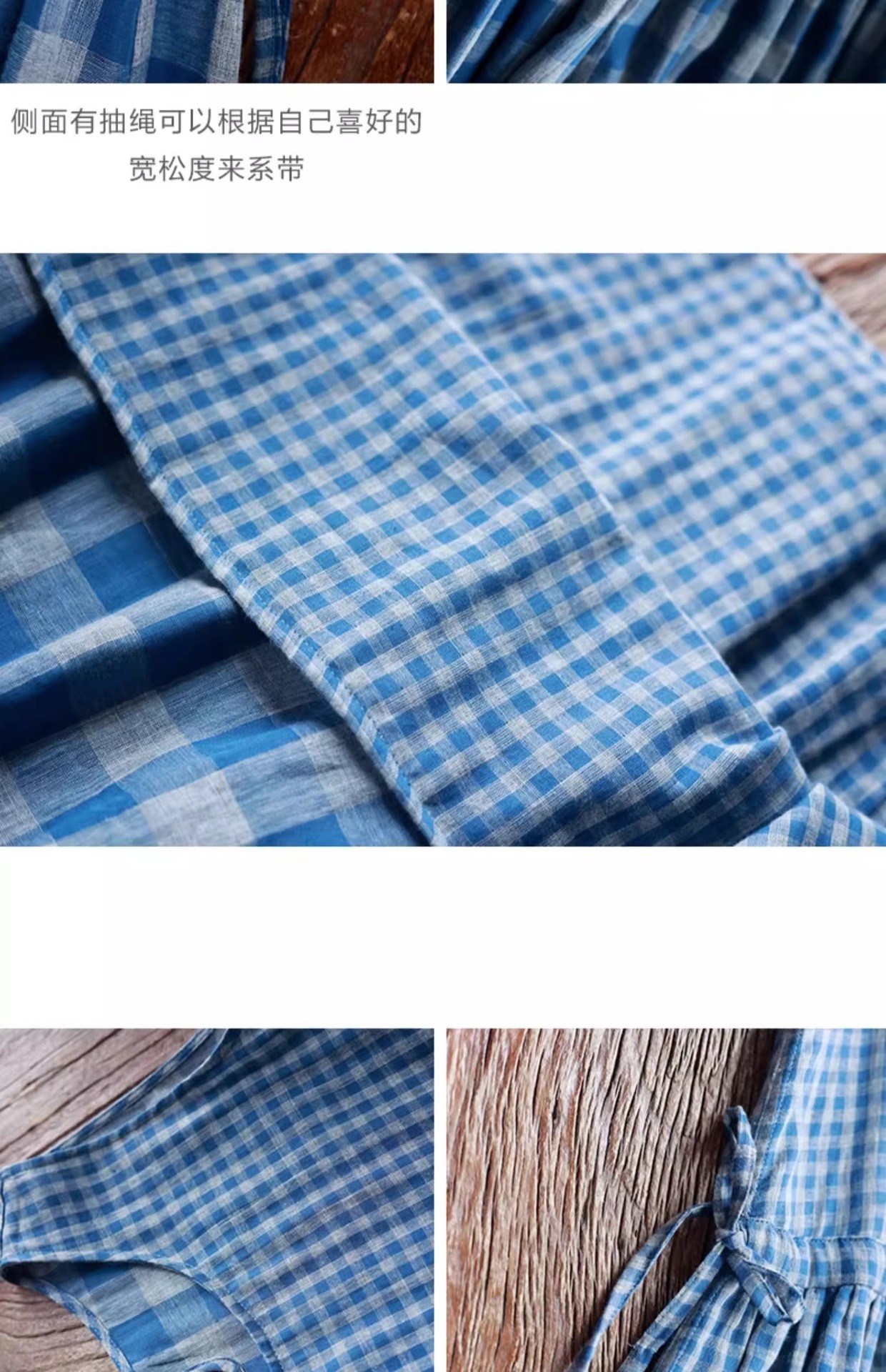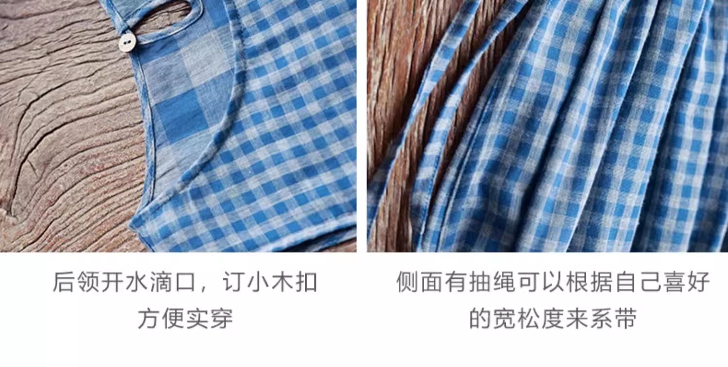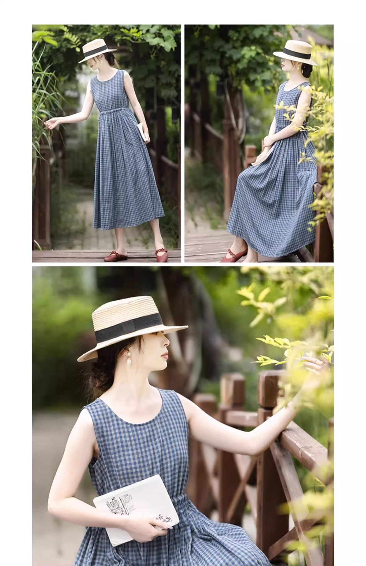 商品名称:2025夏季新款纯棉双层纱圆领格子长裙设计感小众文艺无袖连衣裙女