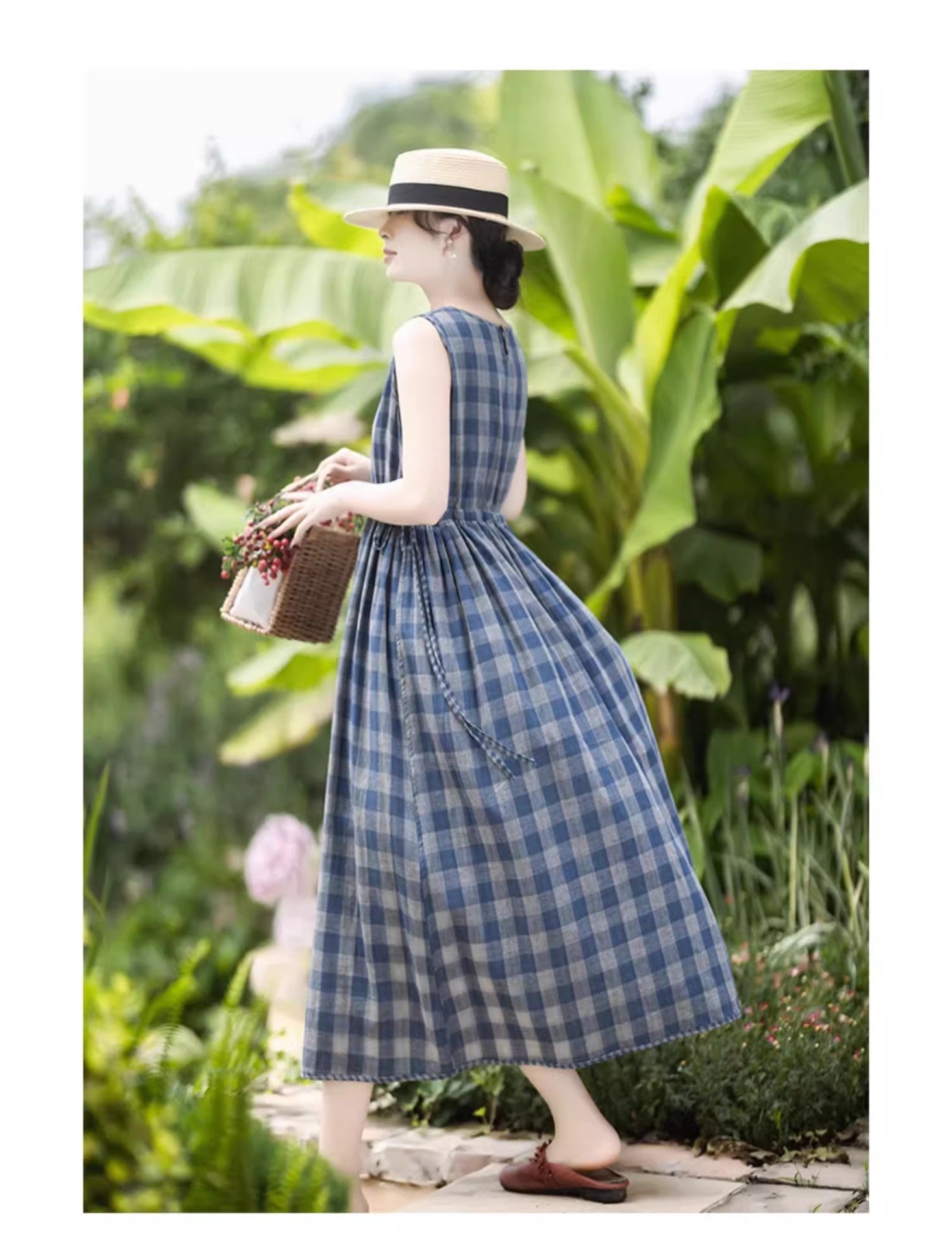 2025夏季新款纯棉双层纱圆领格子长裙设计感小众文艺无袖连衣裙女