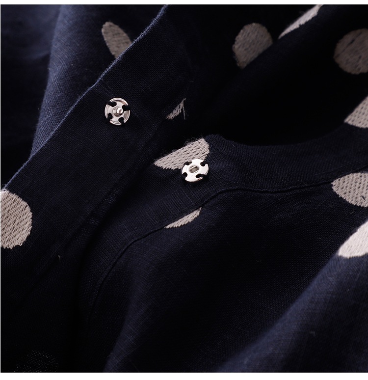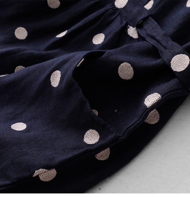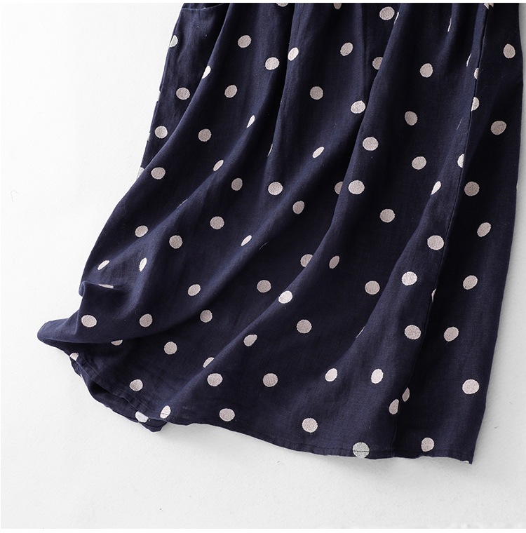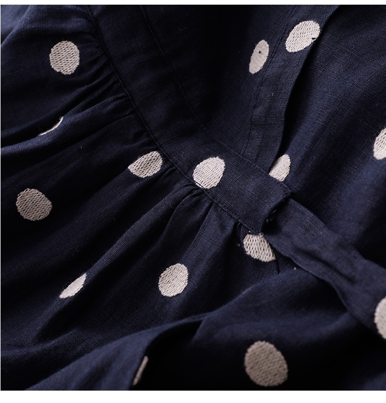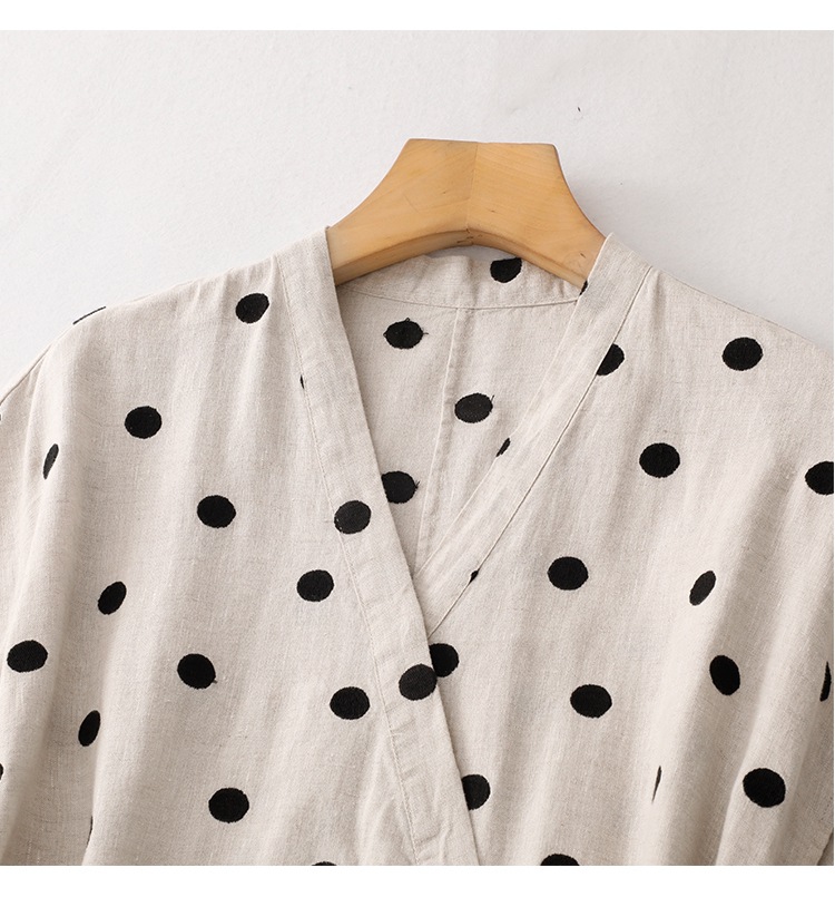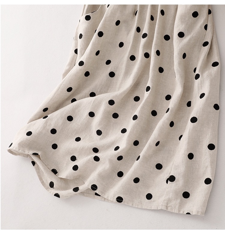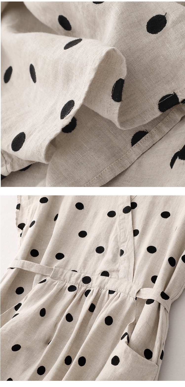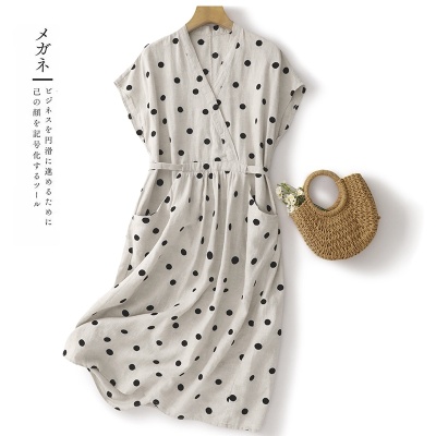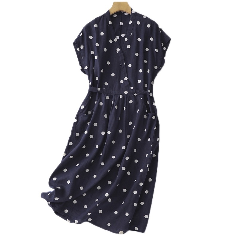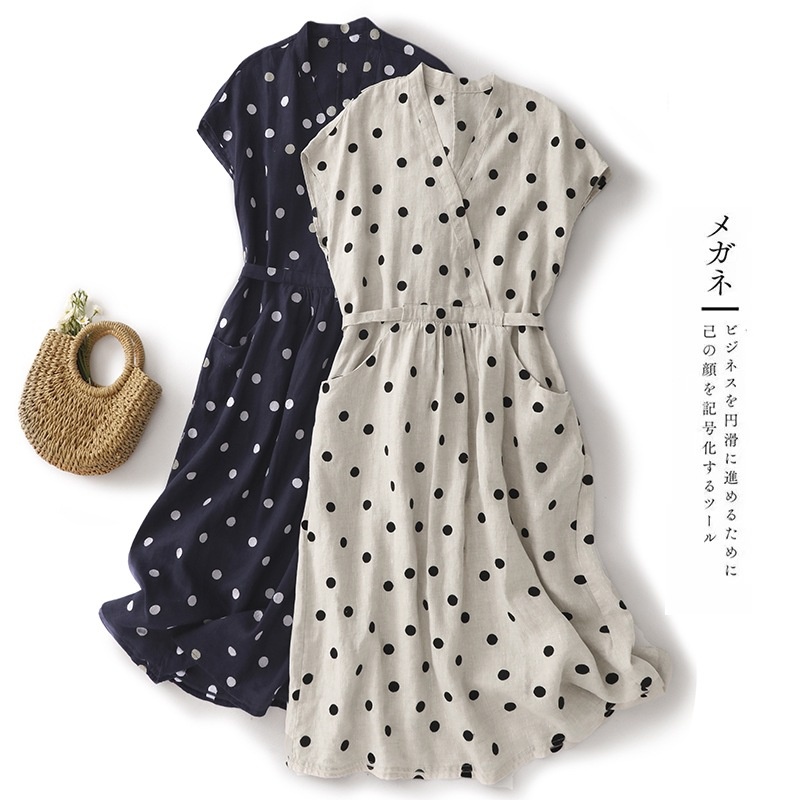 棉麻波点连衣裙女夏新款复古V领收腰显瘦气质中长裙A字裙