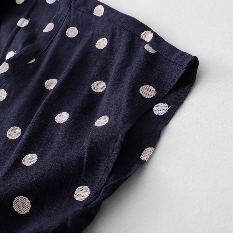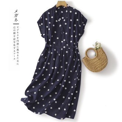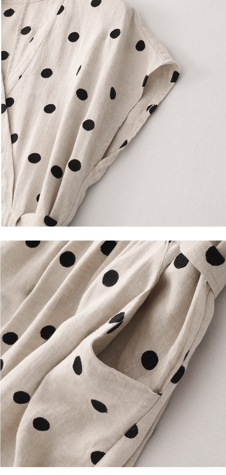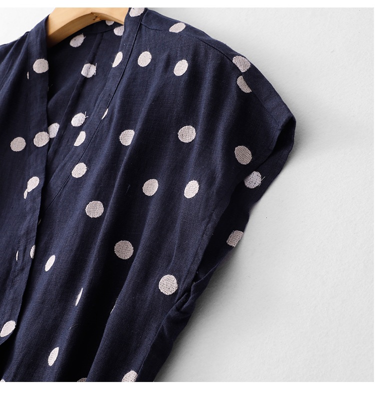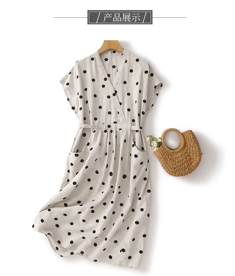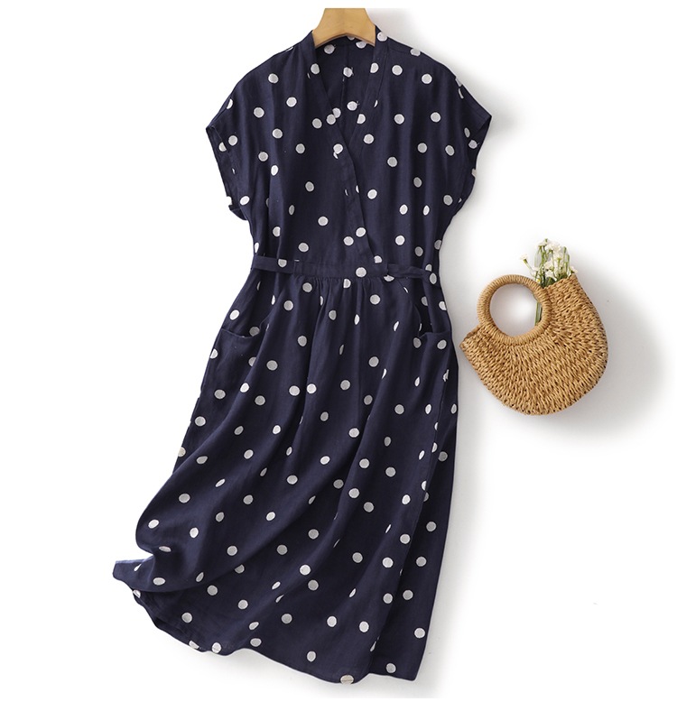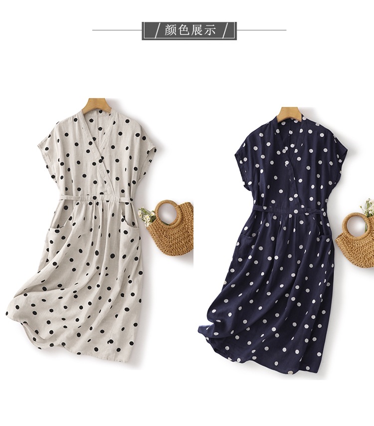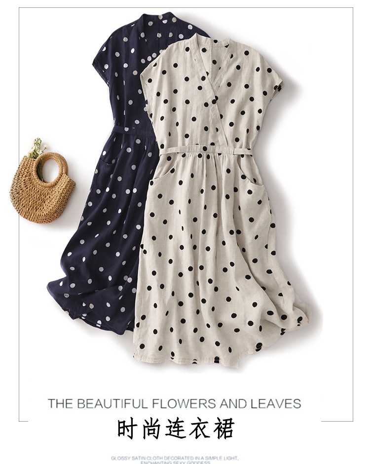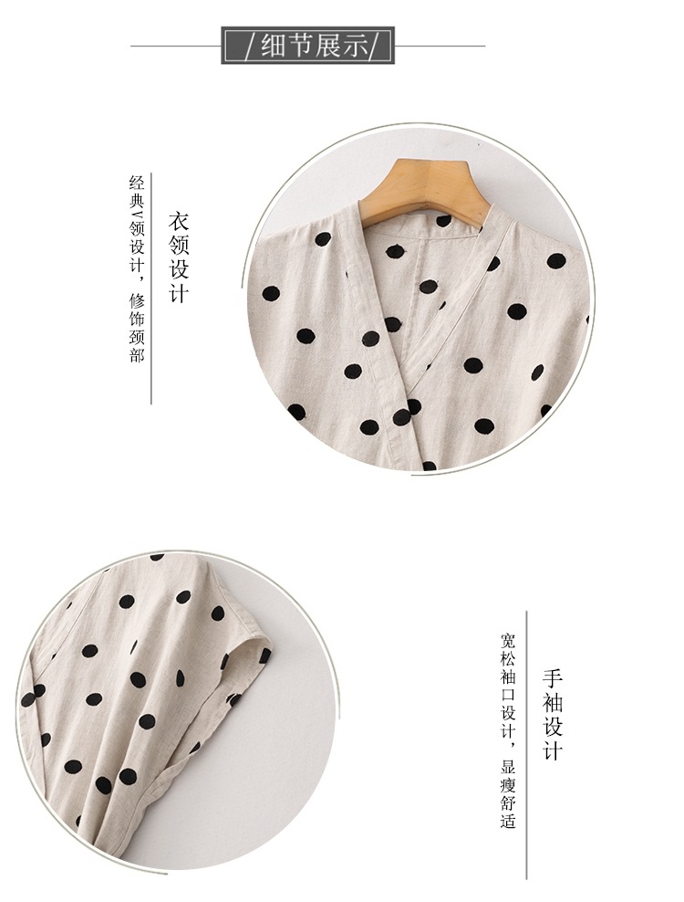 商品名称:棉麻波点连衣裙女夏新款复古V领收腰显瘦气质中长裙A字裙
