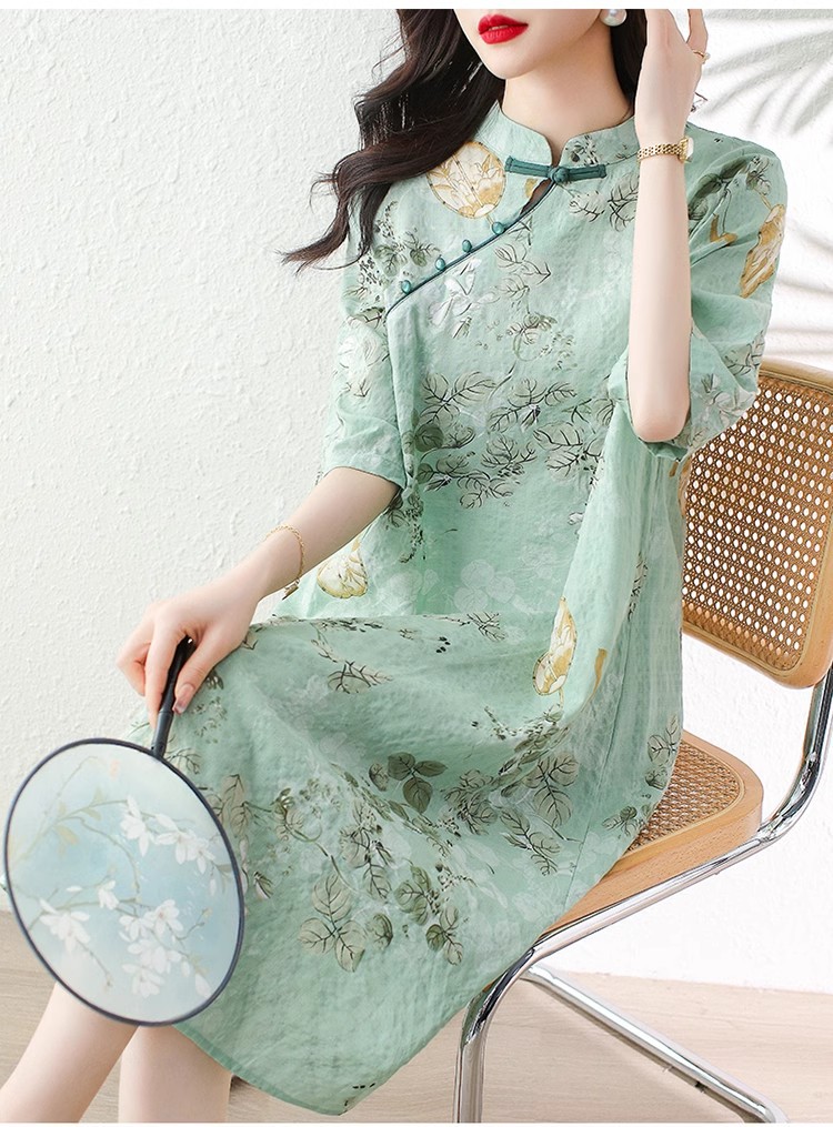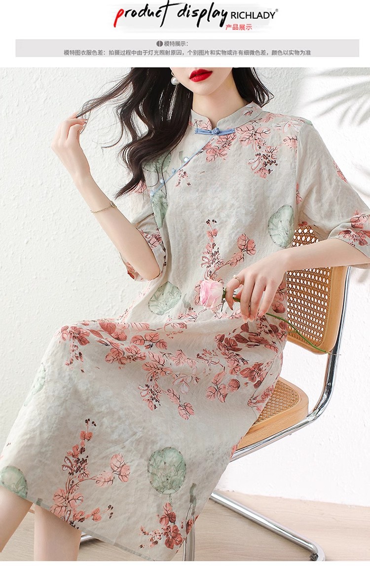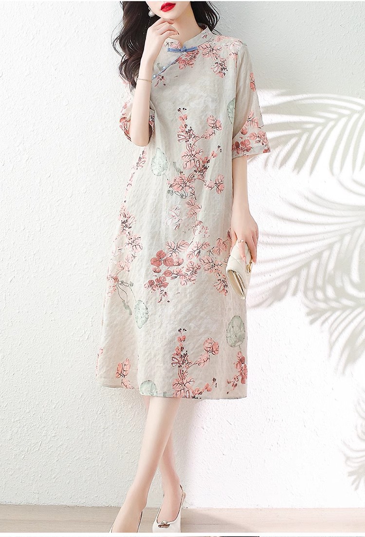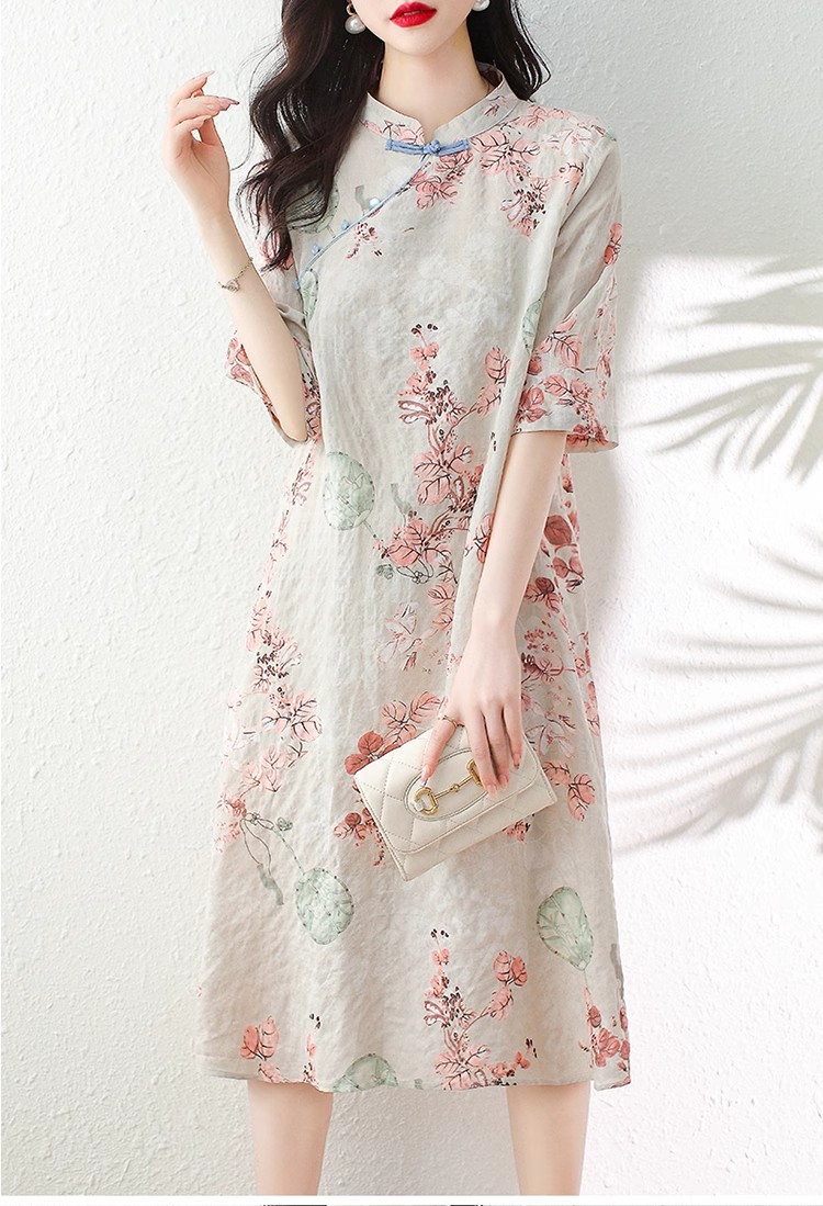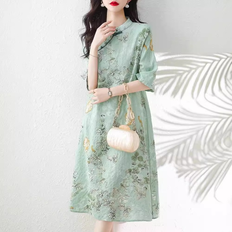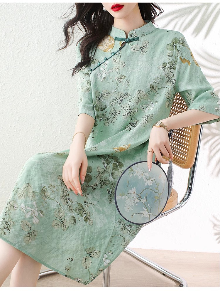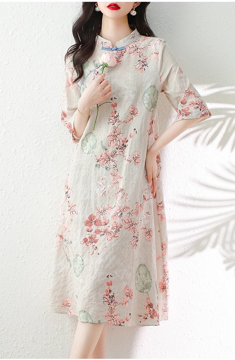 2024夏季新款气质复古印花国风斜襟立领棉质连衣裙改良旗袍长裙女