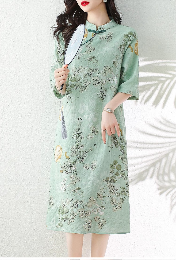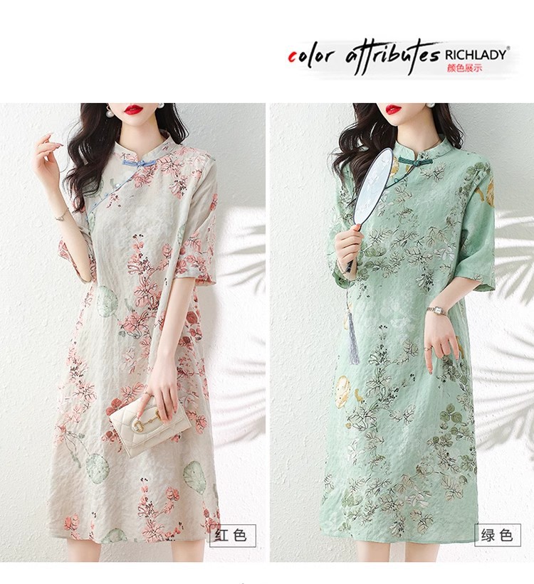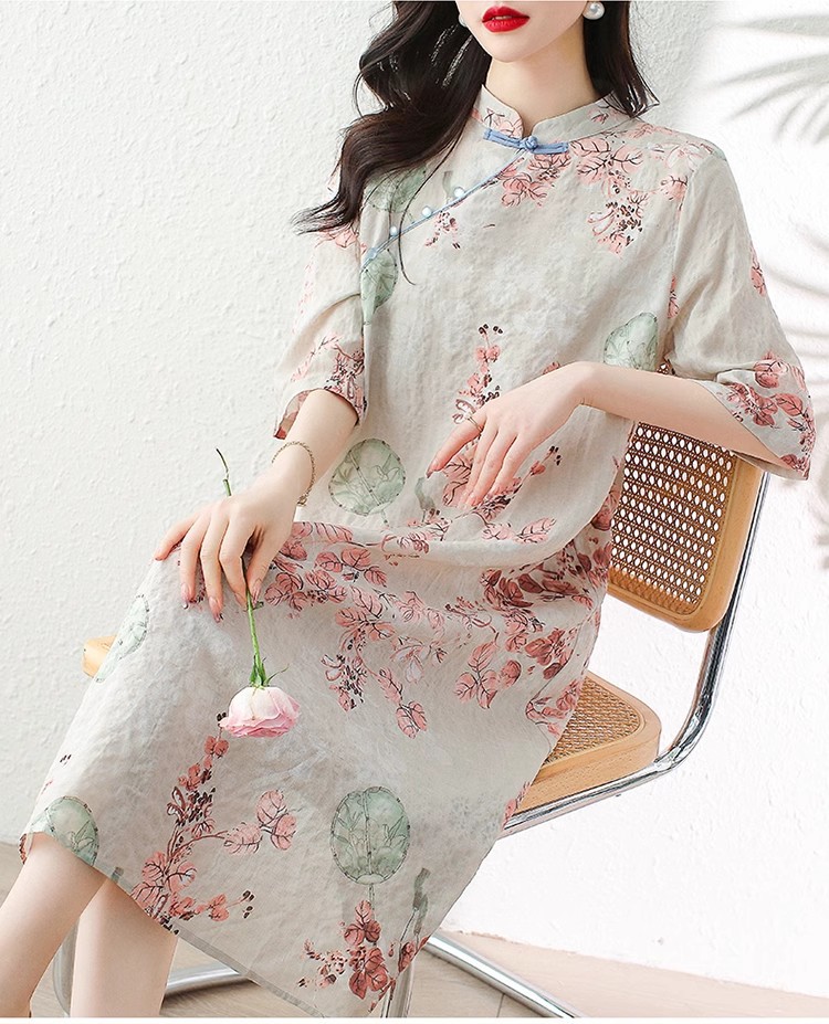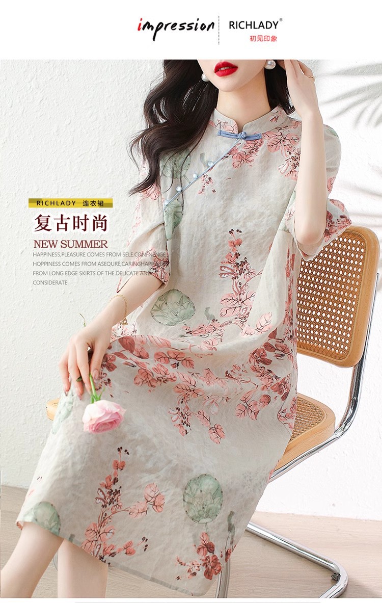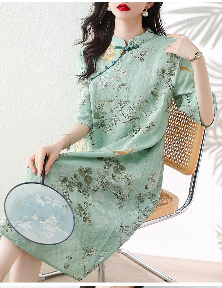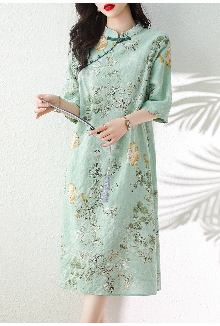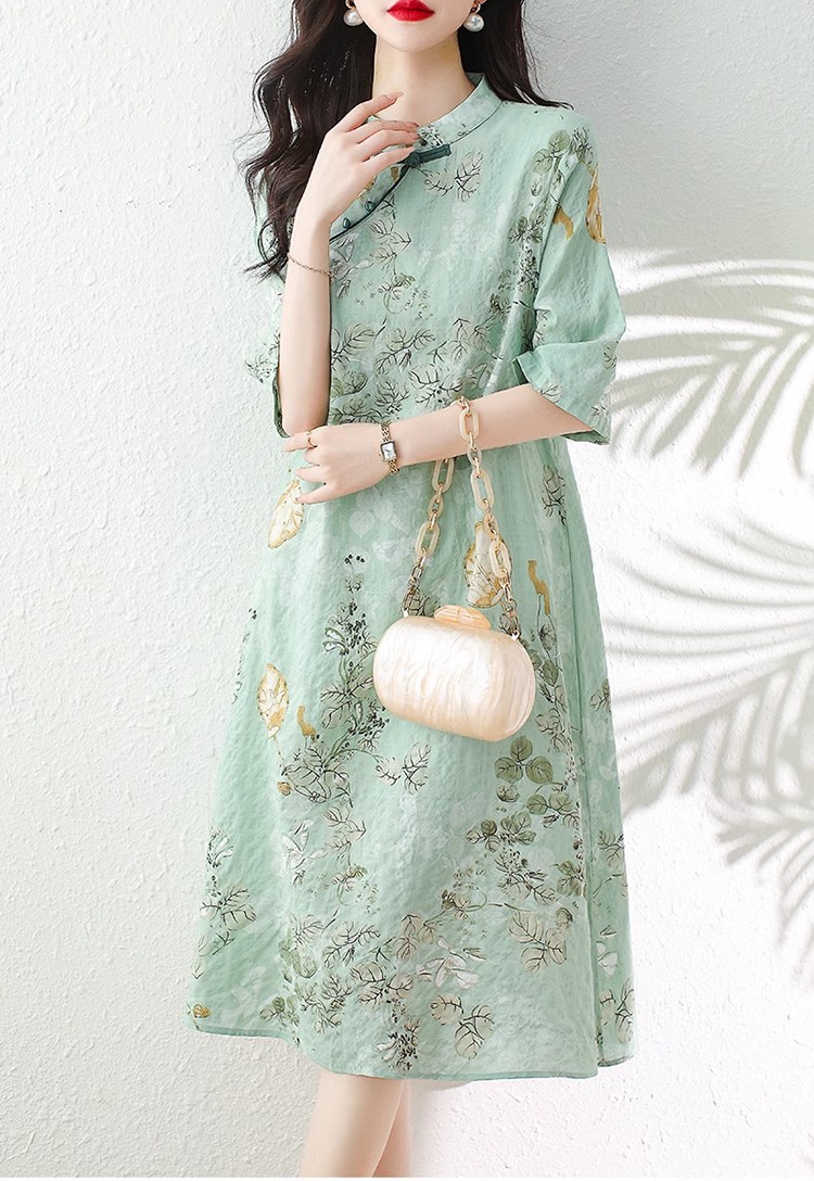 2024夏季新款气质复古印花国风斜襟立领棉质连衣裙改良旗袍长裙女
