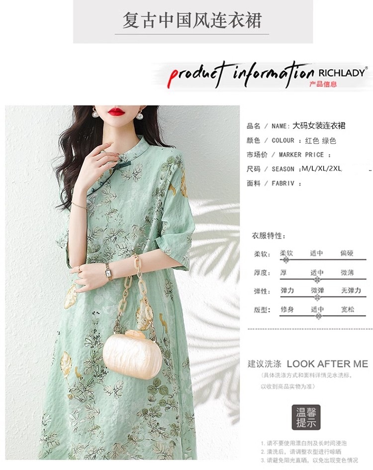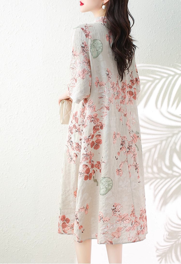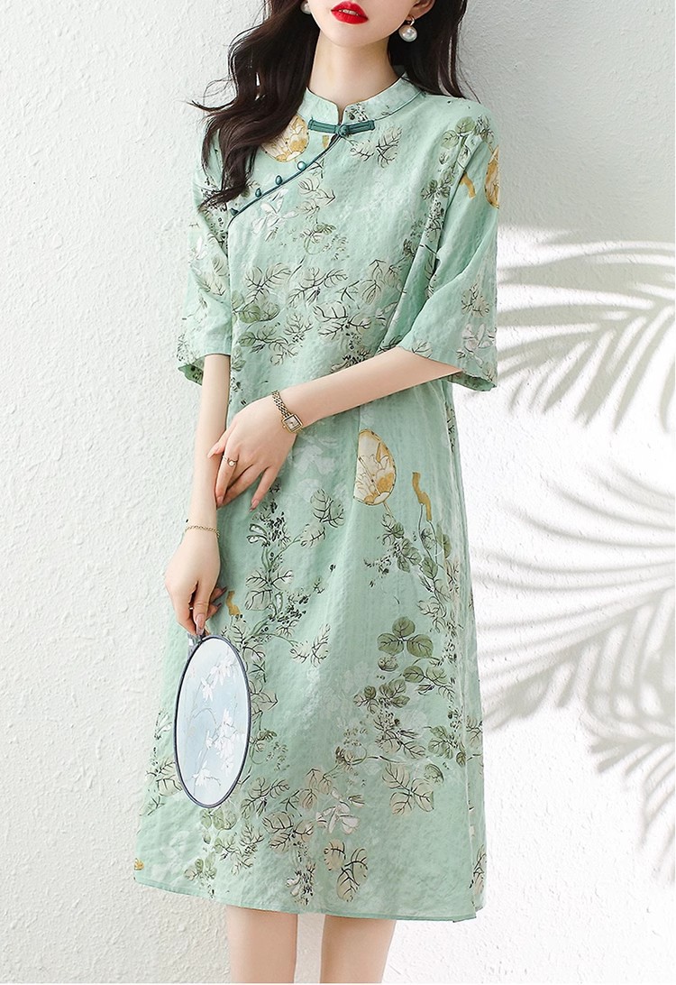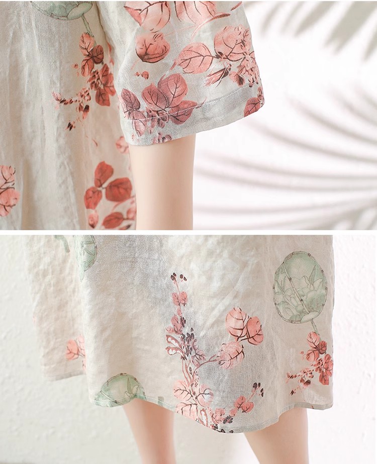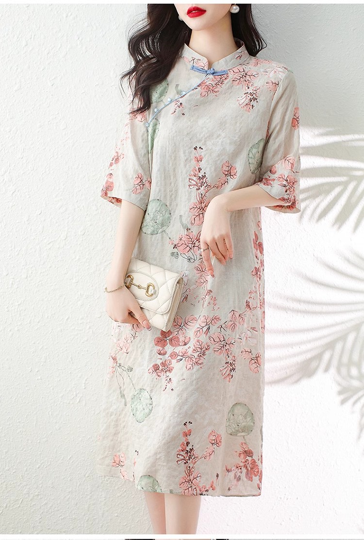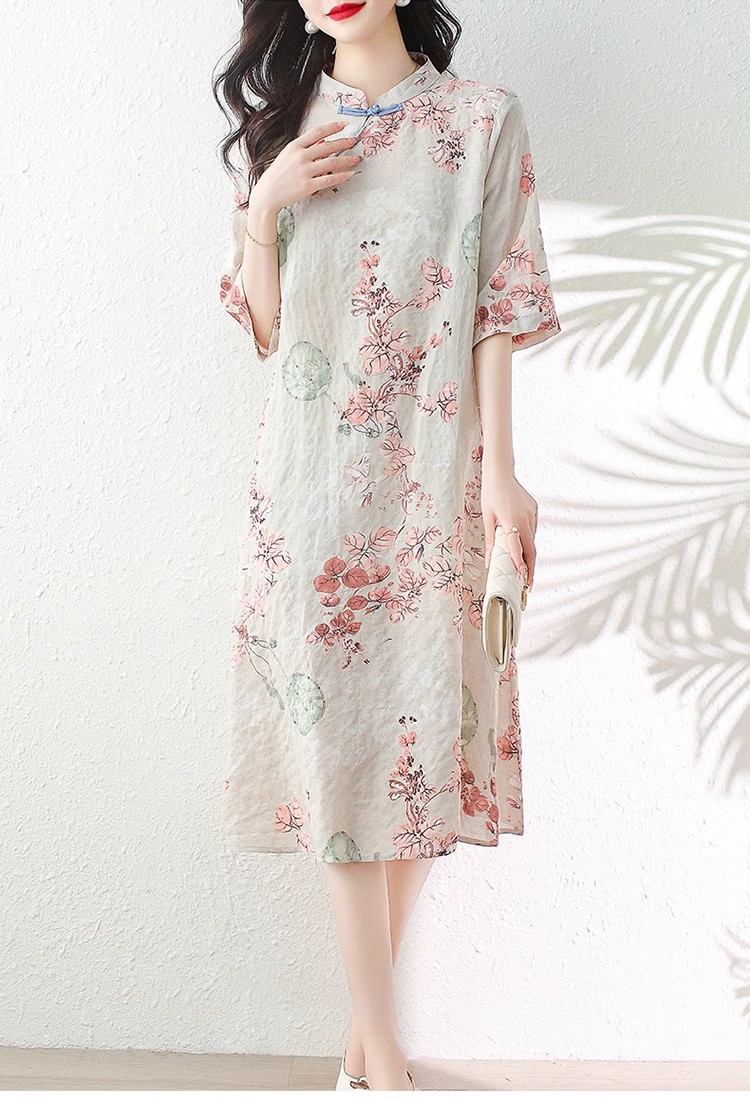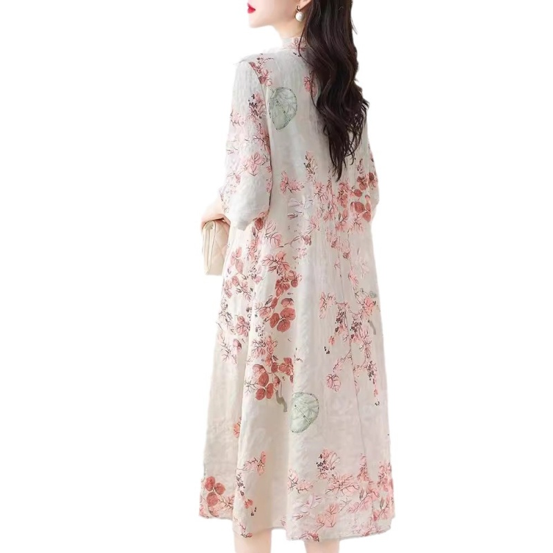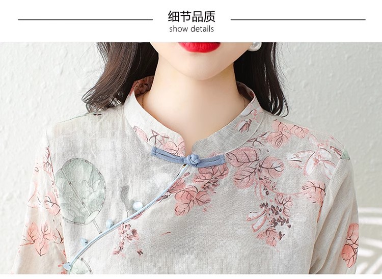 2024夏季新款气质复古印花国风斜襟立领棉质连衣裙改良旗袍长裙女