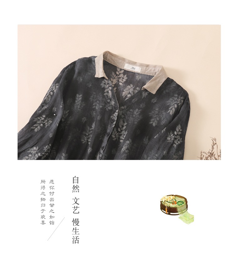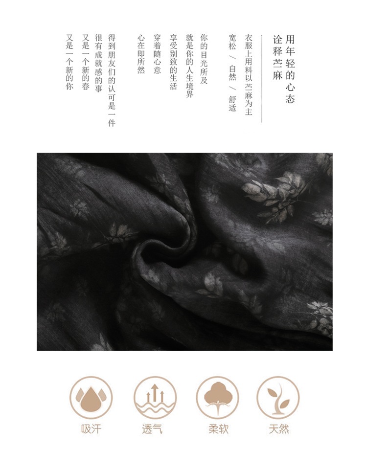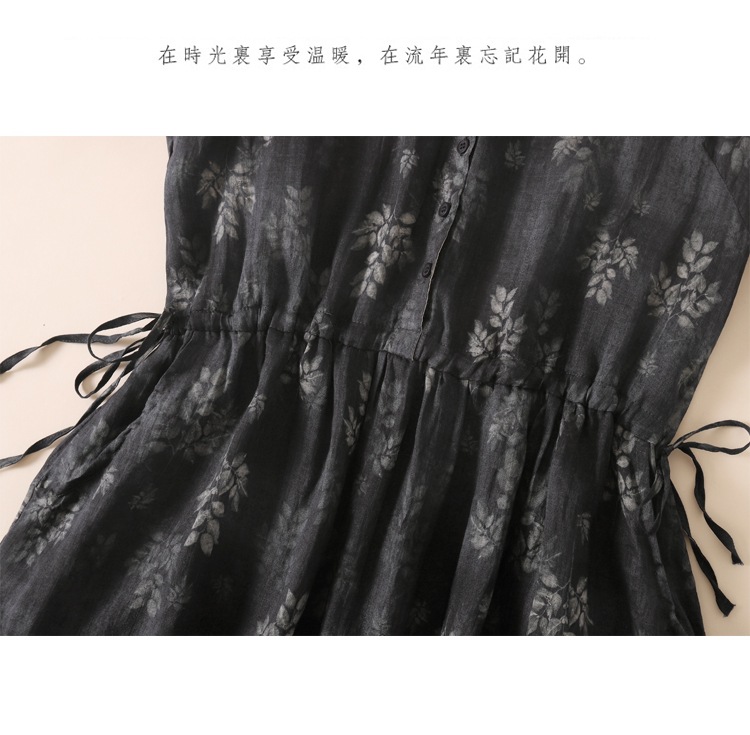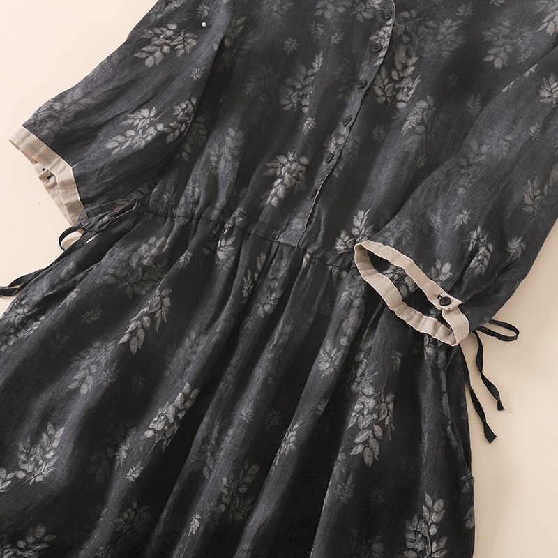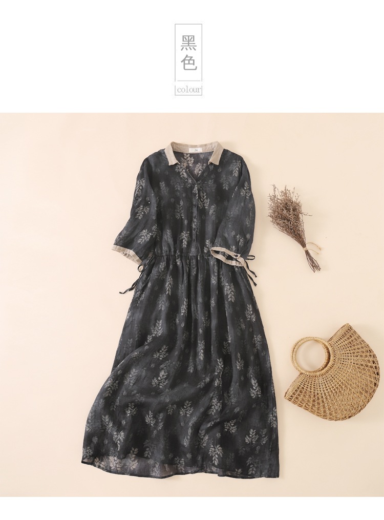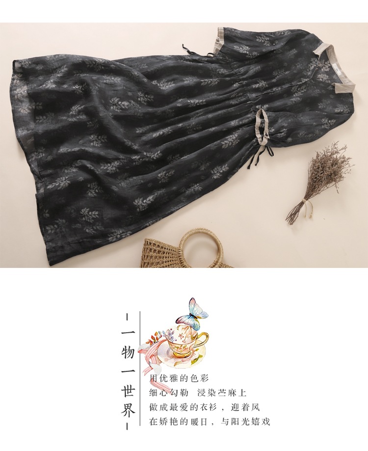 2025春新款印花翻领薄款棉麻衬衫裙女宽松大码收腰显瘦短袖连衣裙