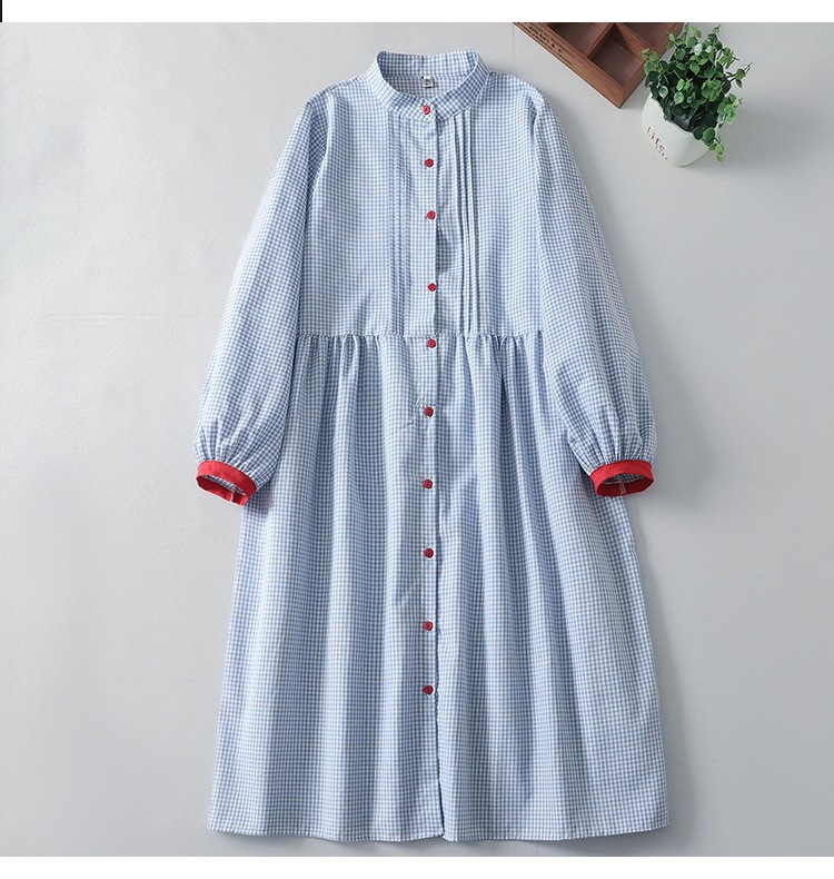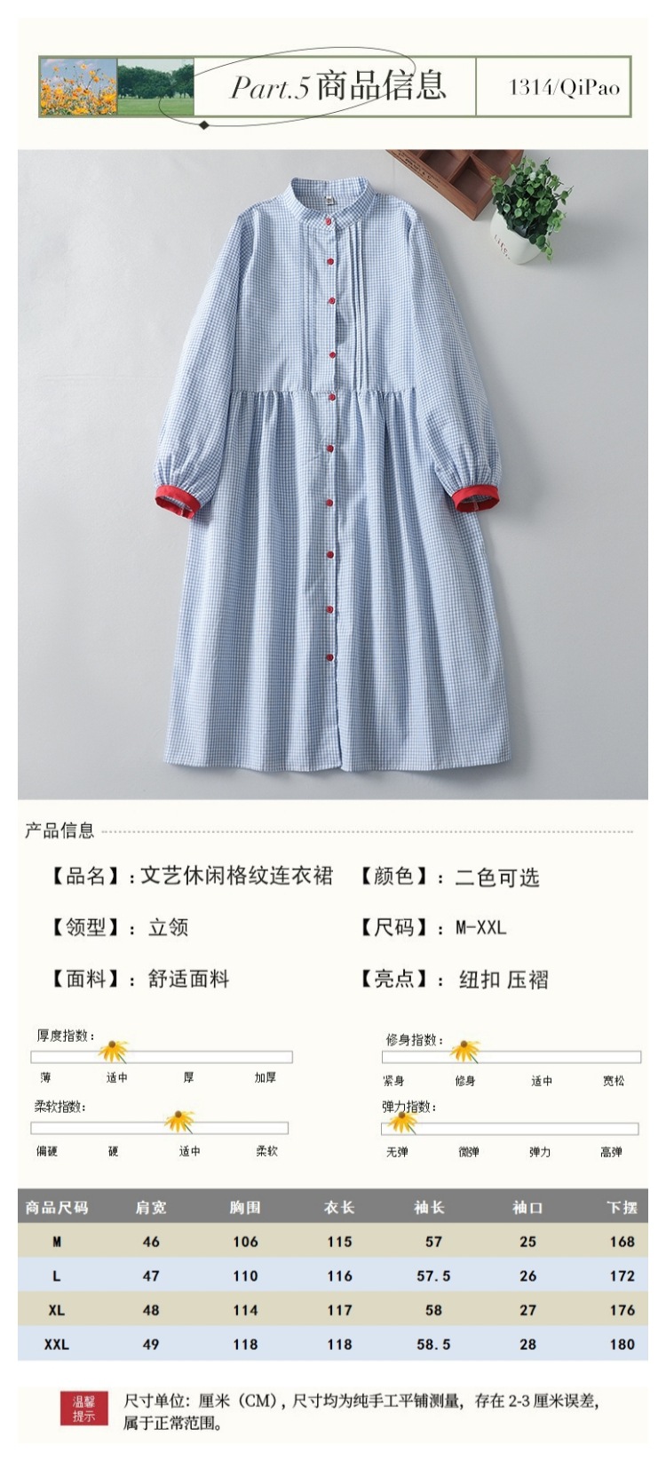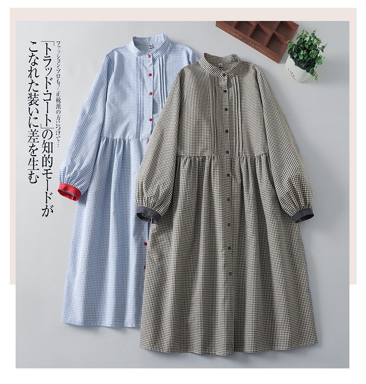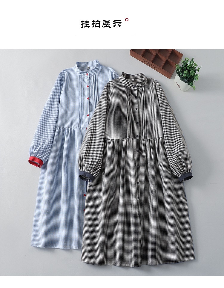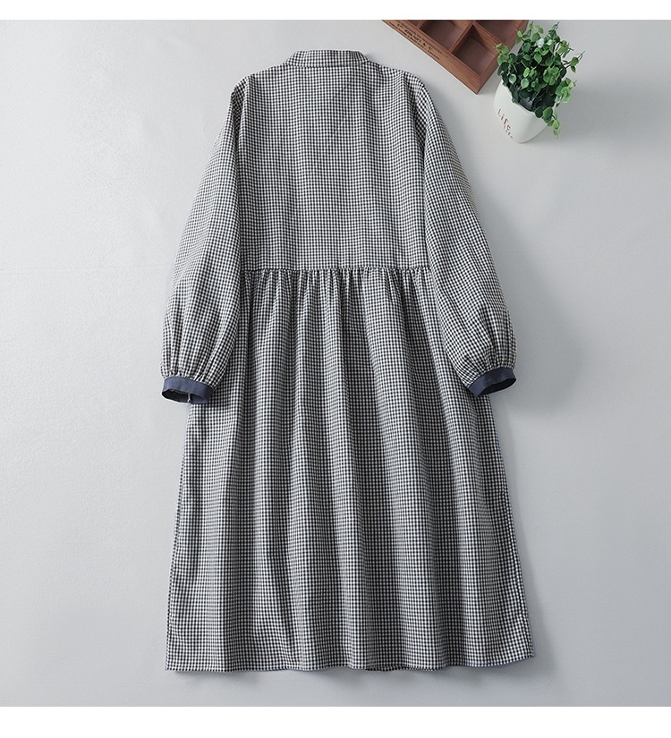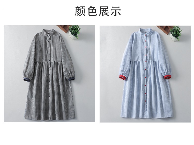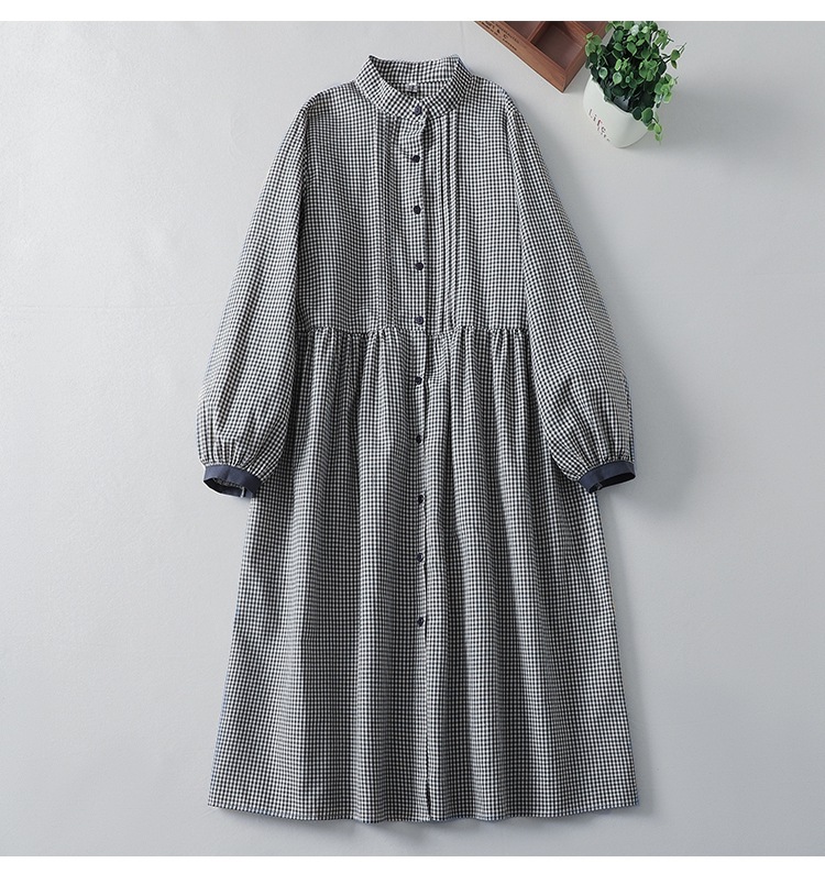 2025春季新款日系文艺格子长袖衬衫连衣裙女宽松显瘦立领棉麻长裙