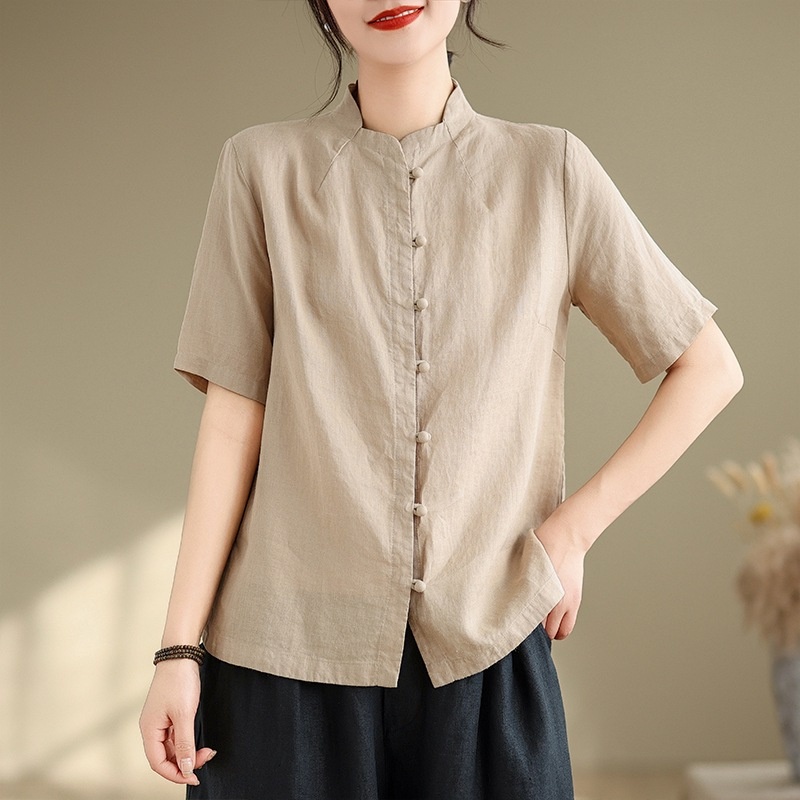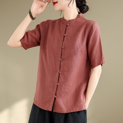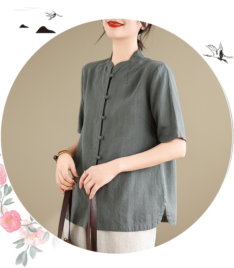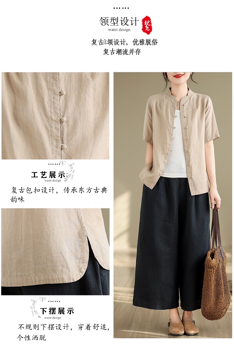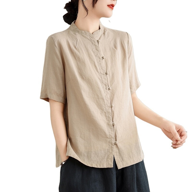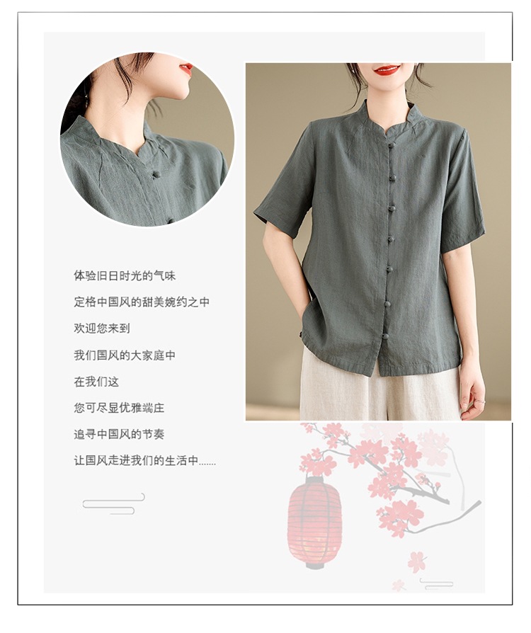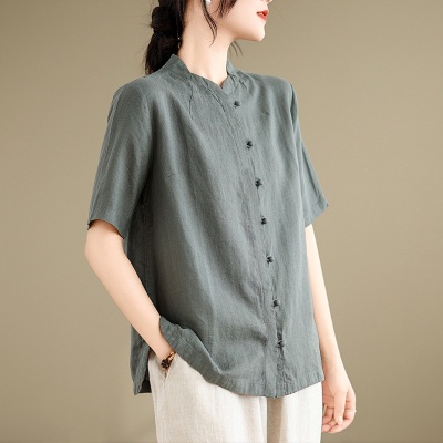 新中式复古禅意单排扣棉麻短袖衬衫女简约设计感小众盘扣开衫上衣