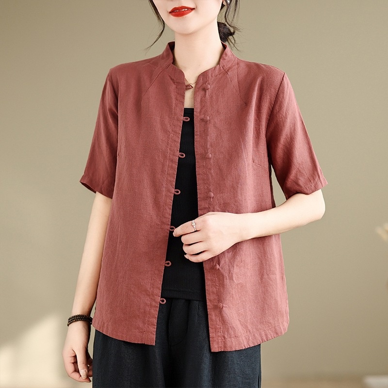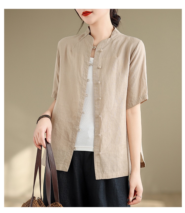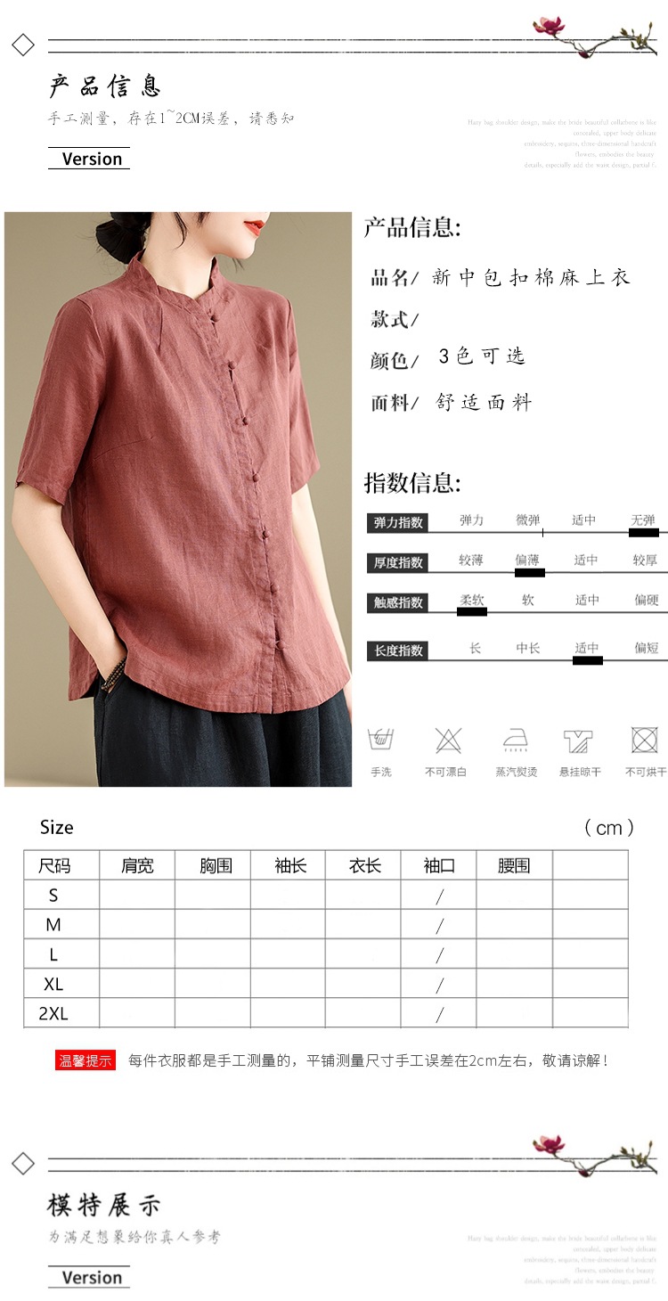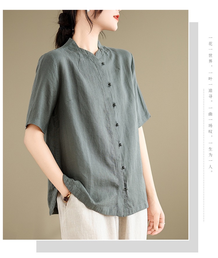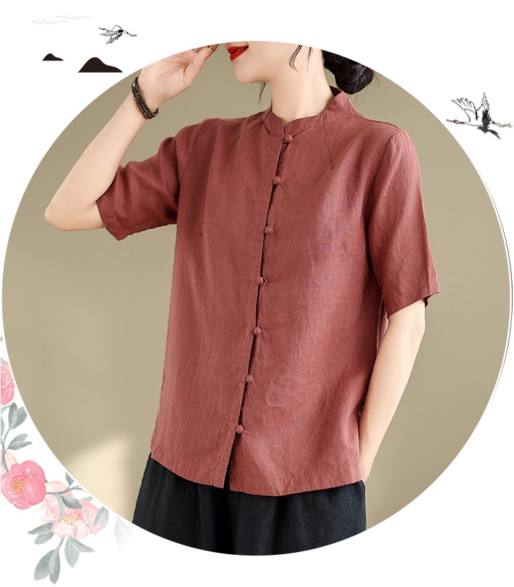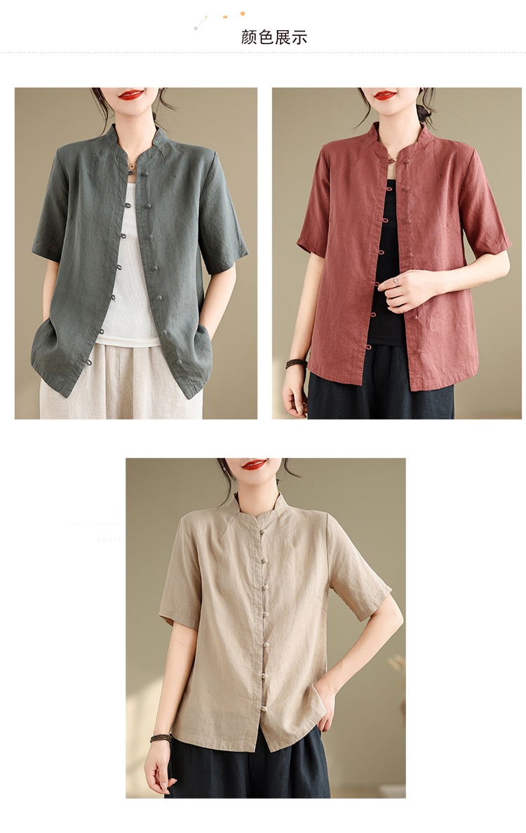 新中式复古禅意单排扣棉麻短袖衬衫女简约设计感小众盘扣开衫上衣