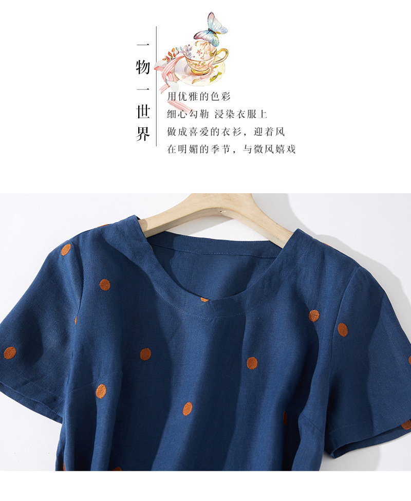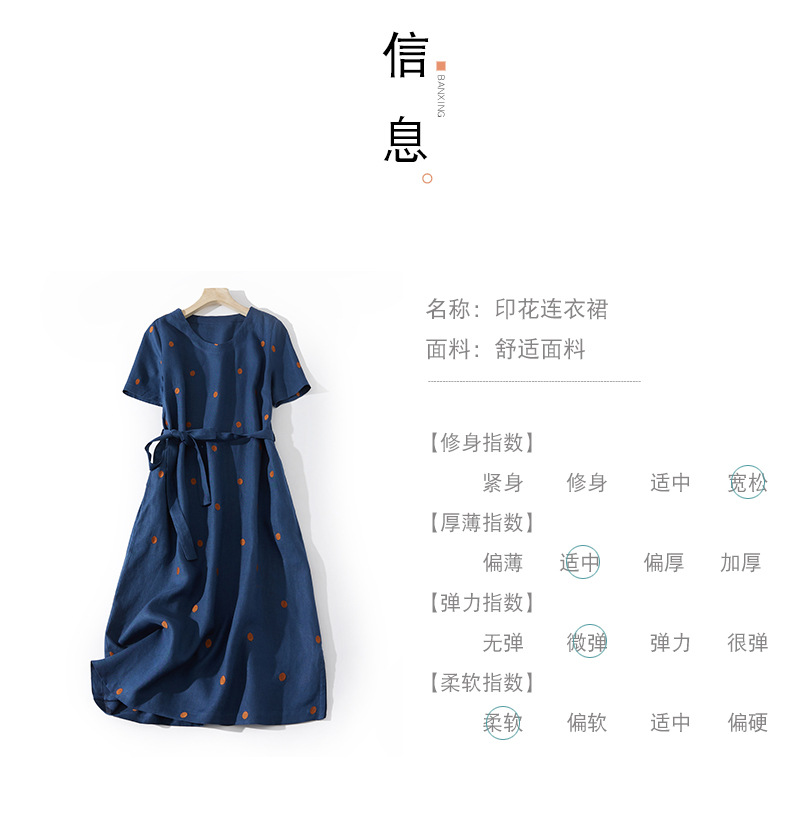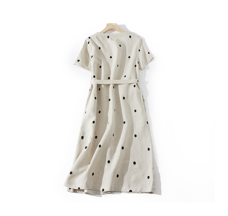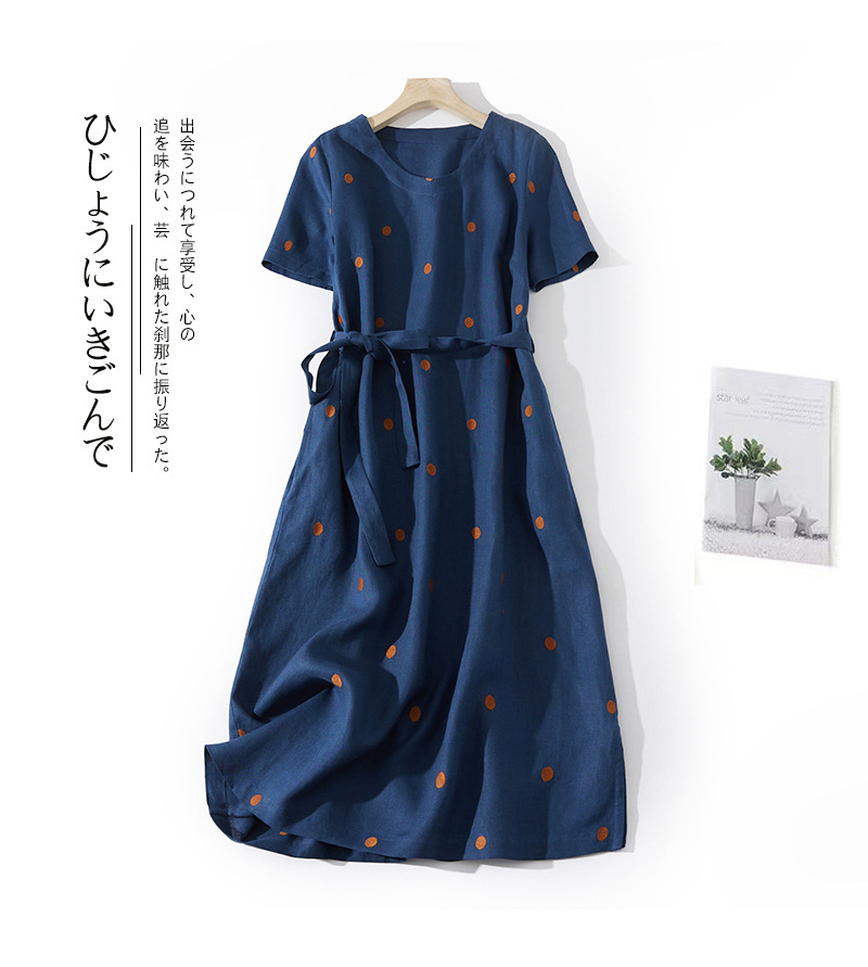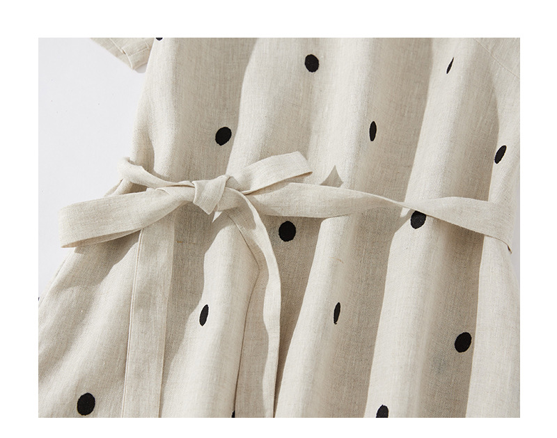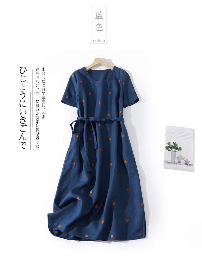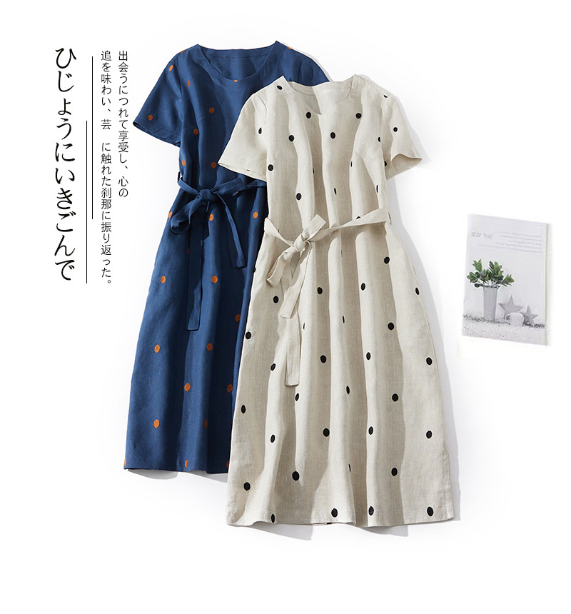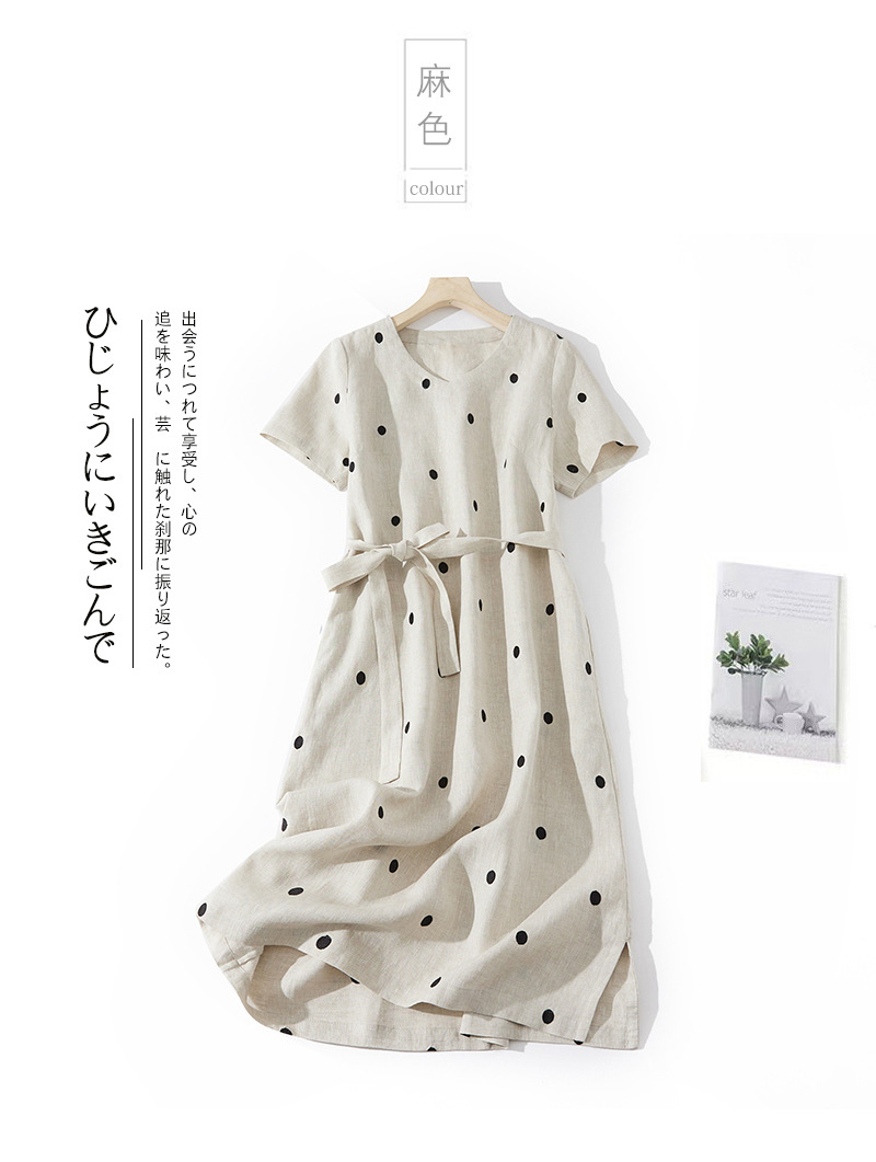 2024夏新款棉麻印花文艺波点小个子中长连衣裙系带收腰显瘦短袖裙