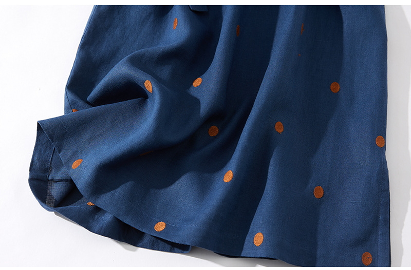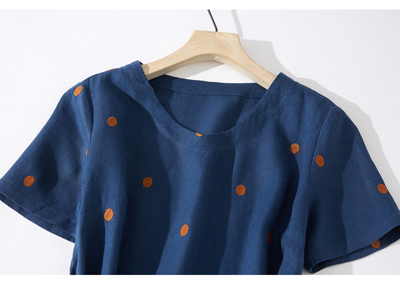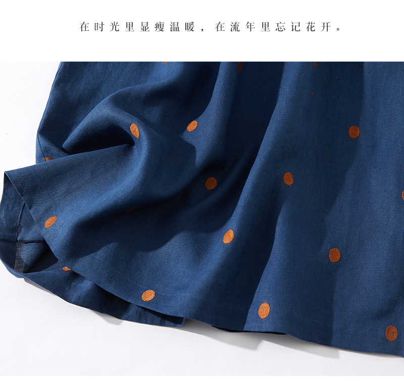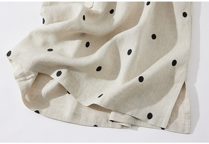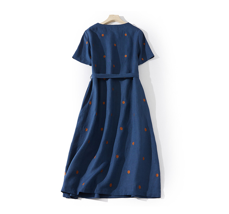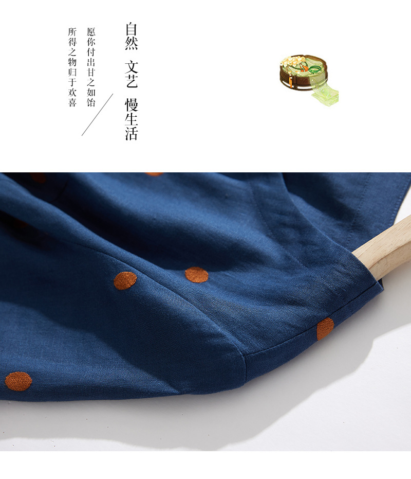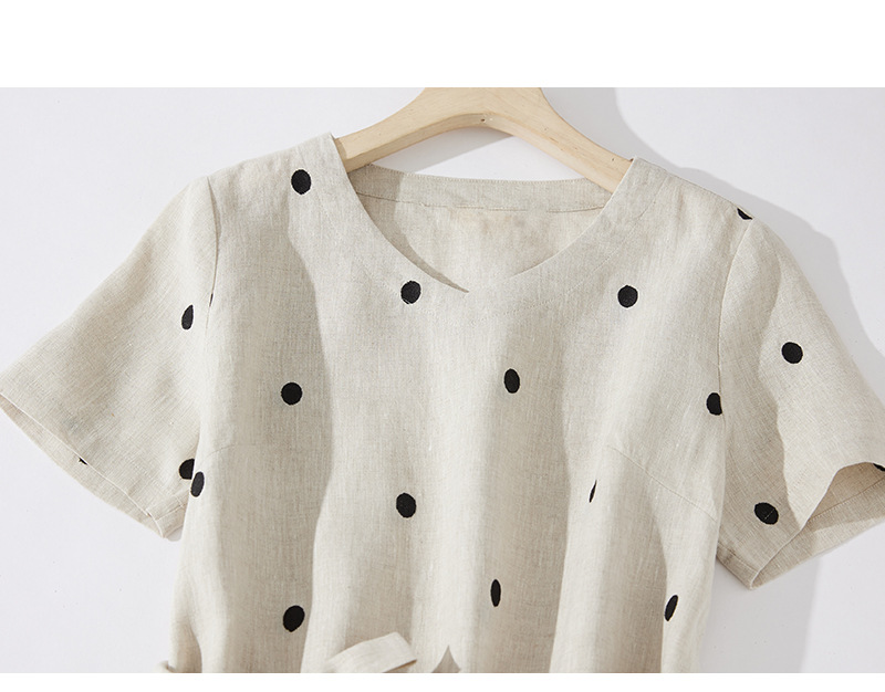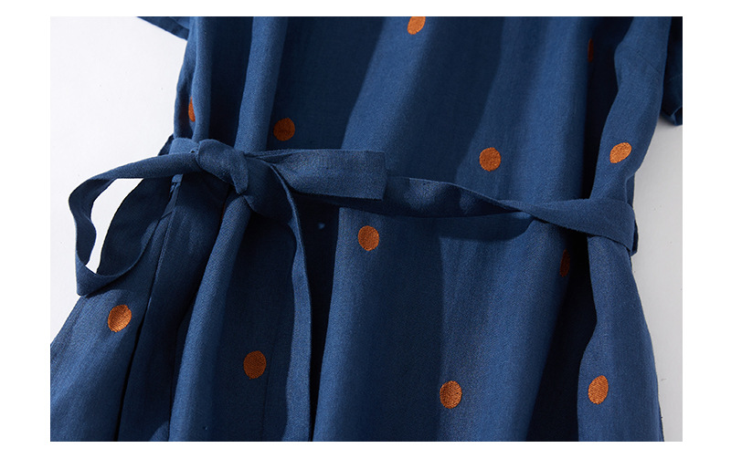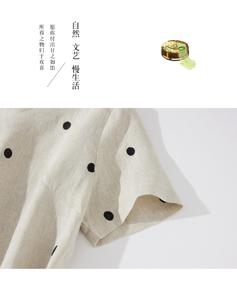 2024夏新款棉麻印花文艺波点小个子中长连衣裙系带收腰显瘦短袖裙