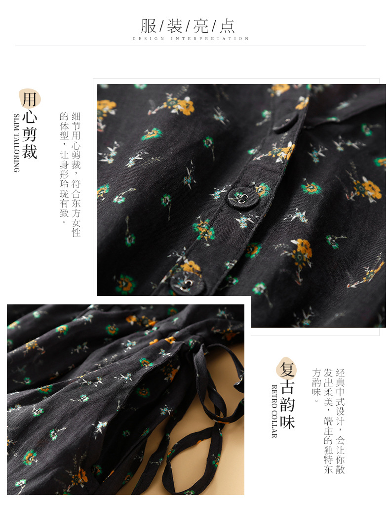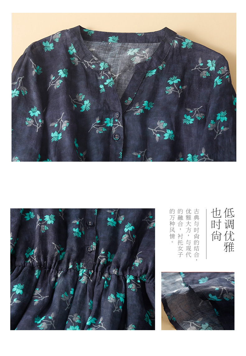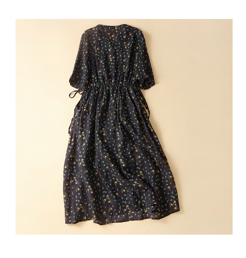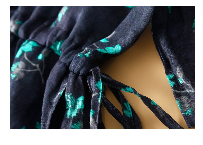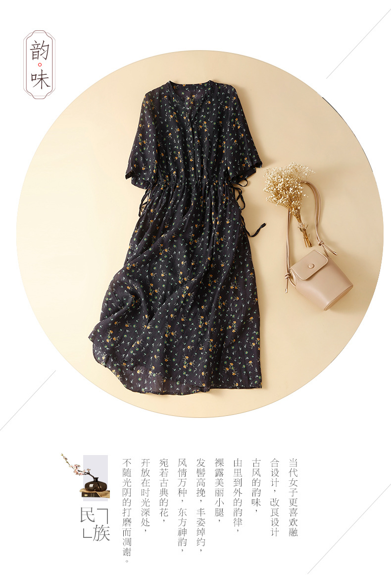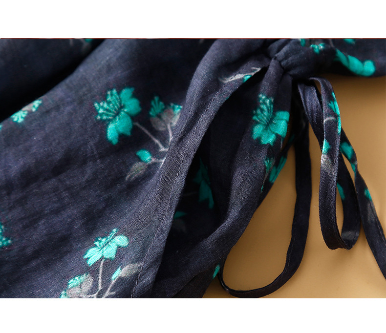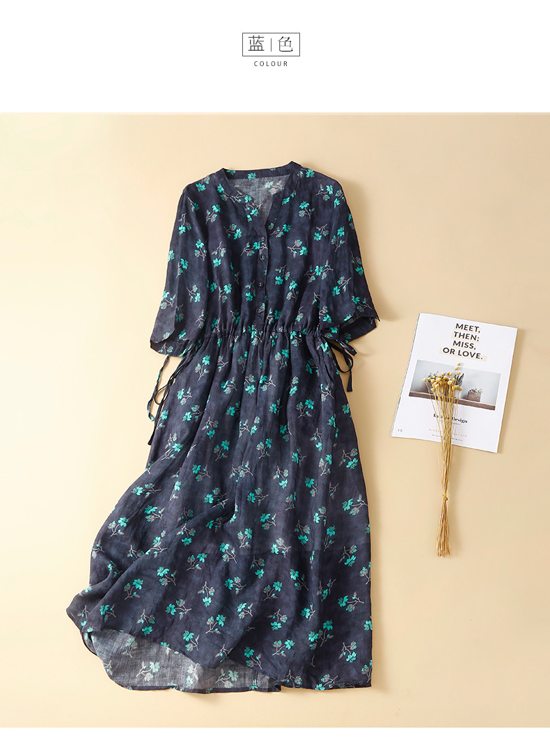 系带苎麻V领七分袖棉麻连衣裙女新款夏收腰显瘦文艺气质碎花长裙