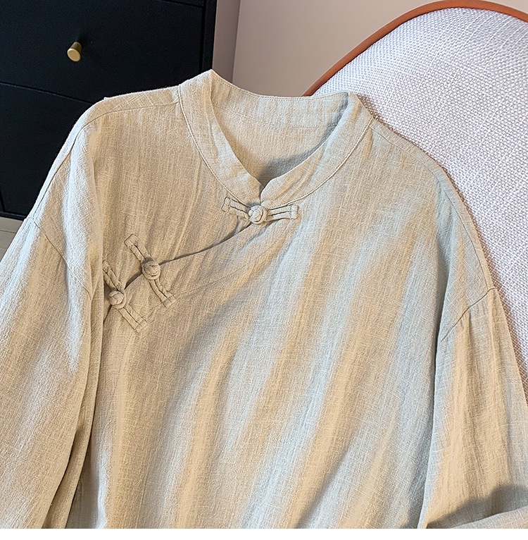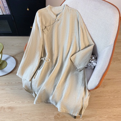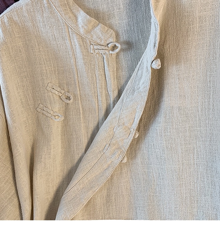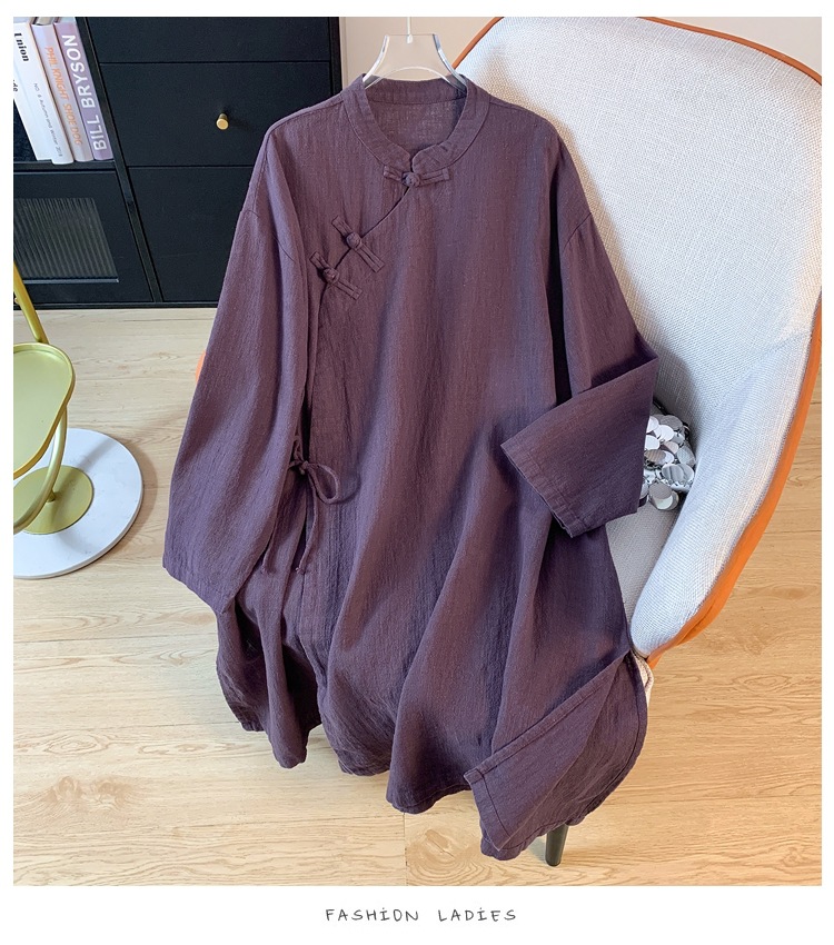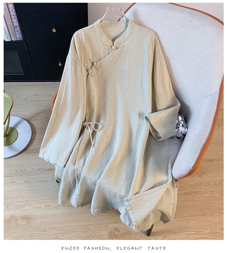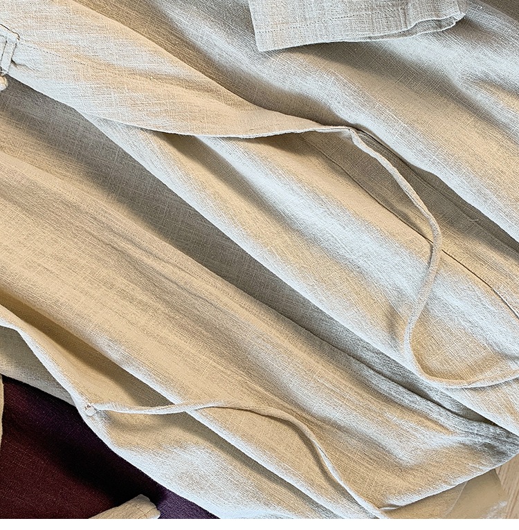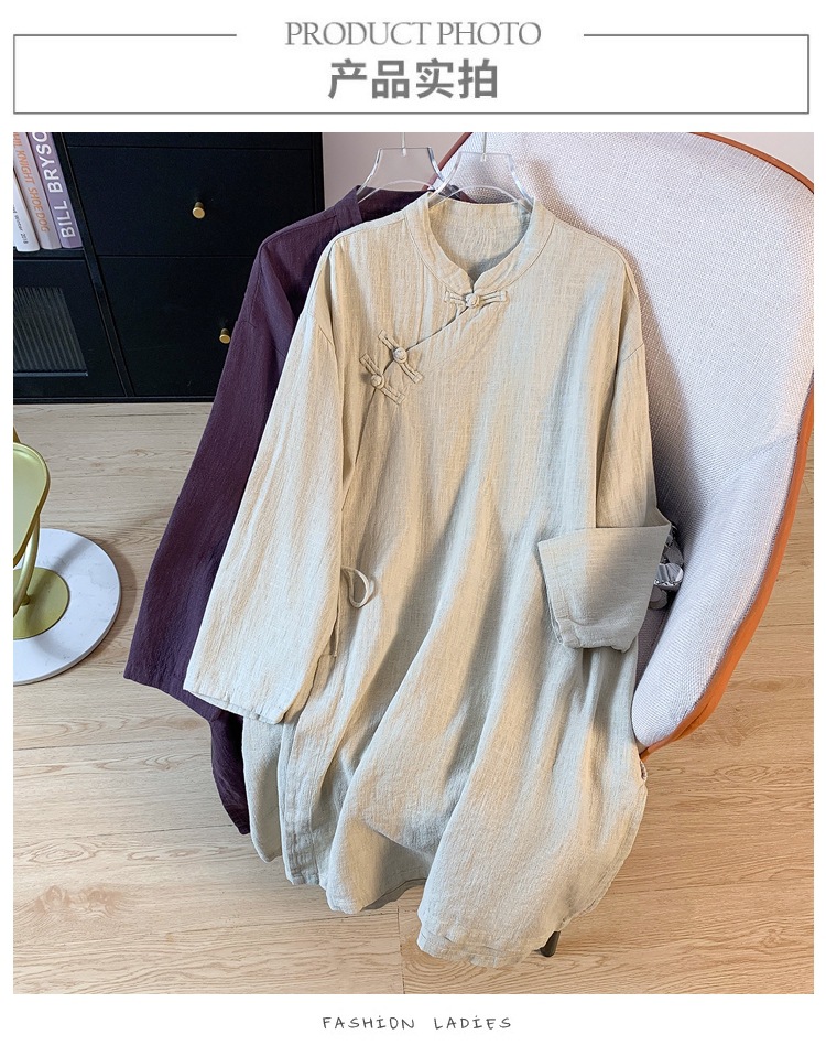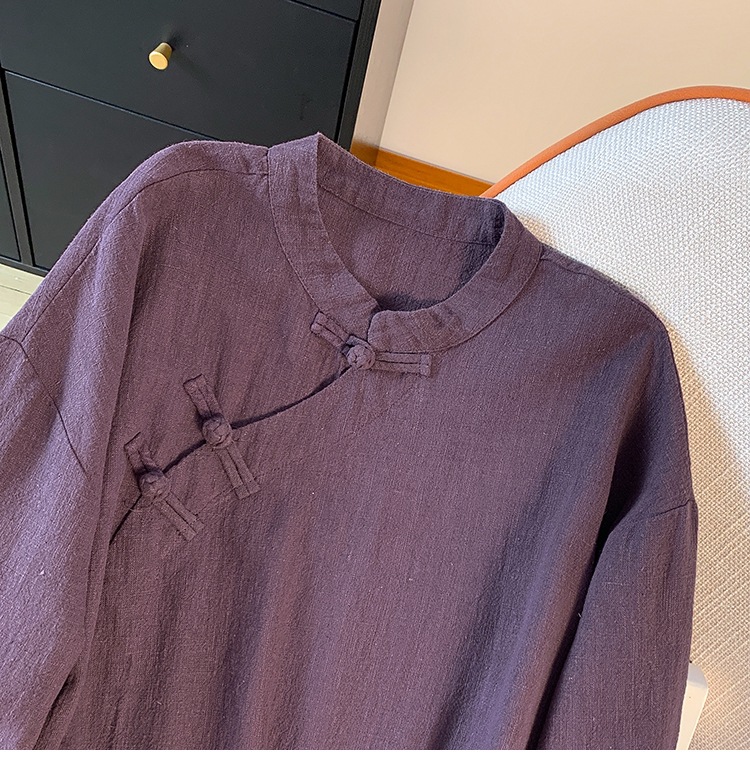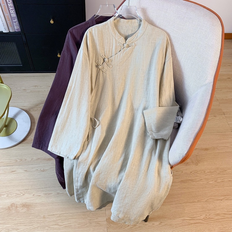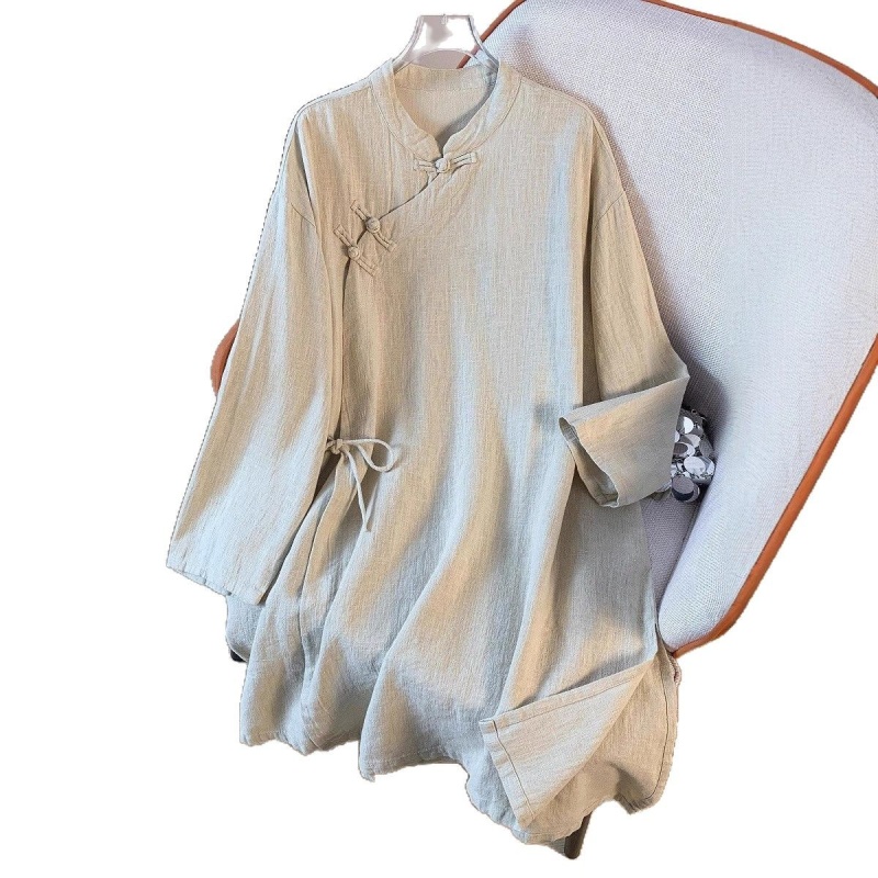 实拍2025新款通勤中式文艺盘扣系带棉麻衬衫长款禅意茶服立领上衣