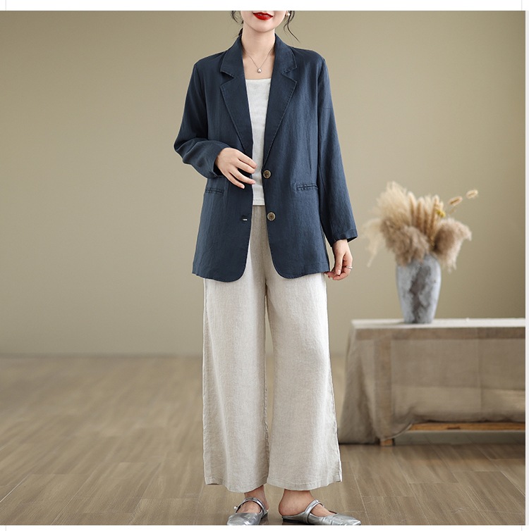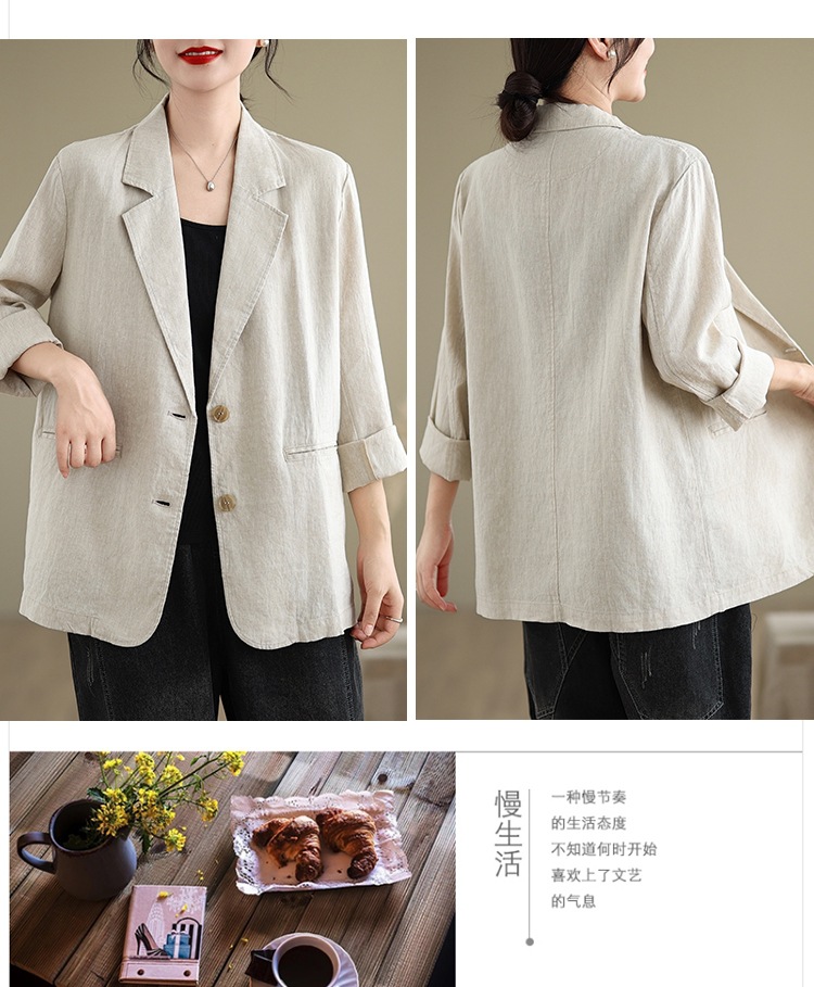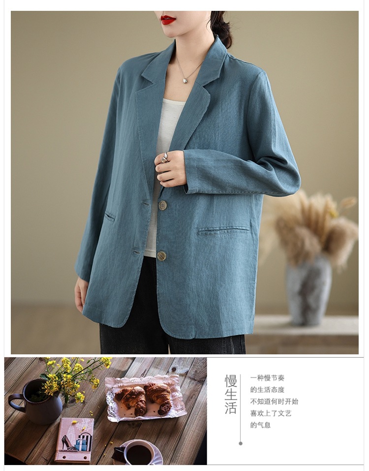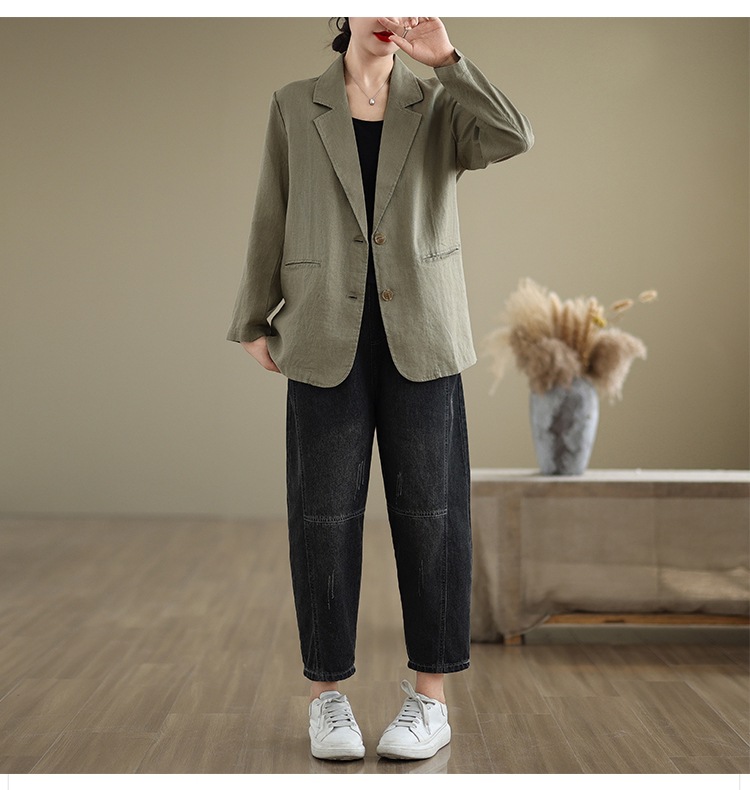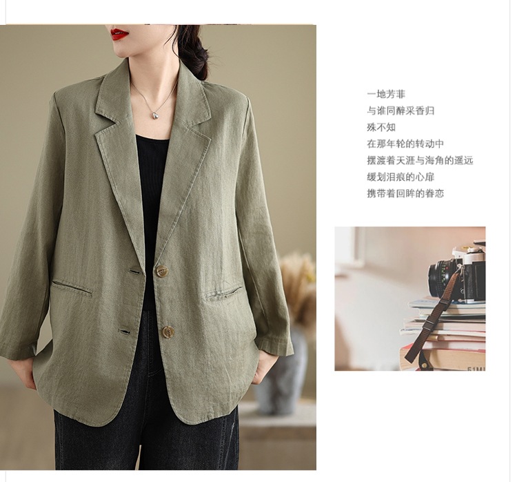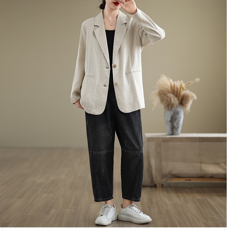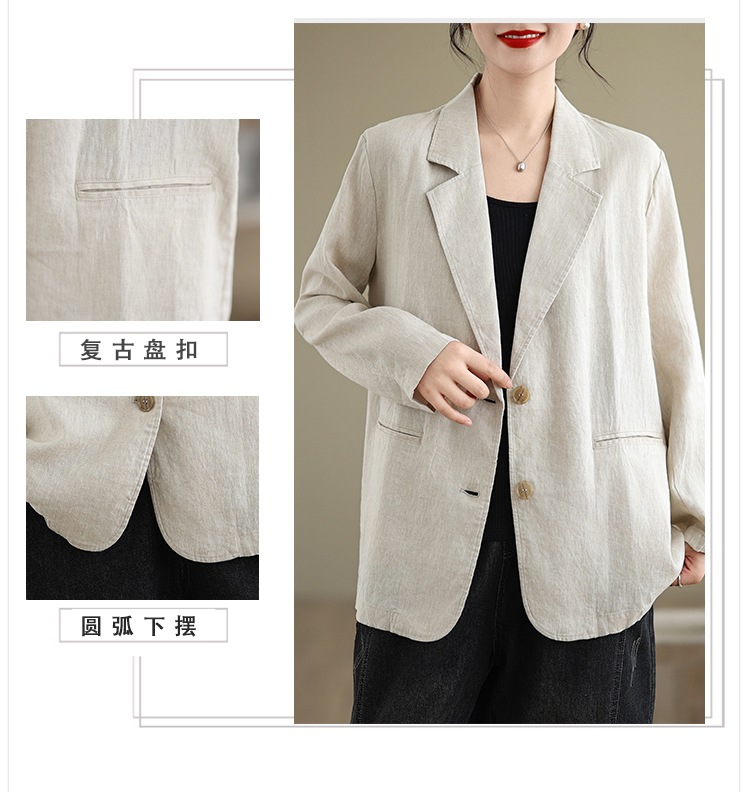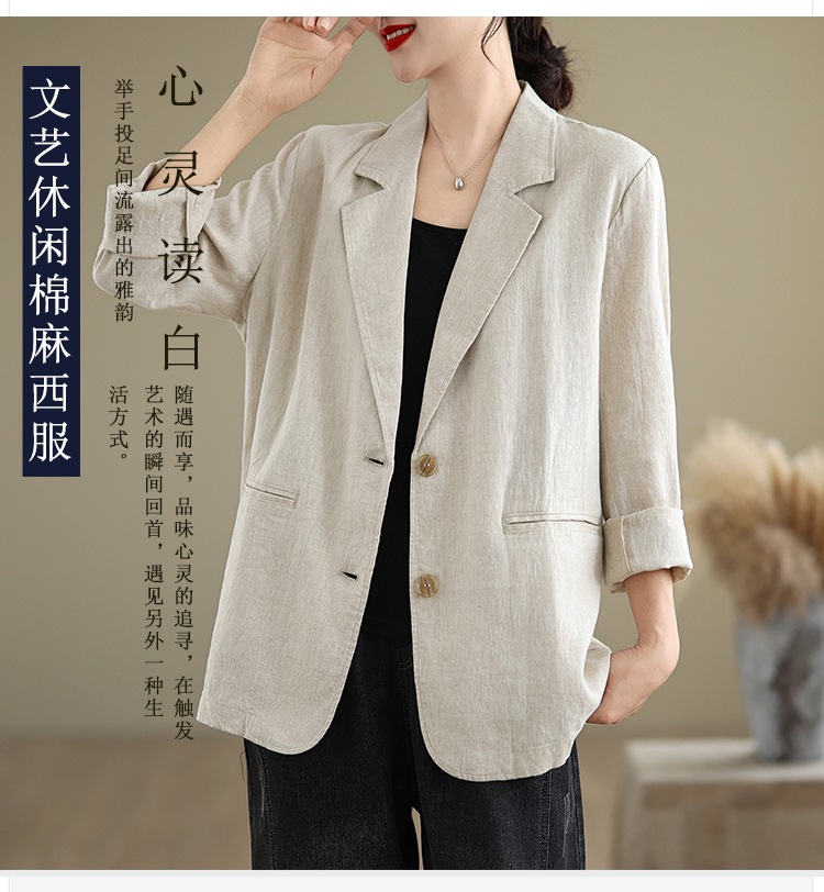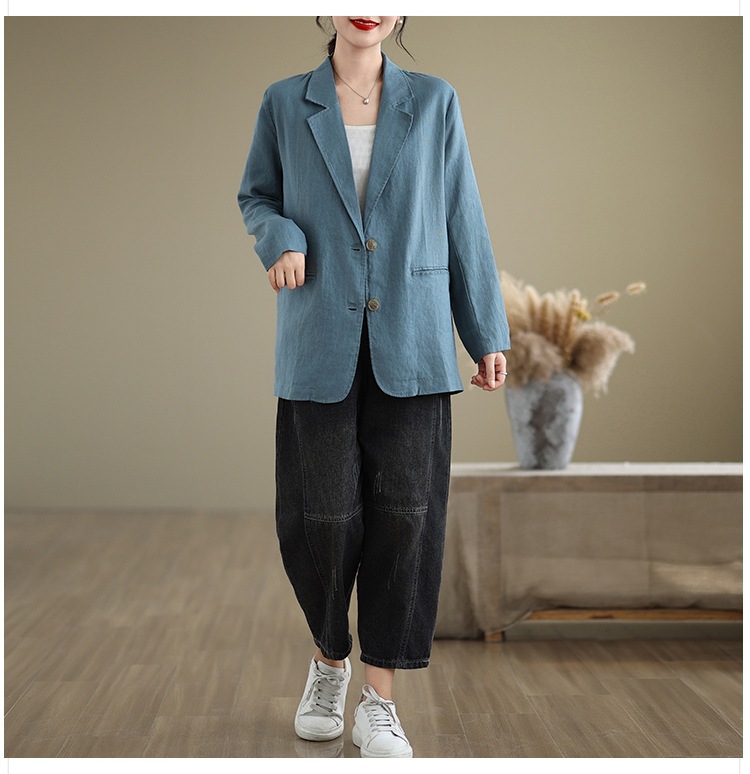实拍2025年春秋新款棉麻文艺宽松西装领长袖小西服休闲外套上衣女