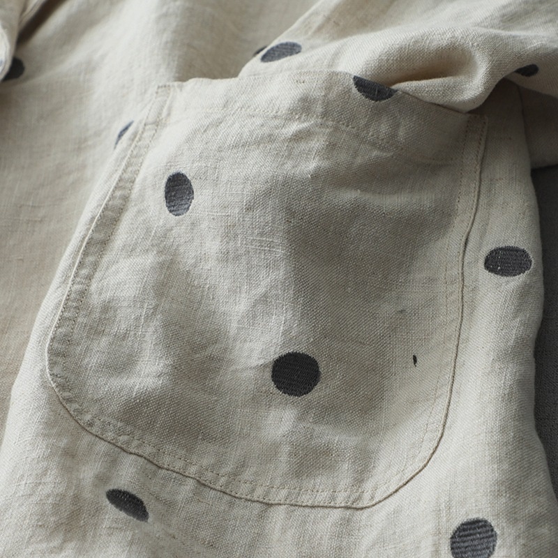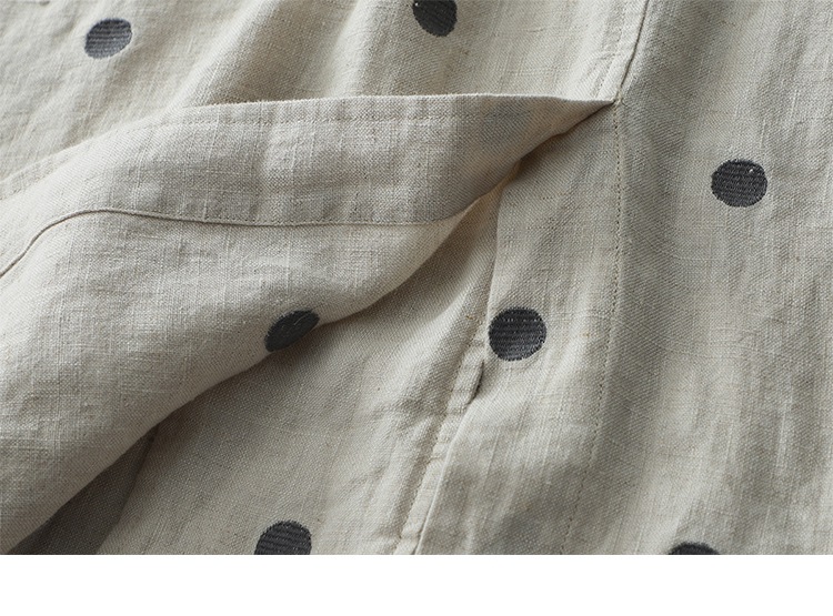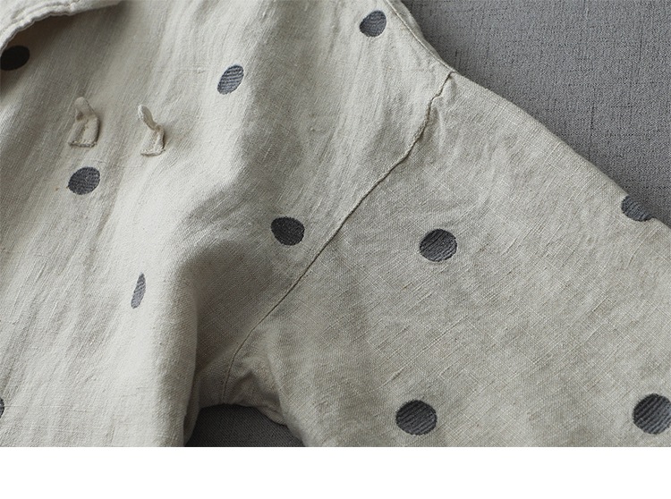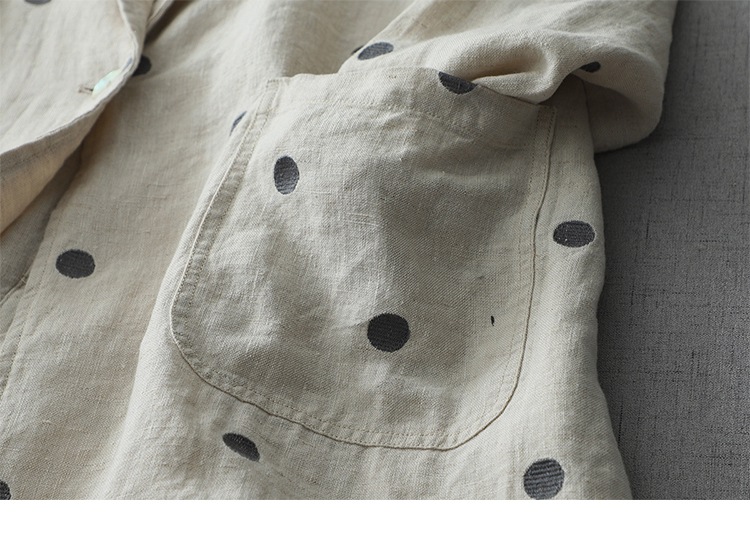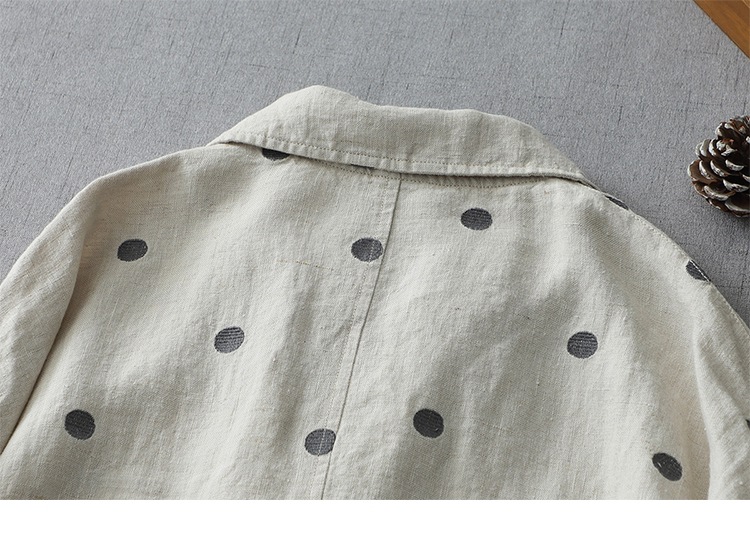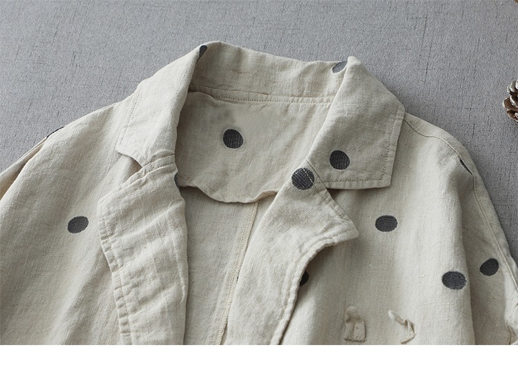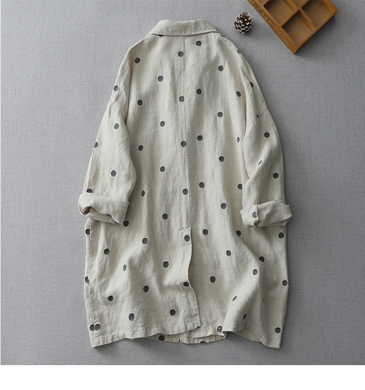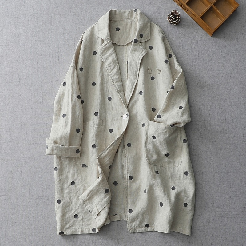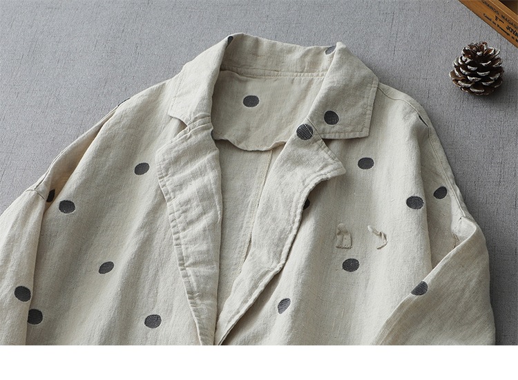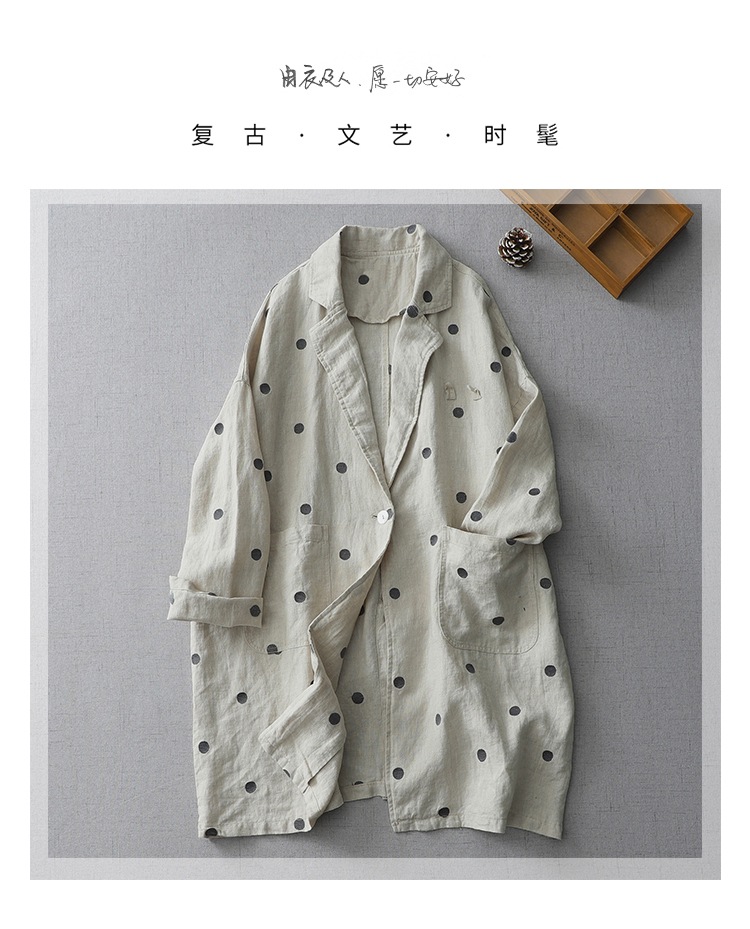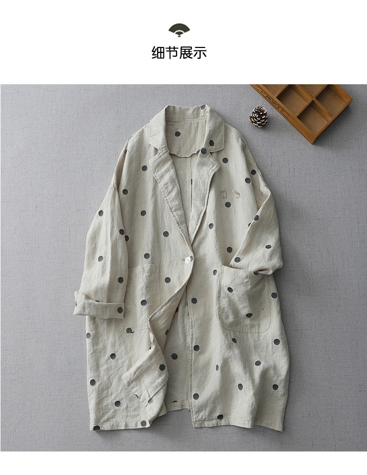 实拍2025春秋女亚麻波点文艺长袖外套日系宽松中长西装外搭薄风衣