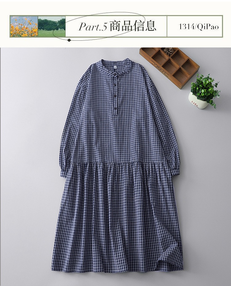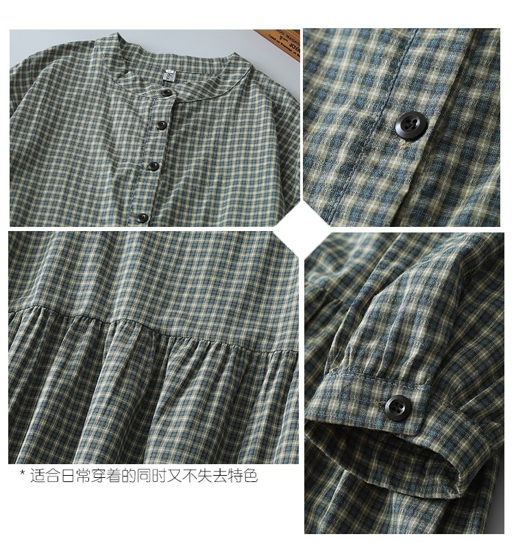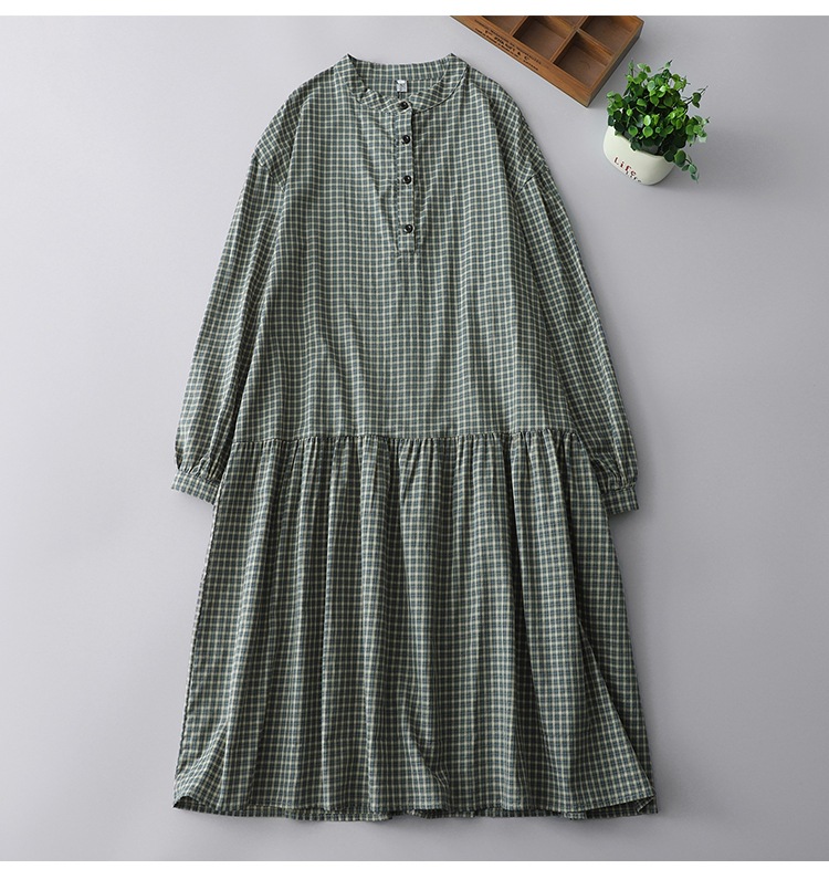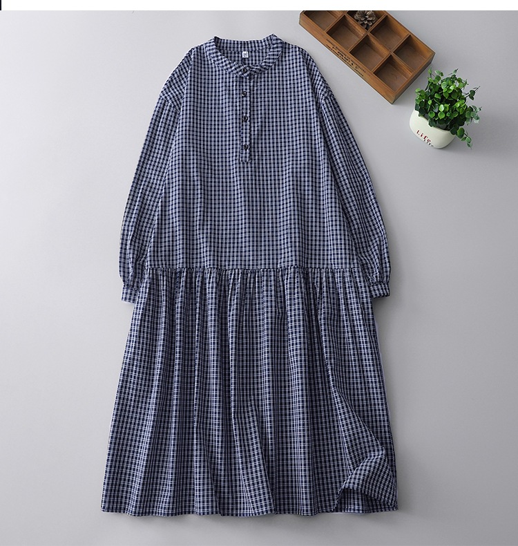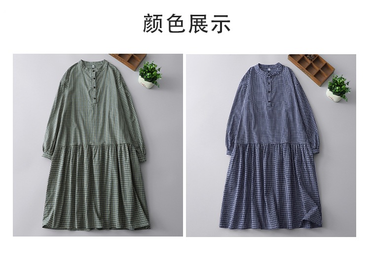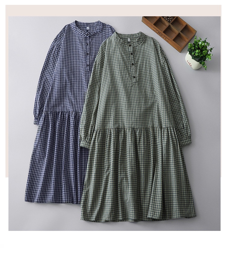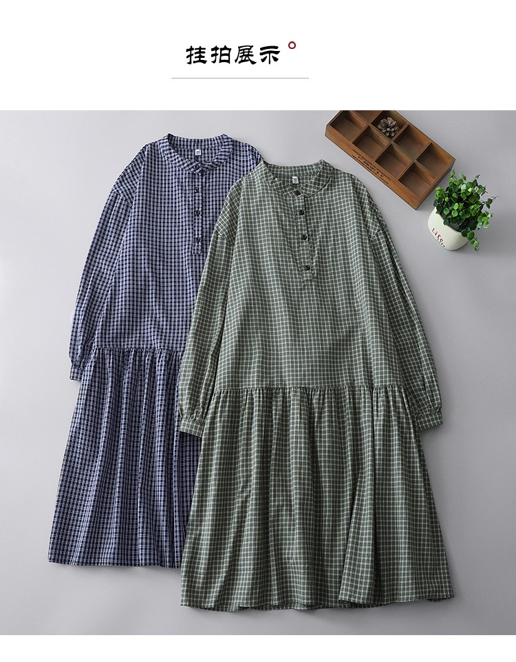 实拍2025春季新款日系格子连衣裙复古休闲宽松中长款棉质长袖裙子