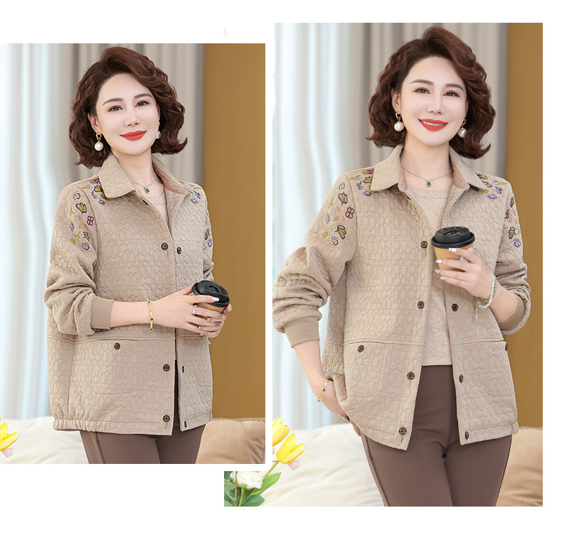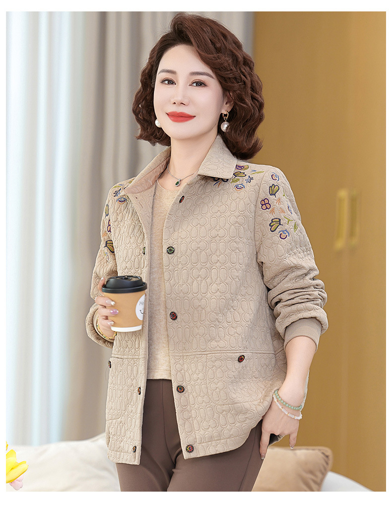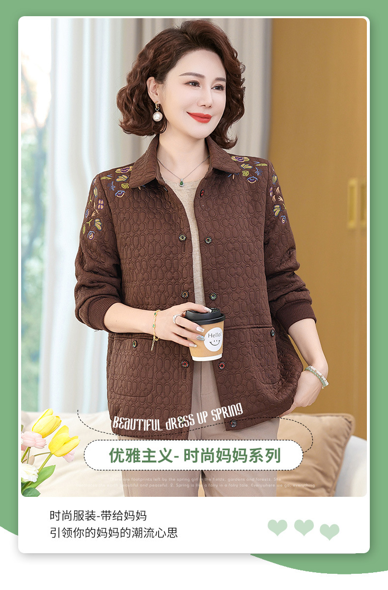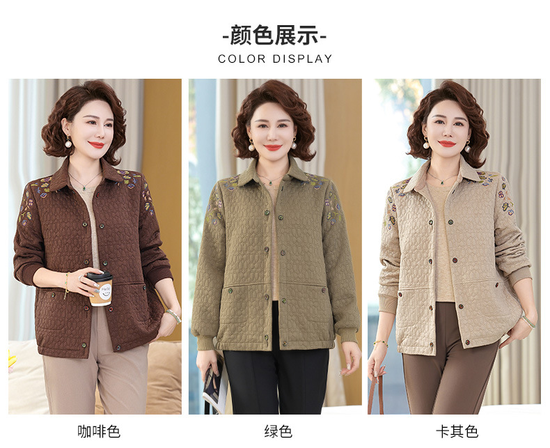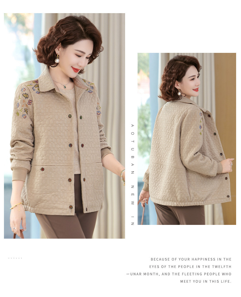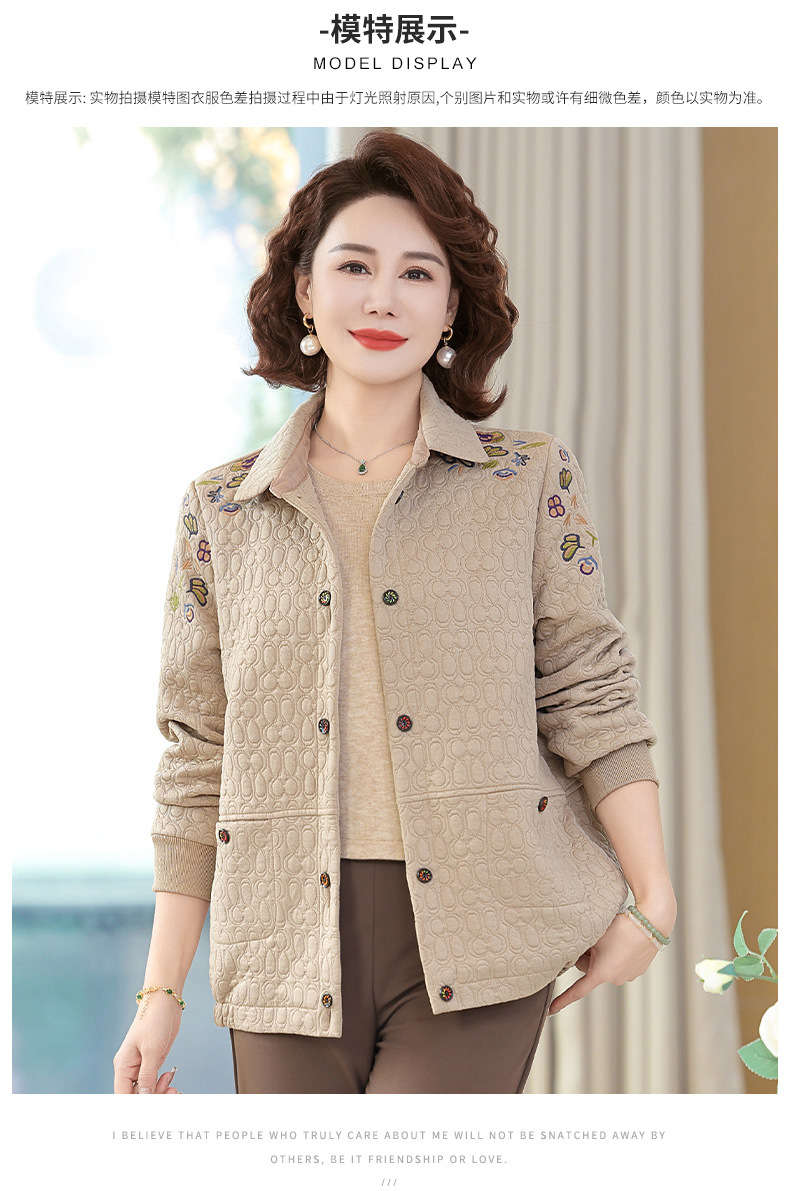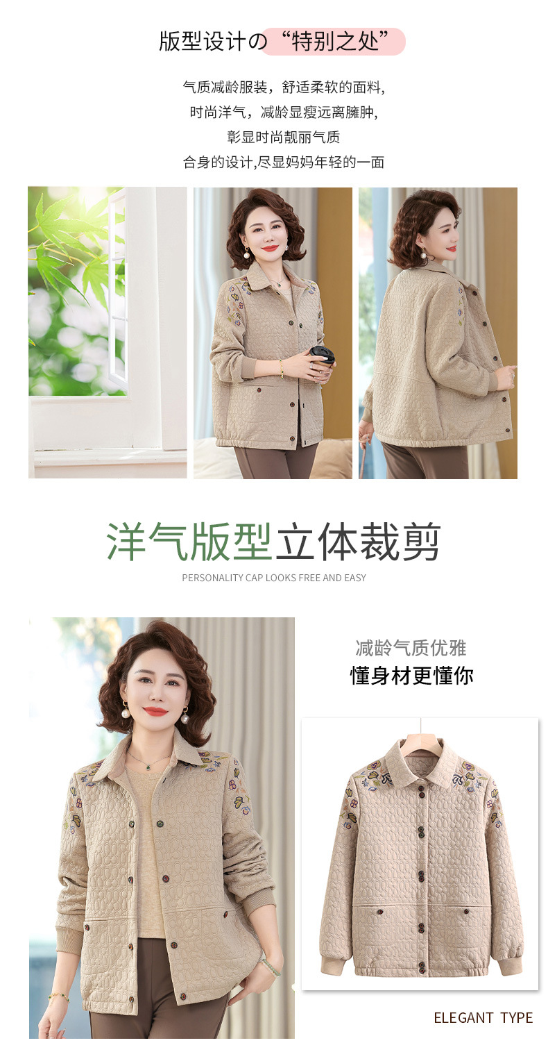 商品名称:妈妈春装短款休闲外套翻领小个子时尚刺绣夹克衫中老年女装上衣