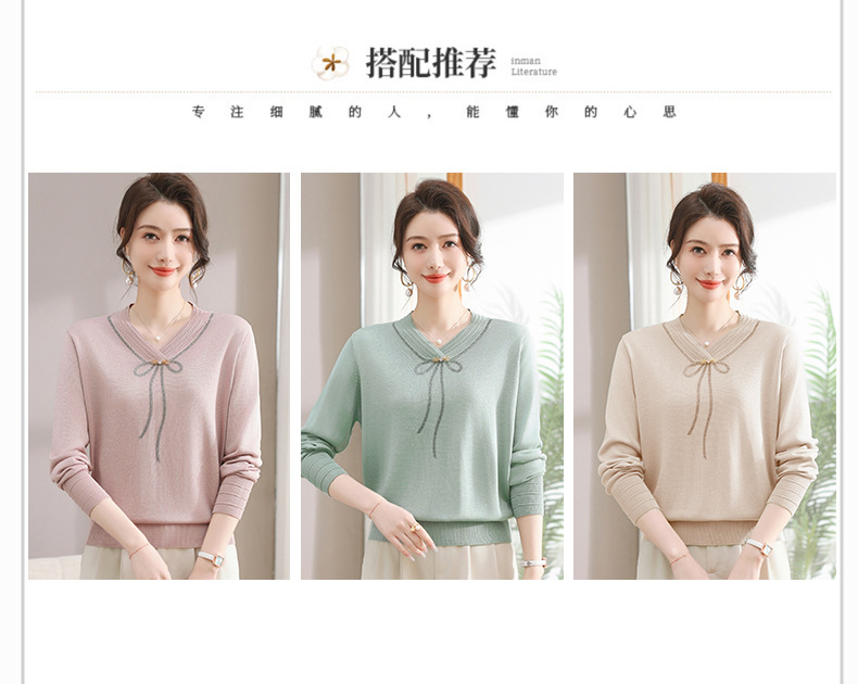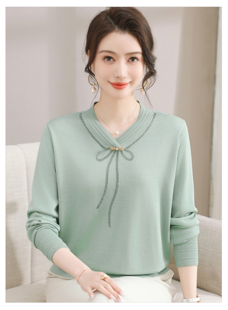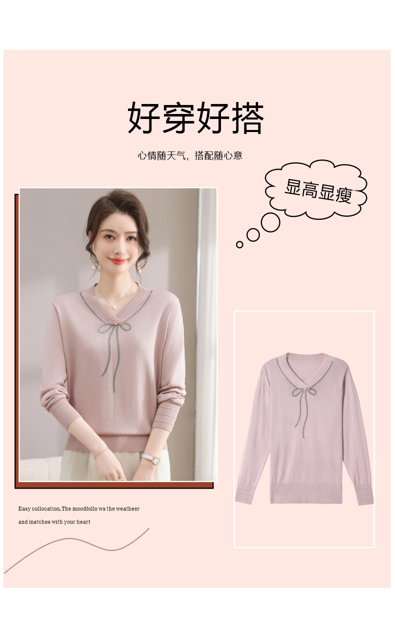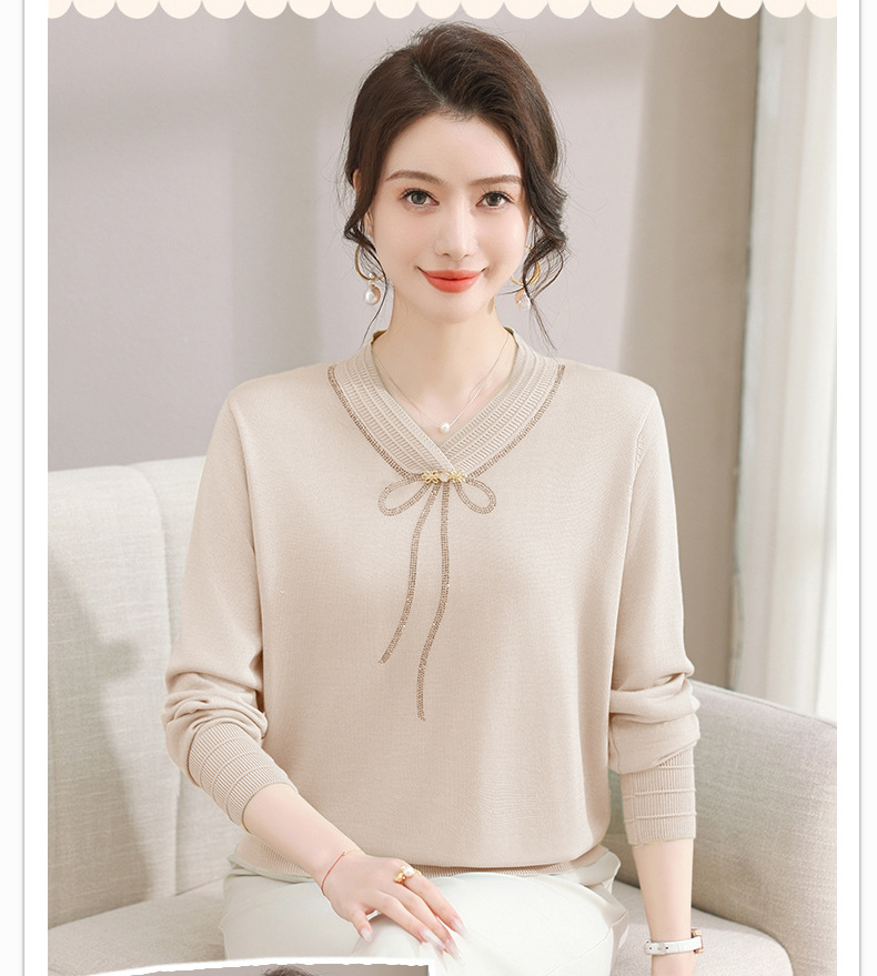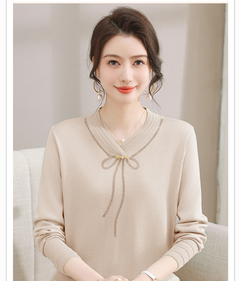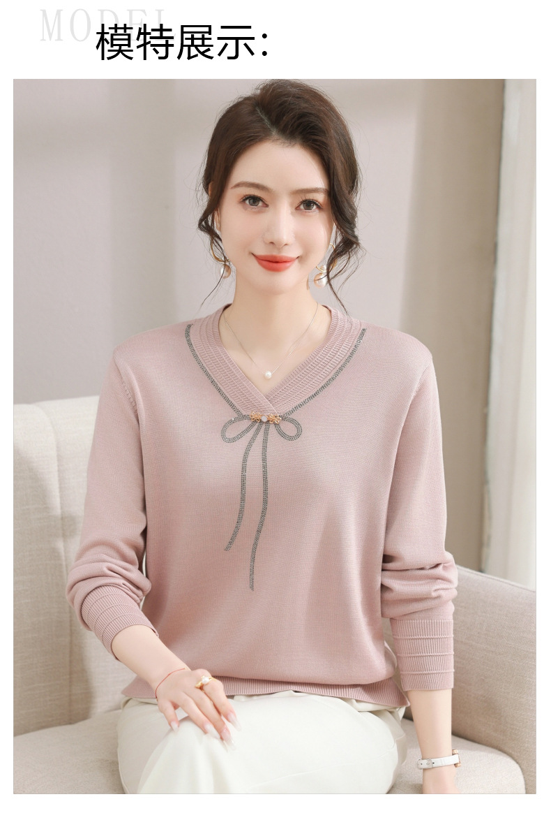 商品名称:春秋新款V领针织衫中年妈妈减龄打底衫T恤洋气百搭镶钻女装女毛衣