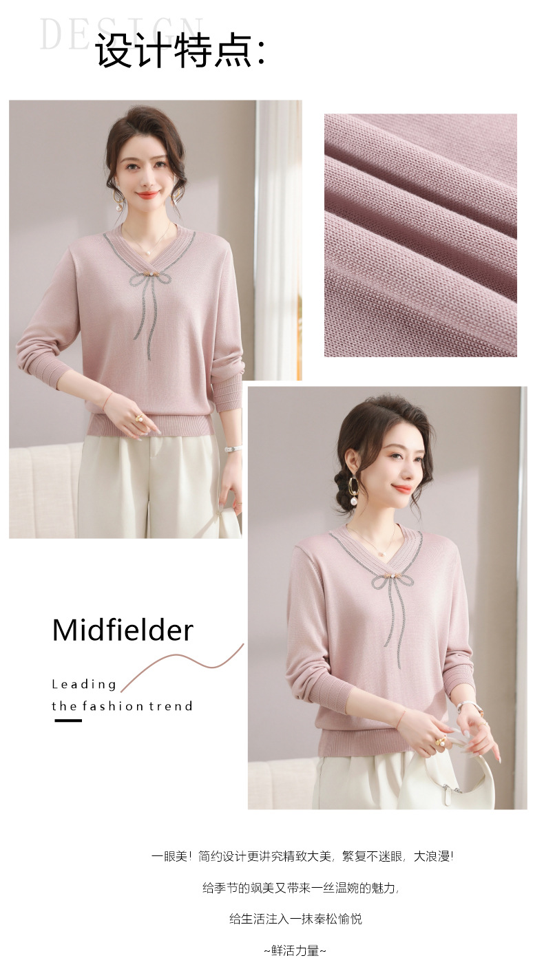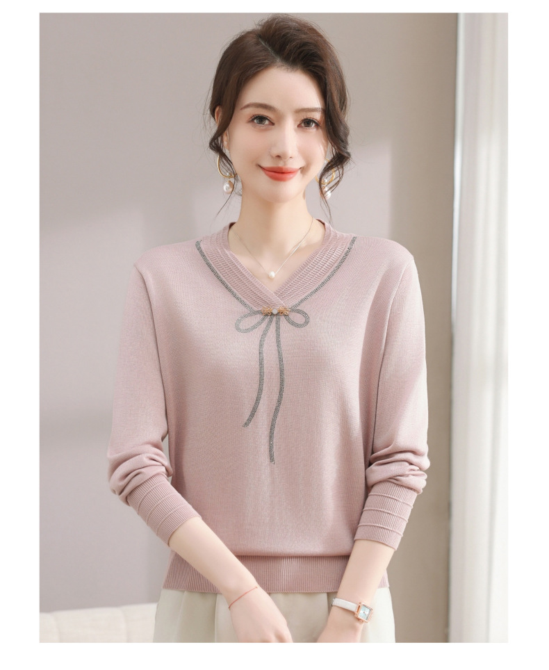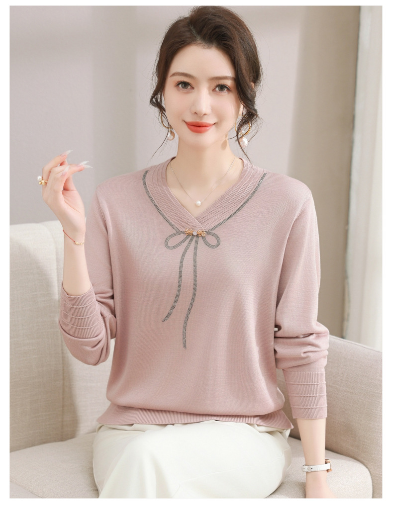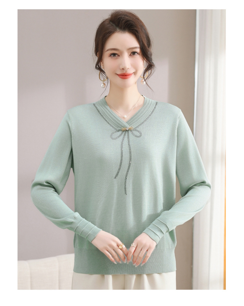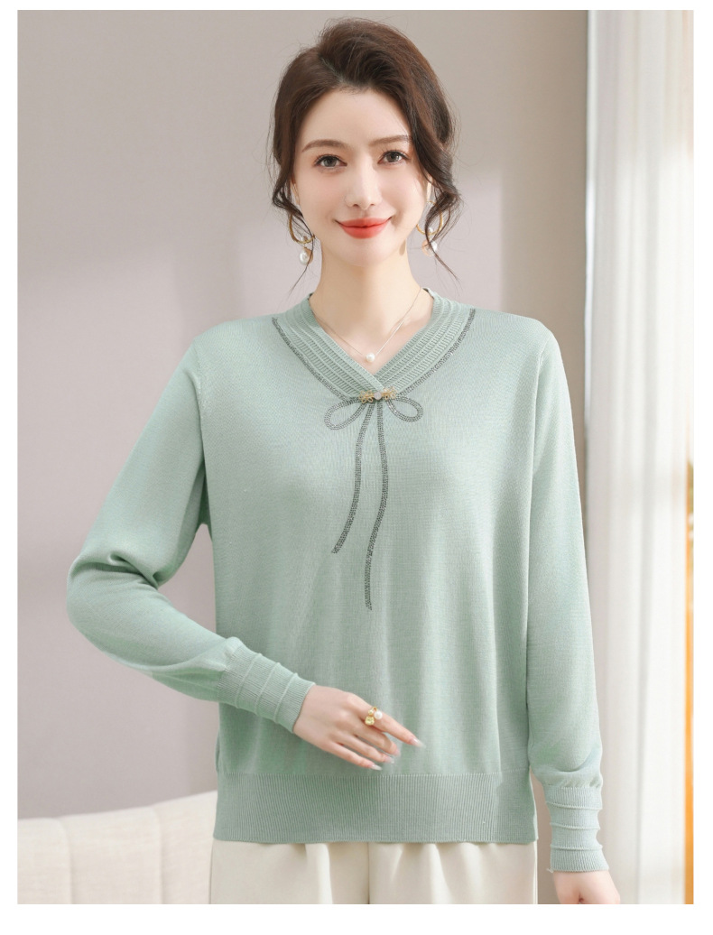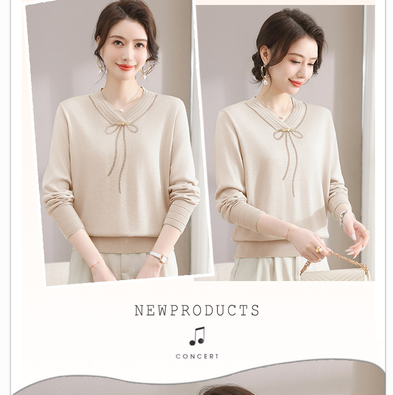 商品名称:春秋新款V领针织衫中年妈妈减龄打底衫T恤洋气百搭镶钻女装女毛衣
