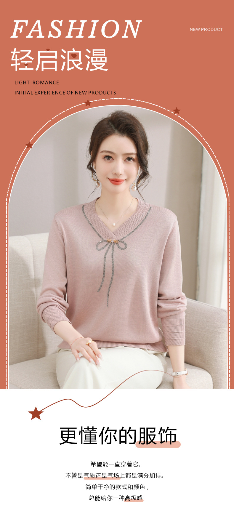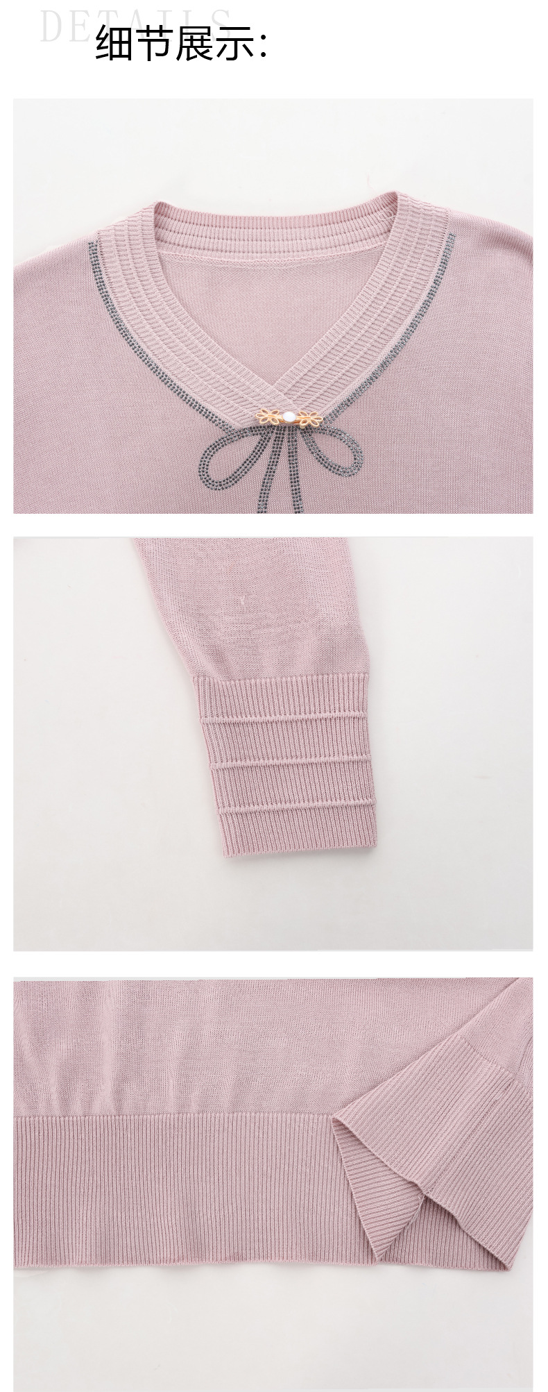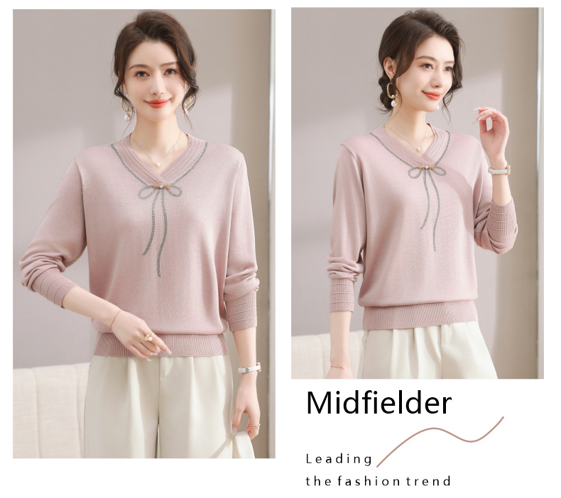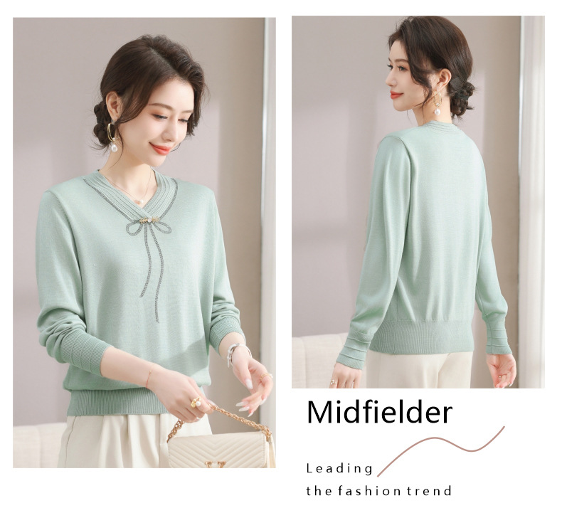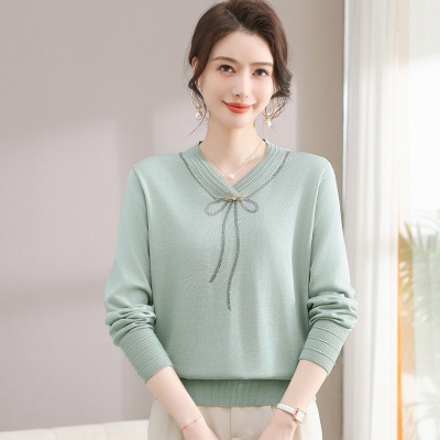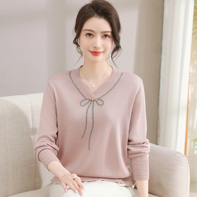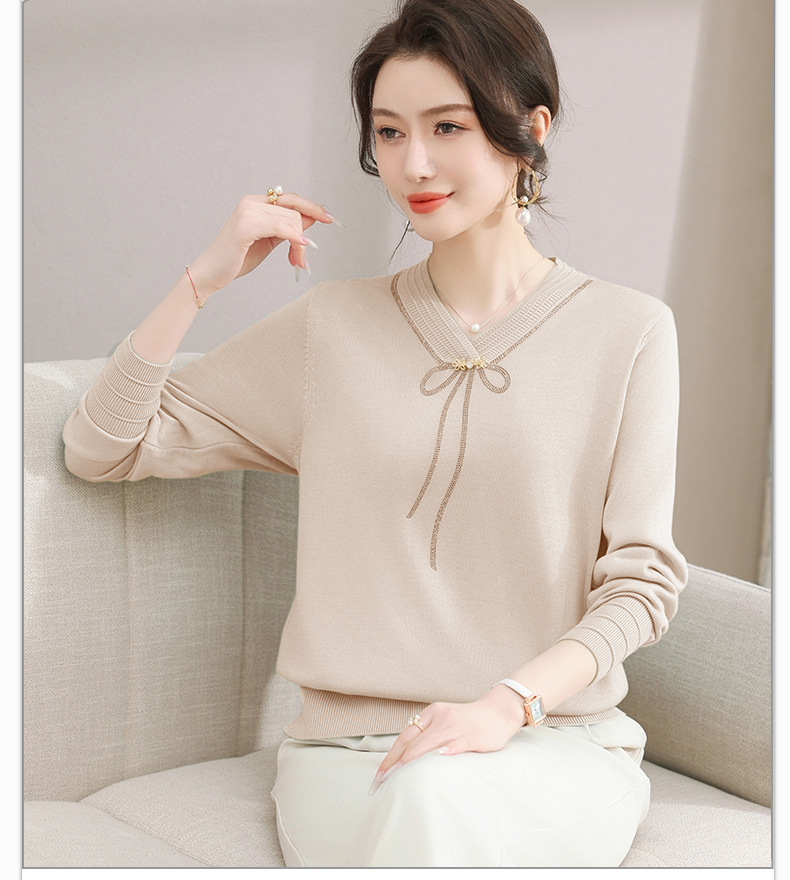 商品名称:春秋新款V领针织衫中年妈妈减龄打底衫T恤洋气百搭镶钻女装女毛衣
