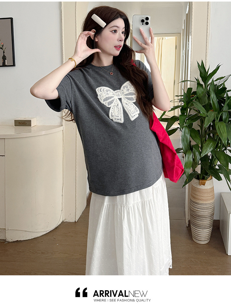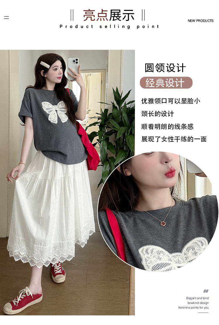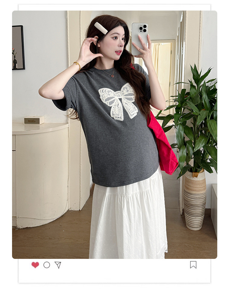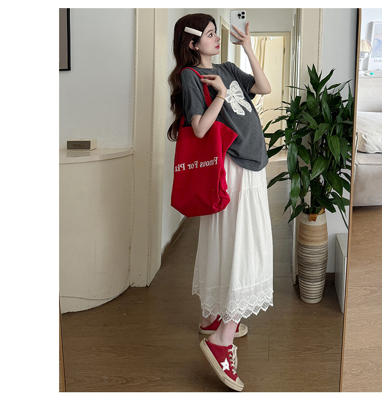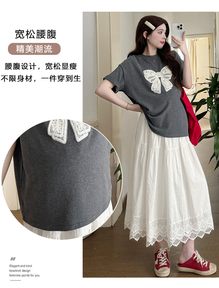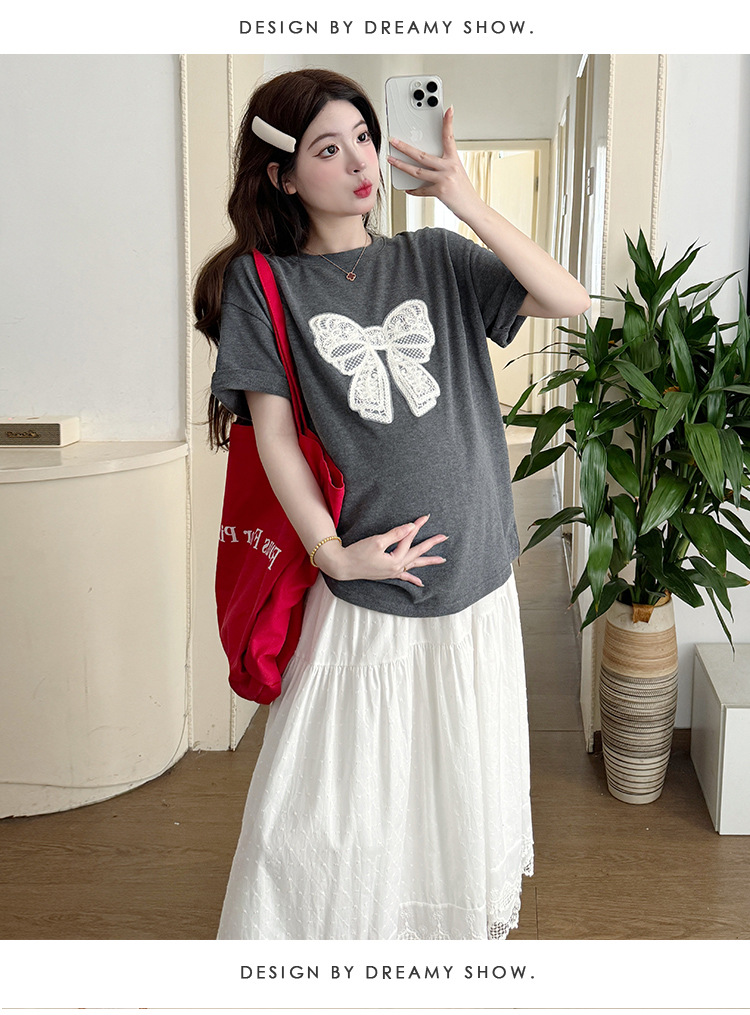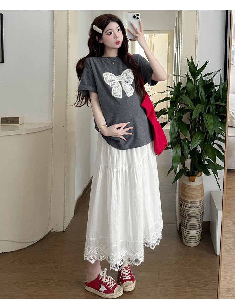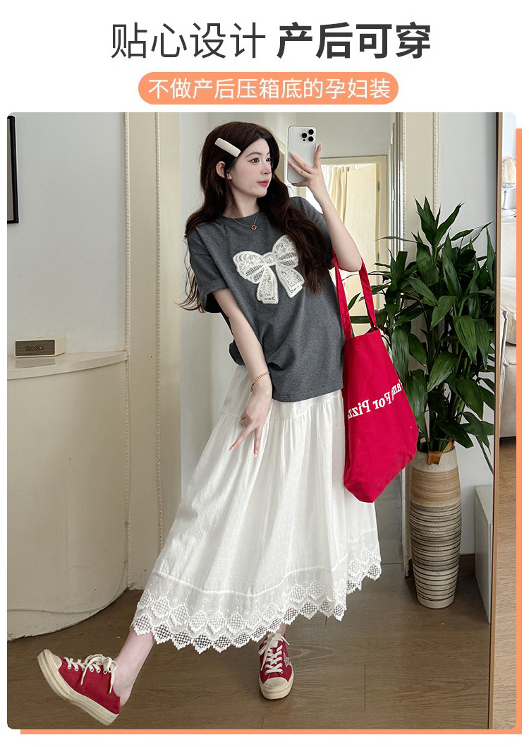 2025夏季新款棉质宽松蝴蝶结刺绣T恤上衣+半身裙孕期外穿孕妇套装