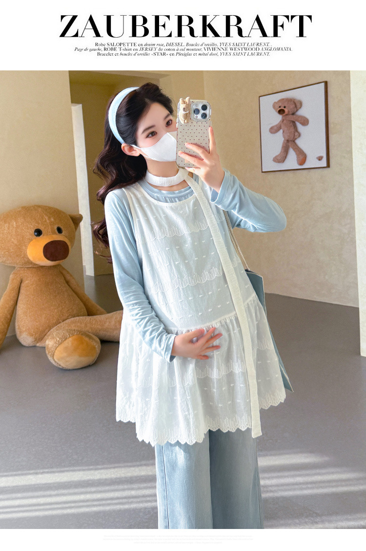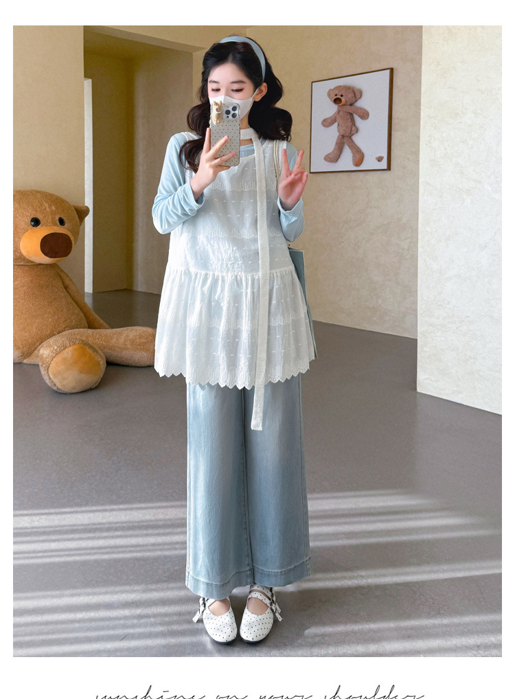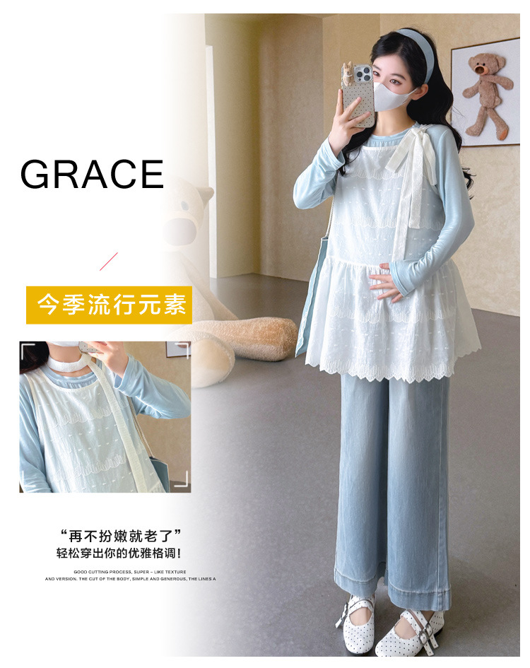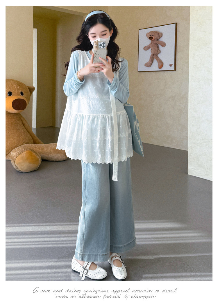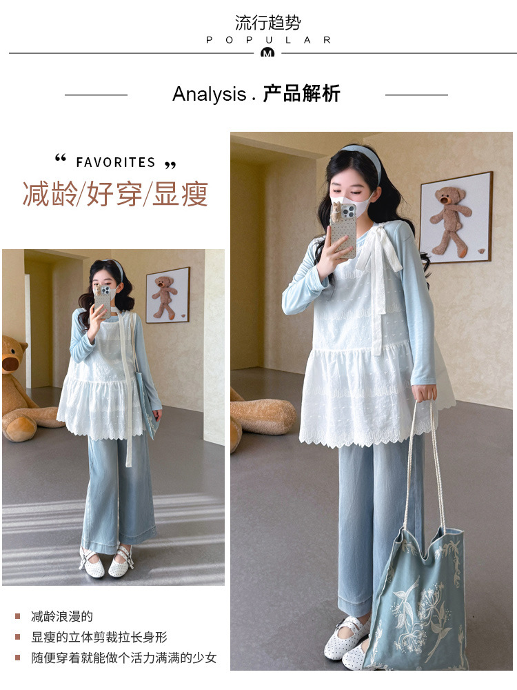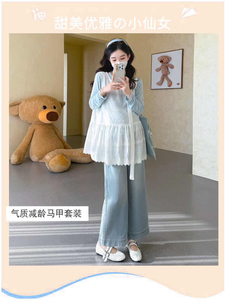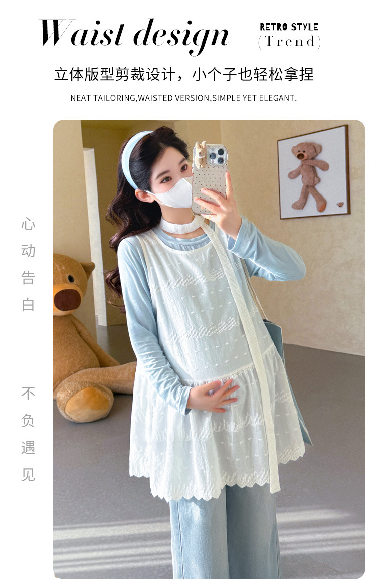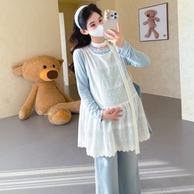 商品名称:孕期穿搭2026春季新品洋气小清新宽松遮孕肚简约T恤+蕾丝背心套装