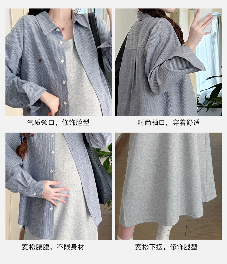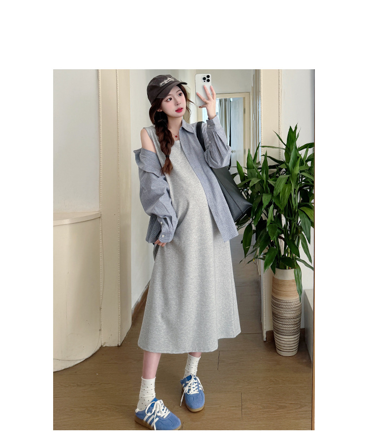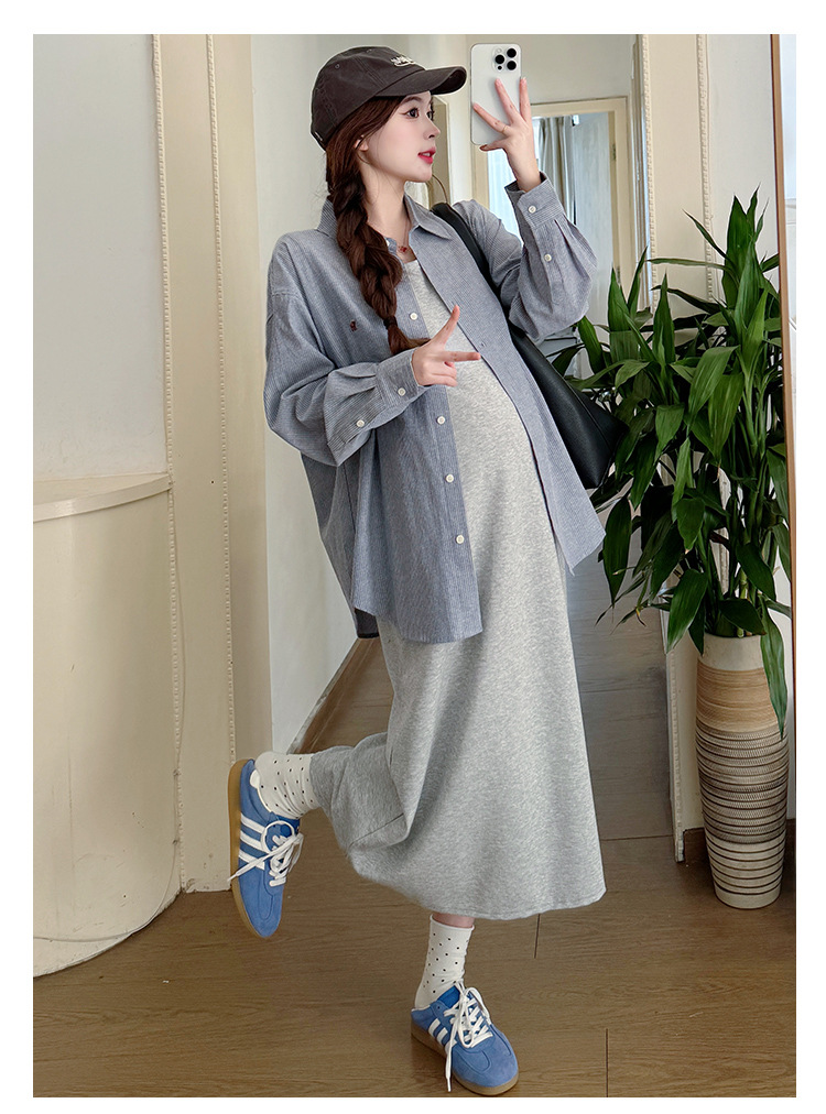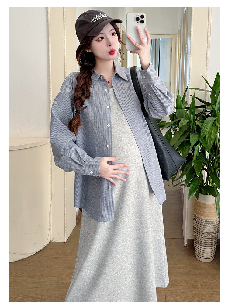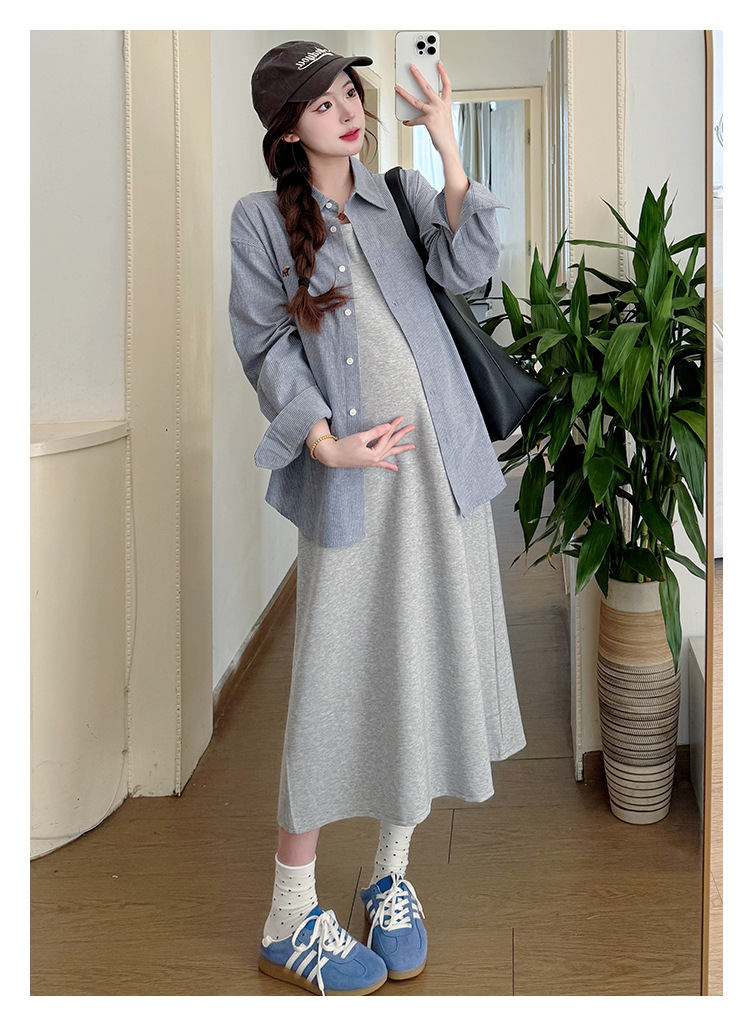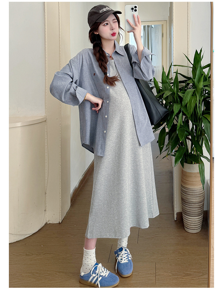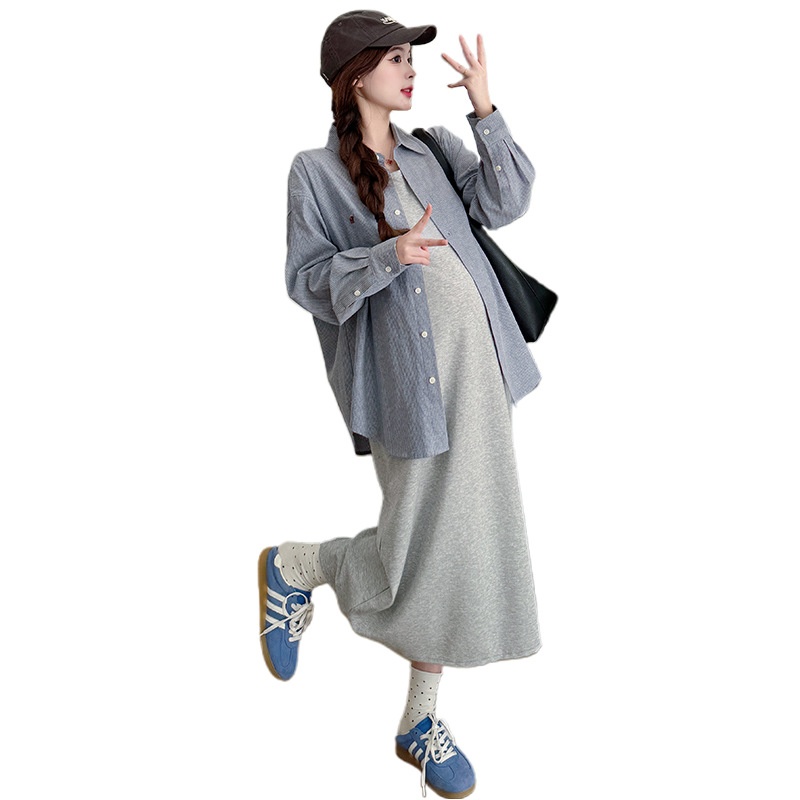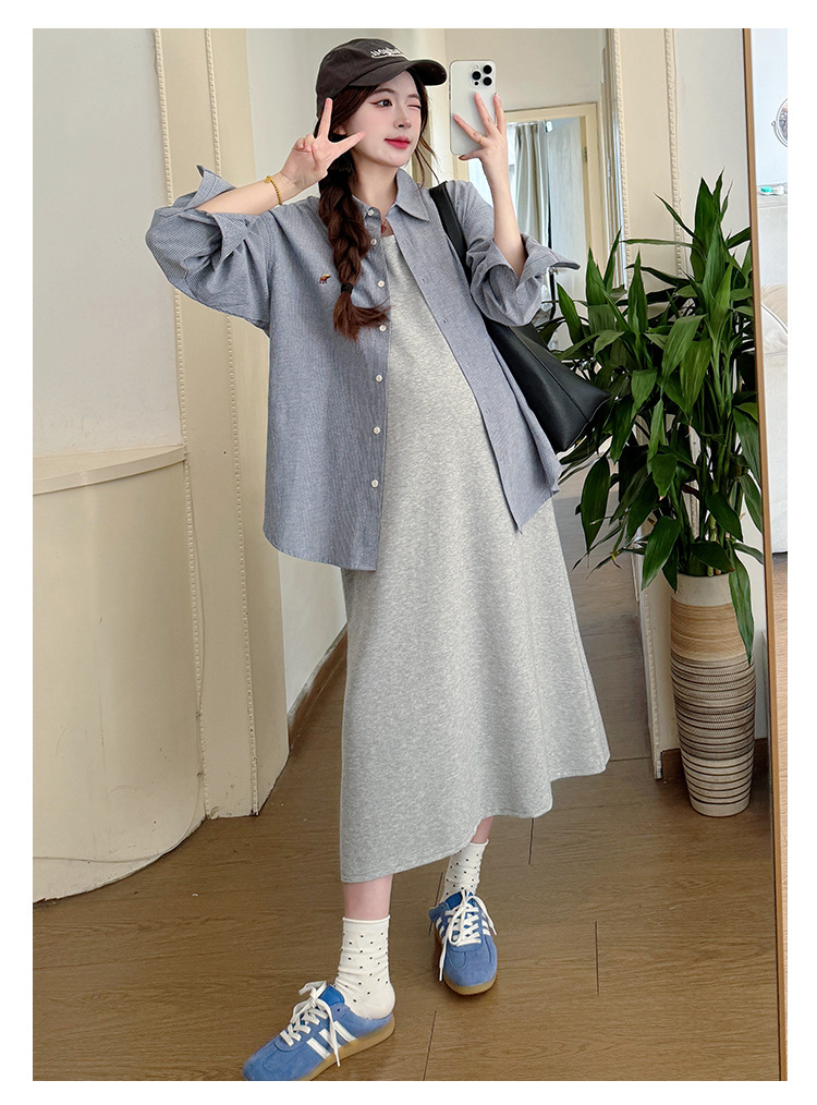 商品名称:孕妇套装2025春季新款灰色法式气质背心连衣裙+韩版宽松条纹衬衫