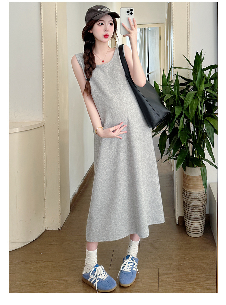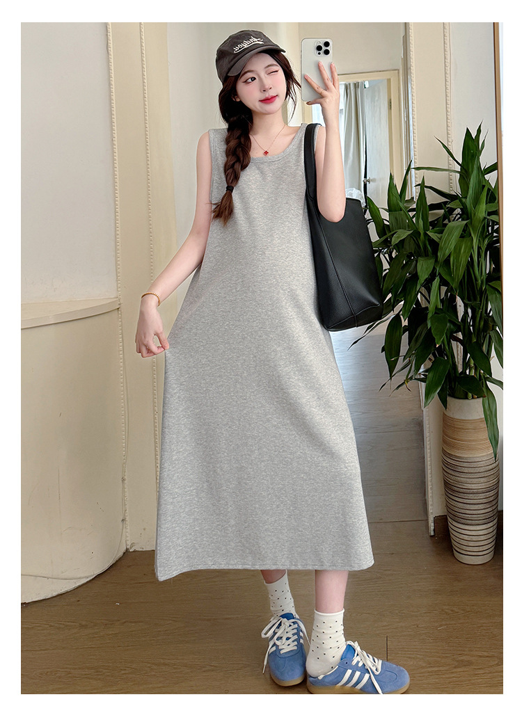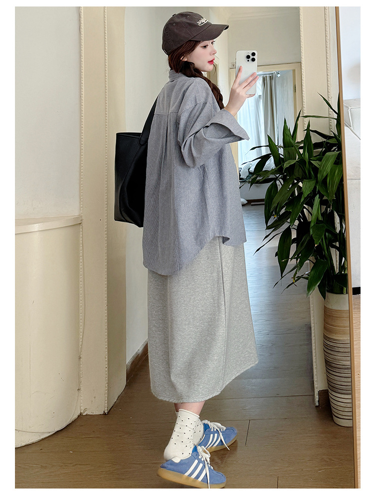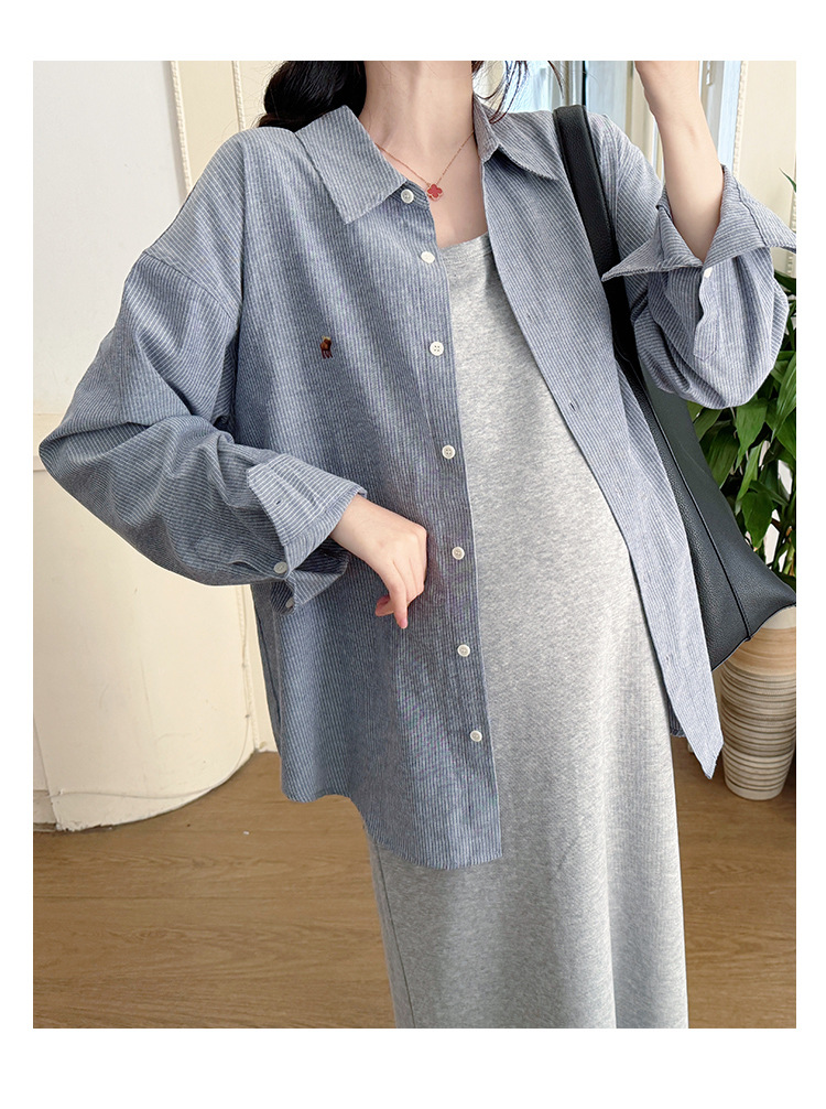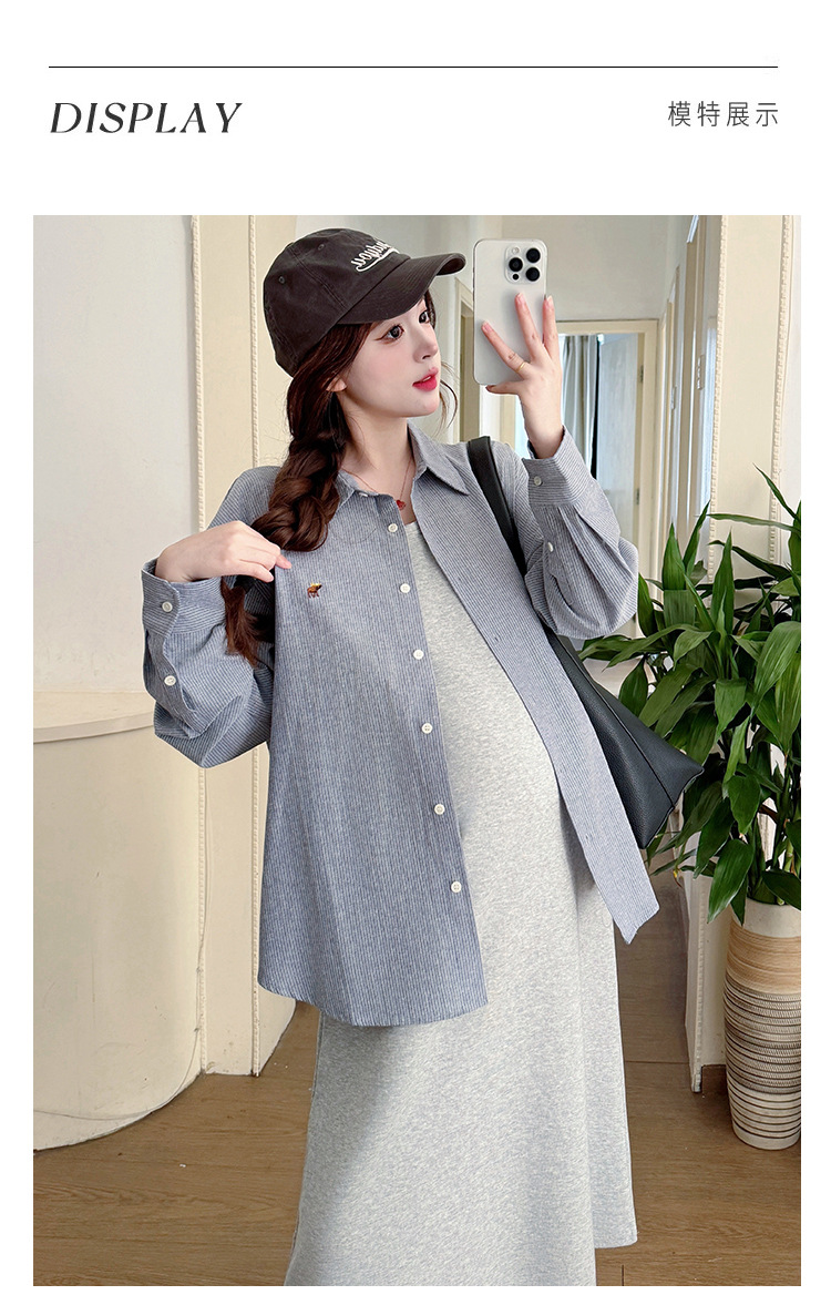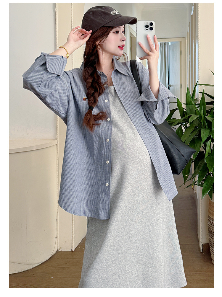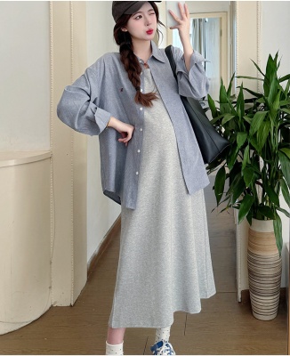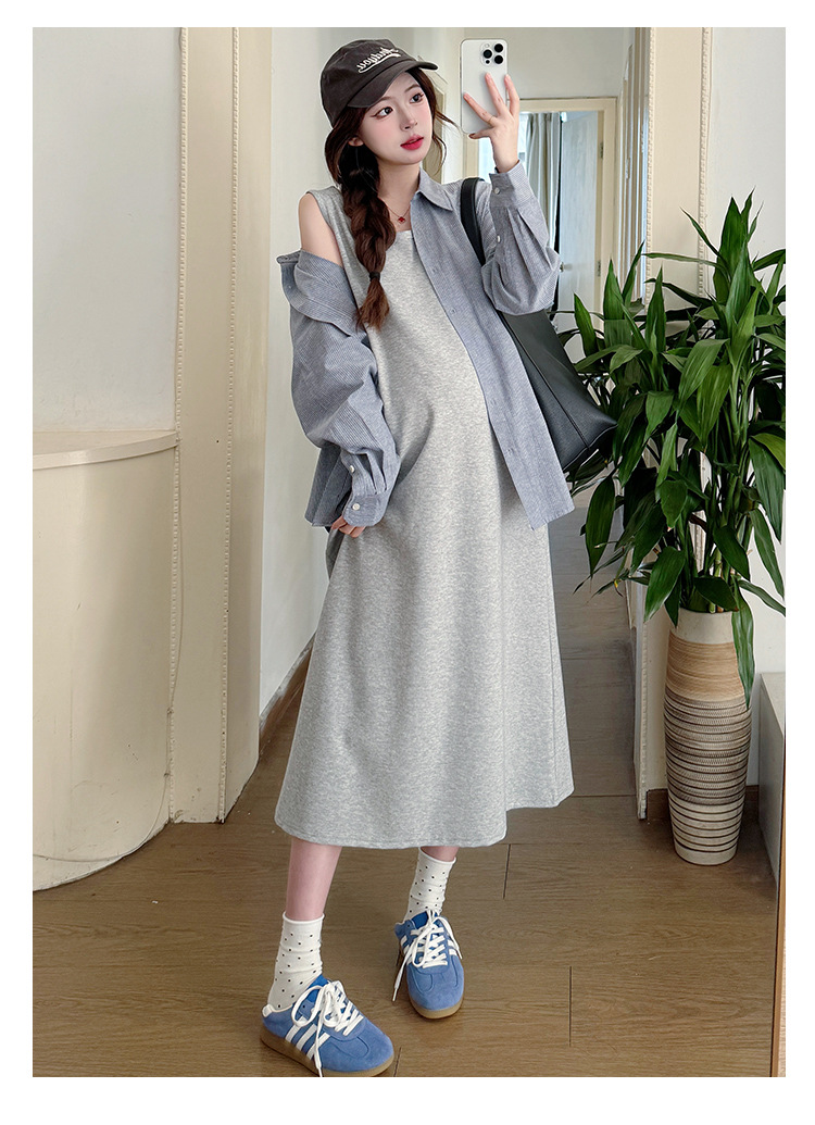 商品名称:孕妇套装2025春季新款灰色法式气质背心连衣裙+韩版宽松条纹衬衫