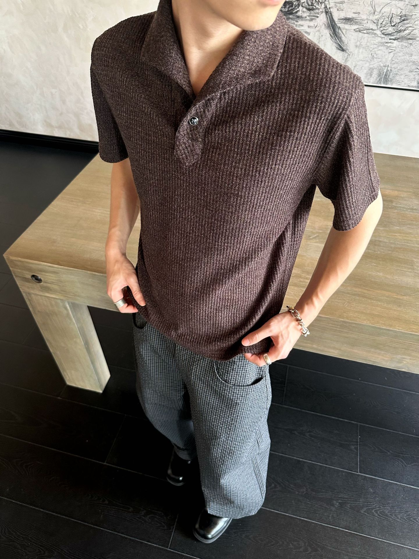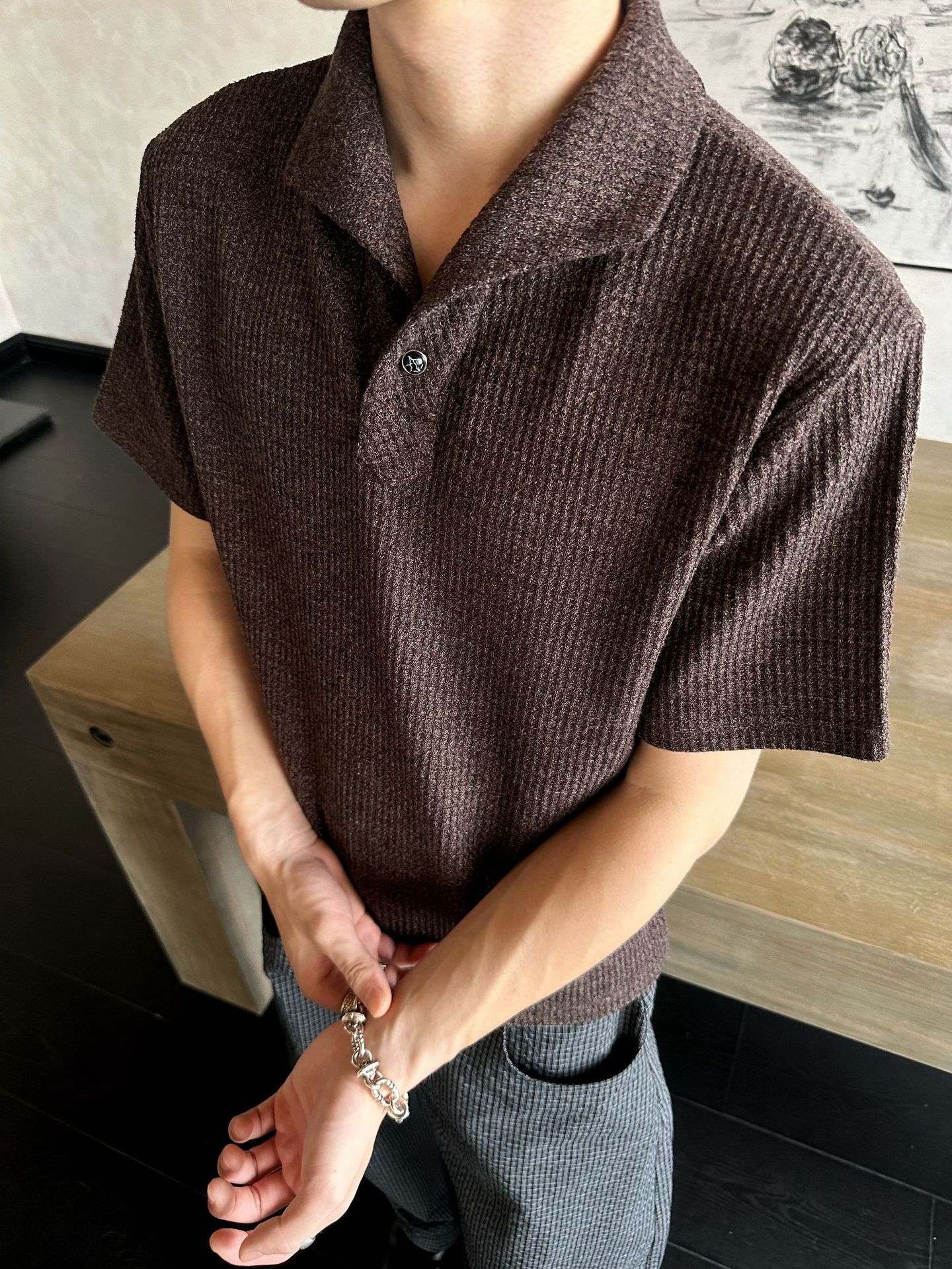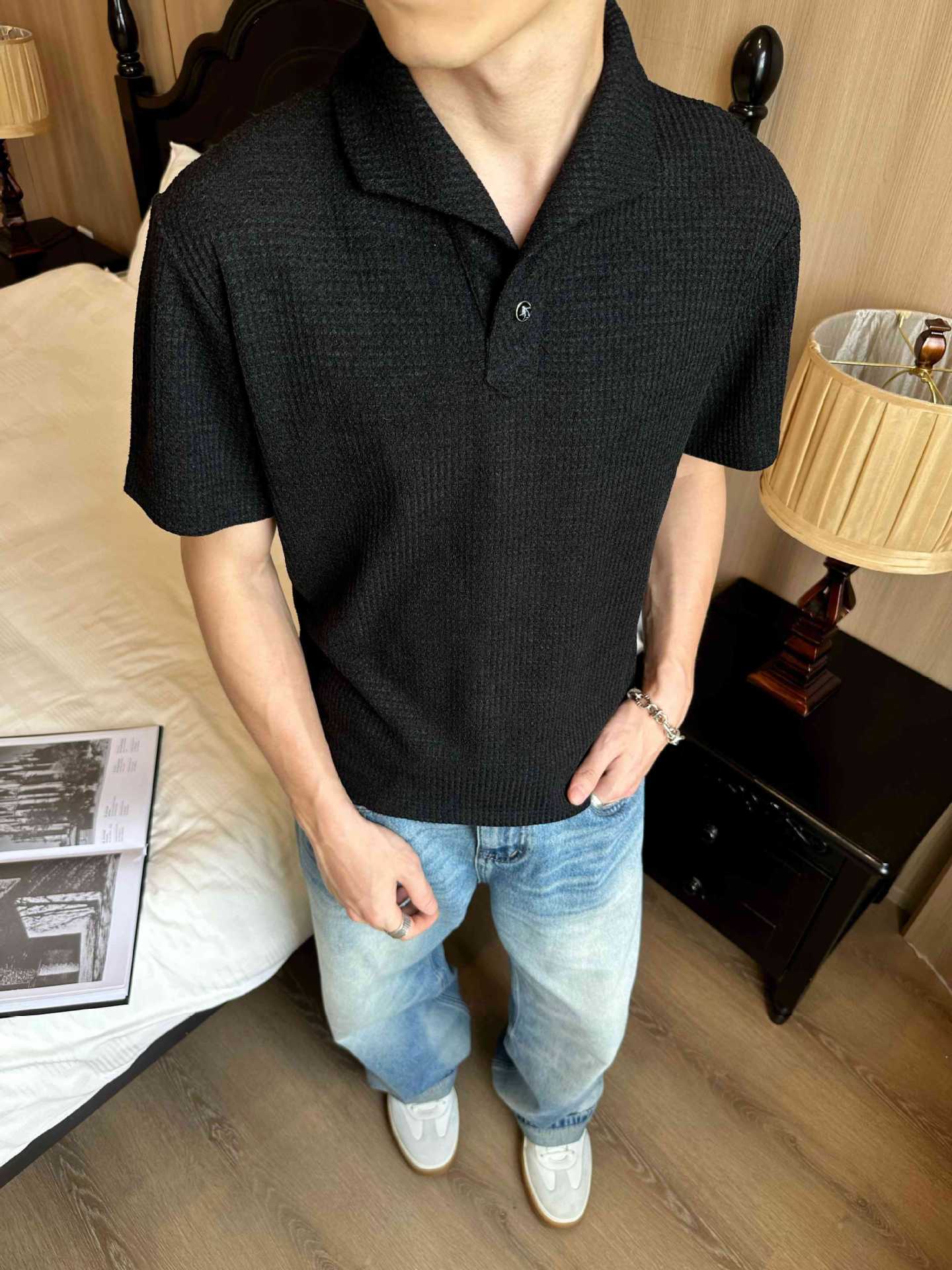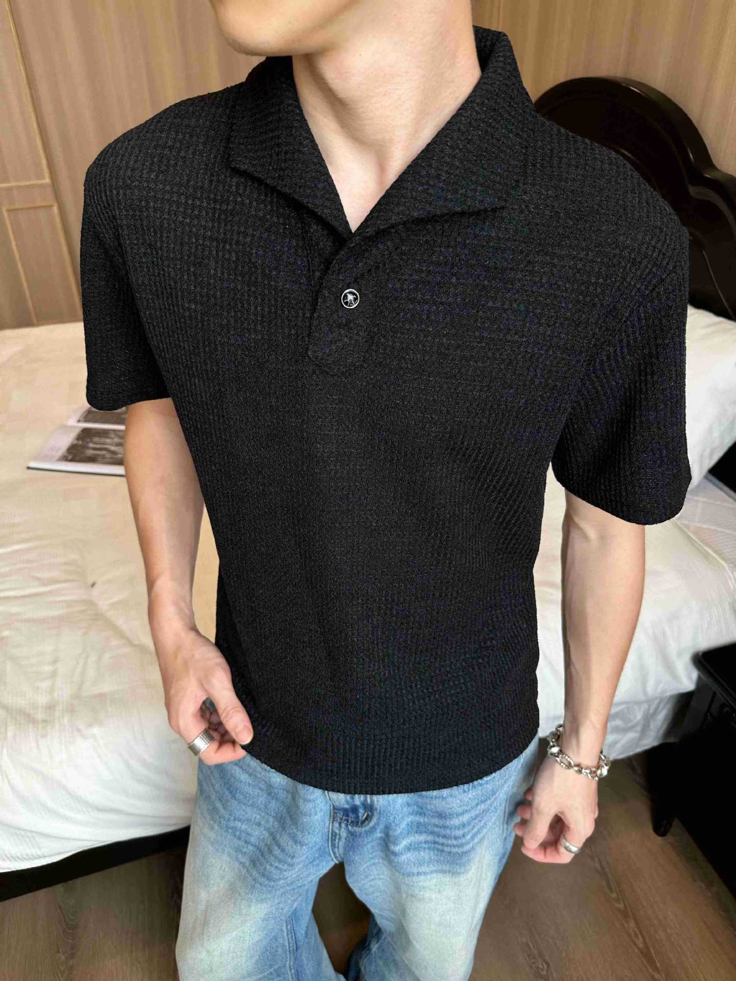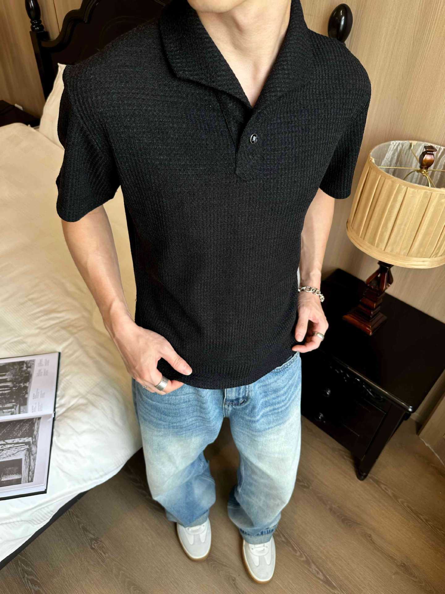 EME易盛易 轻奢罗马格意式一片领猫眼石扣正肩短袖打底polo衫男