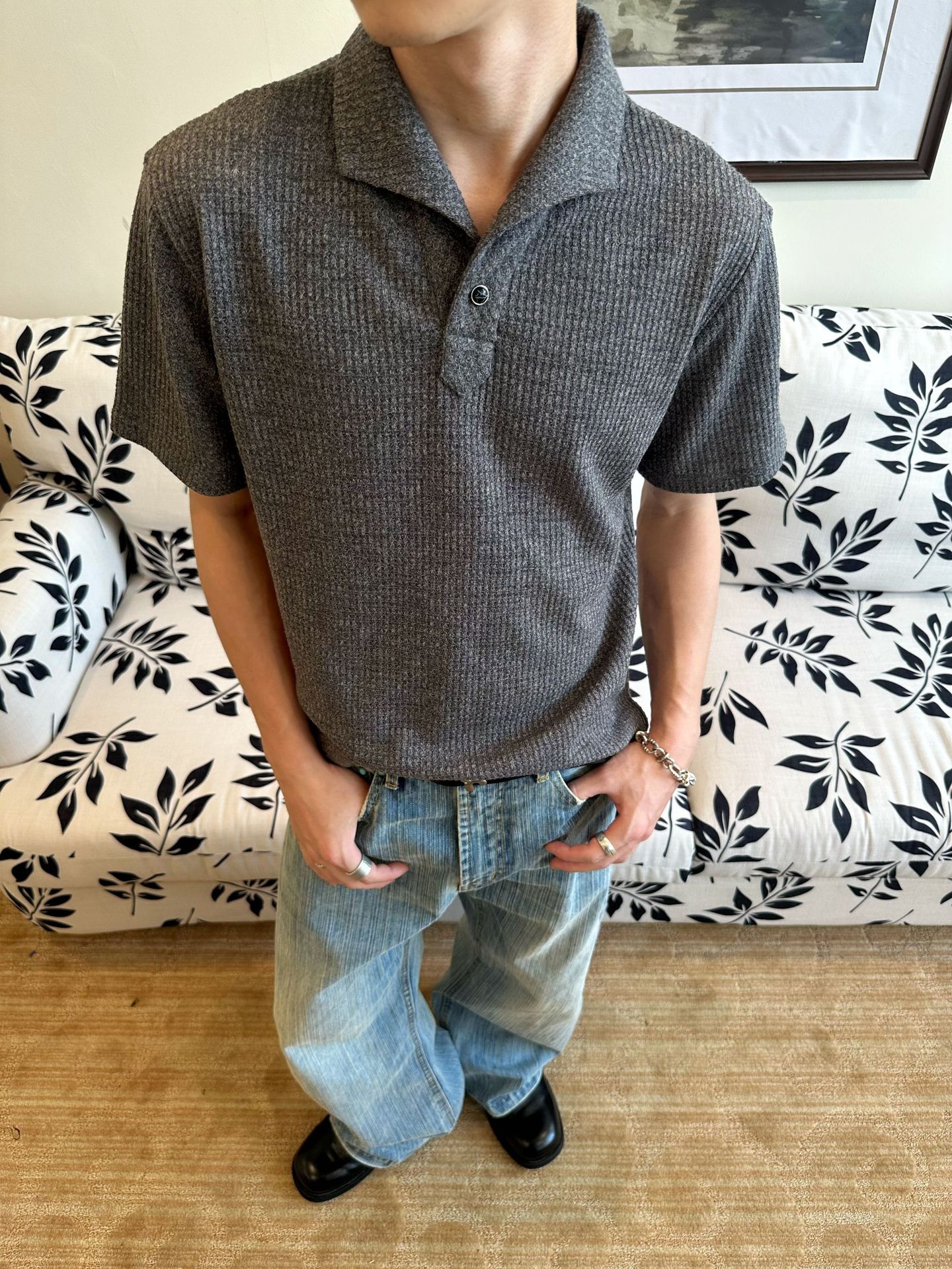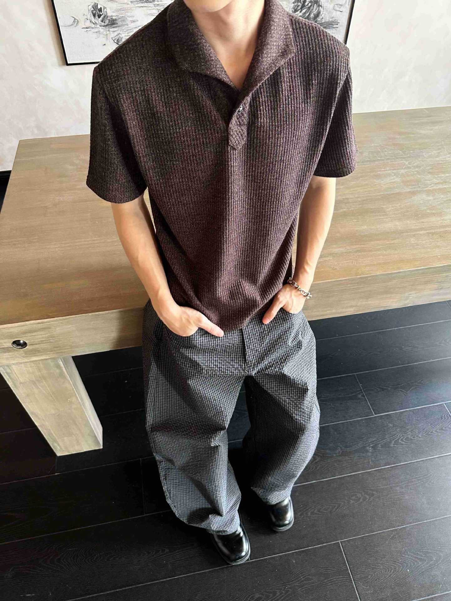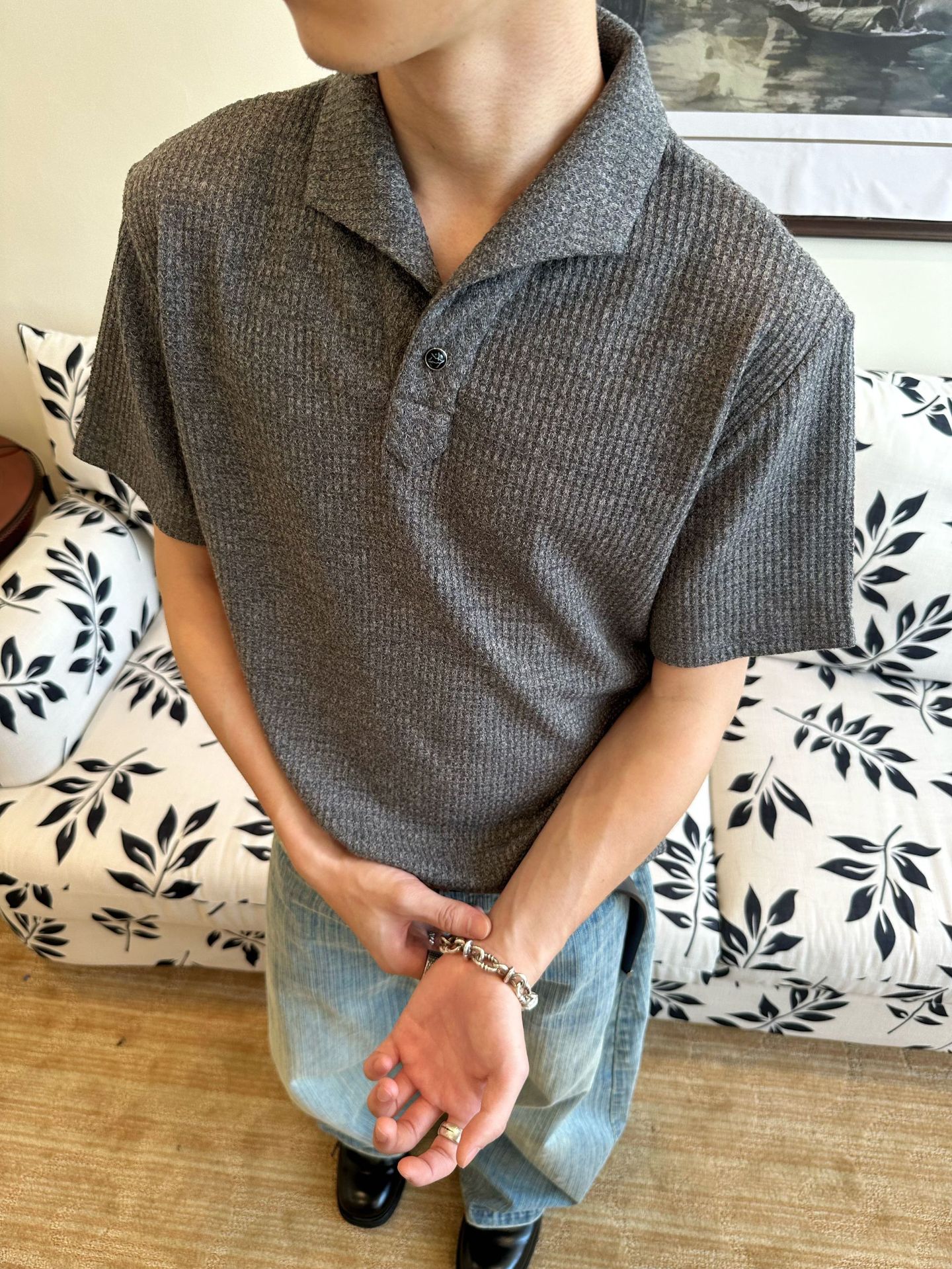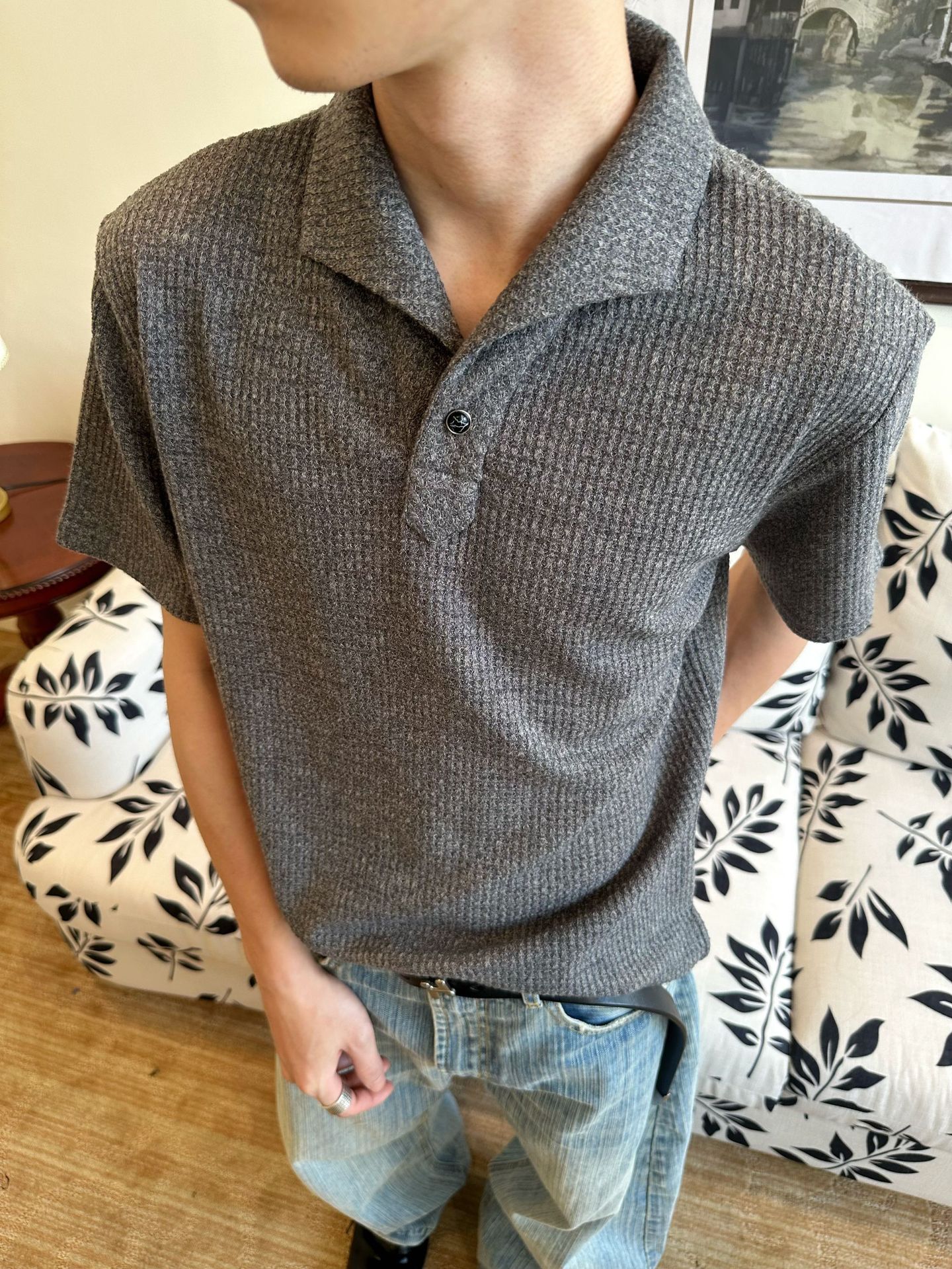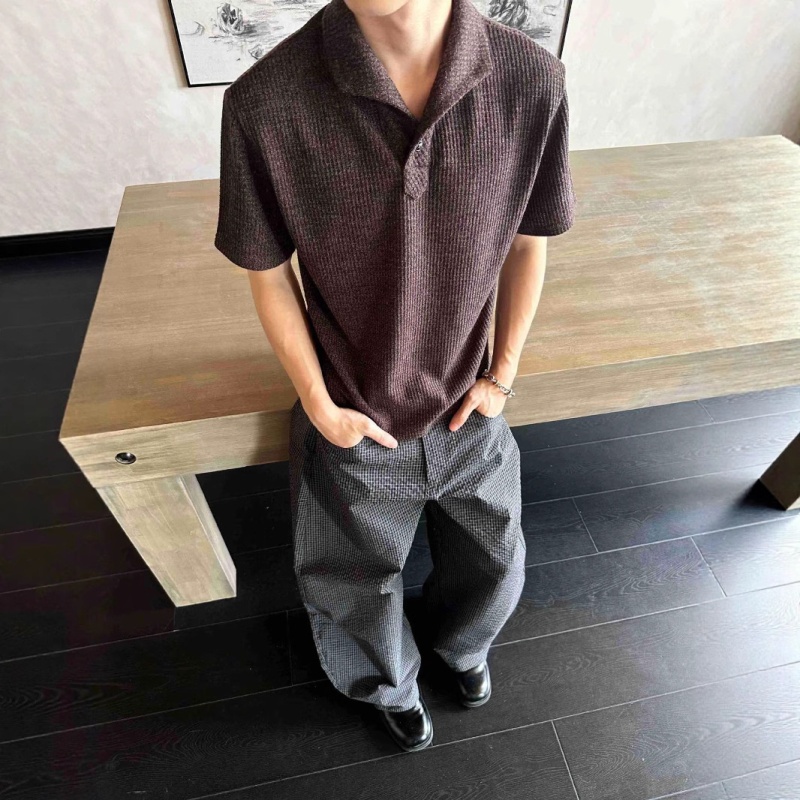 EME易盛易 轻奢罗马格意式一片领猫眼石扣正肩短袖打底polo衫男