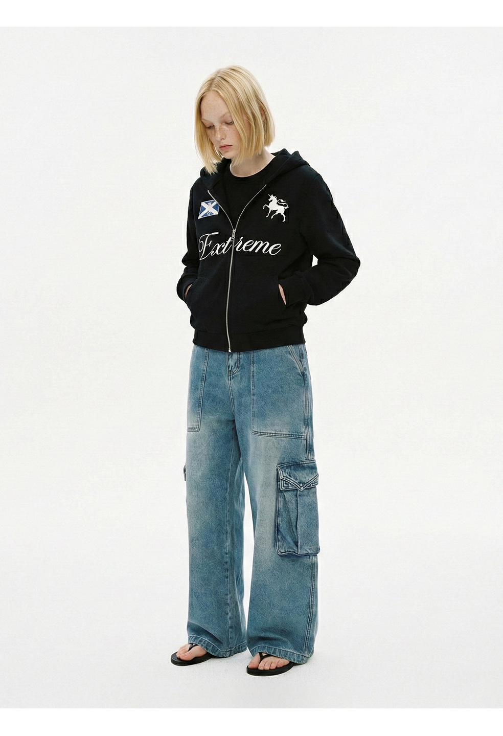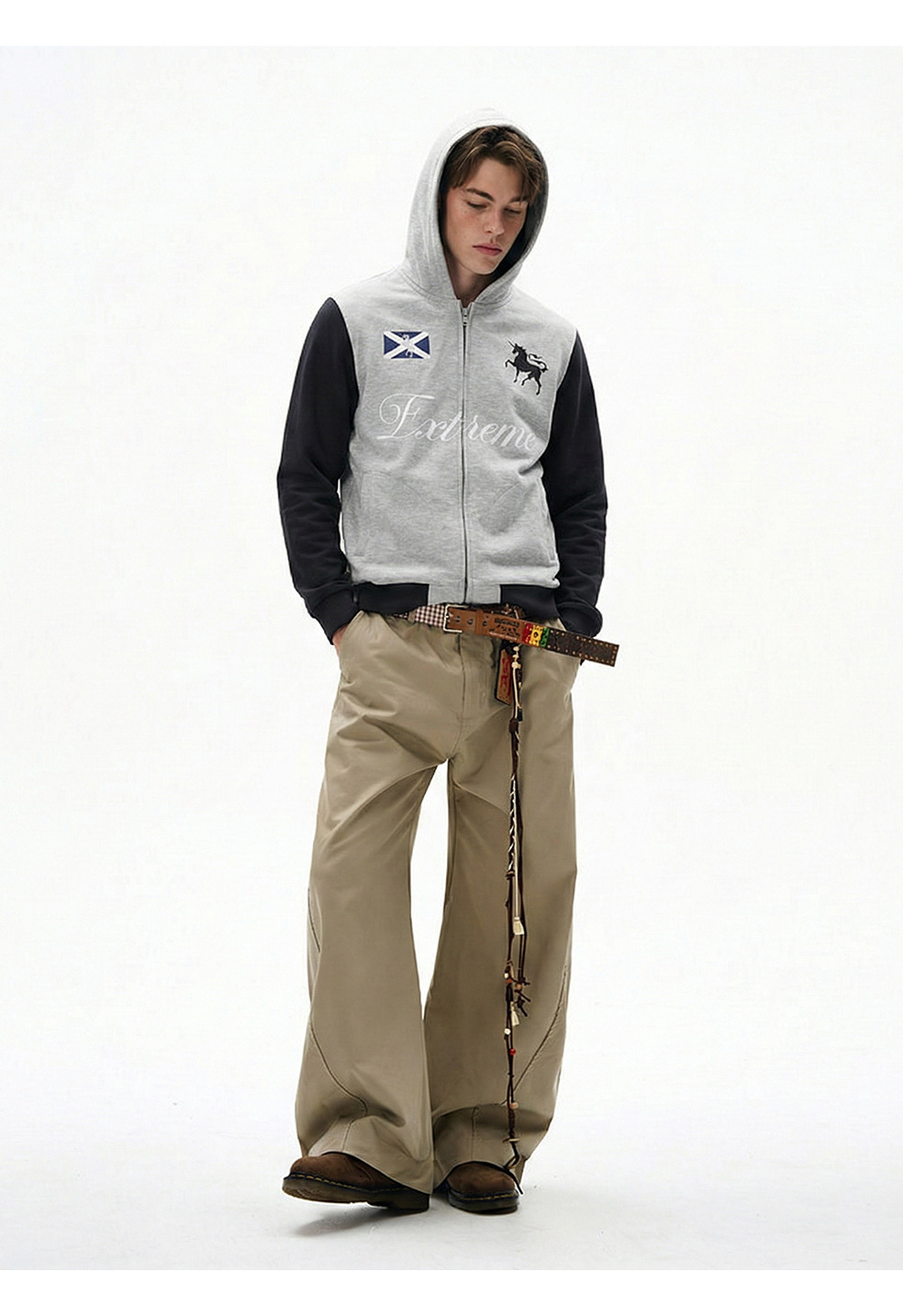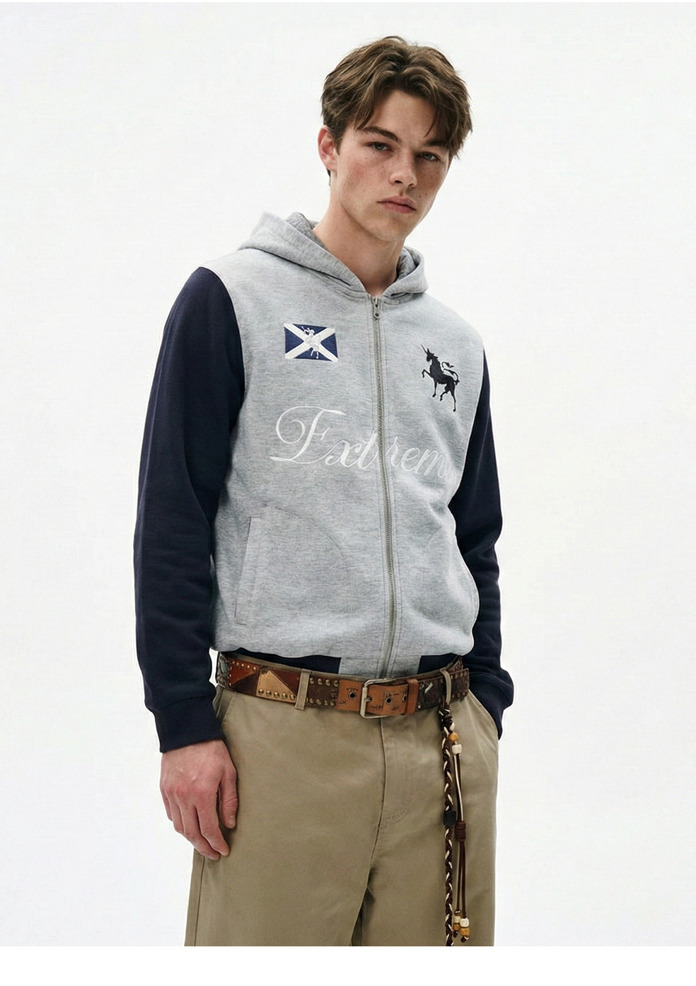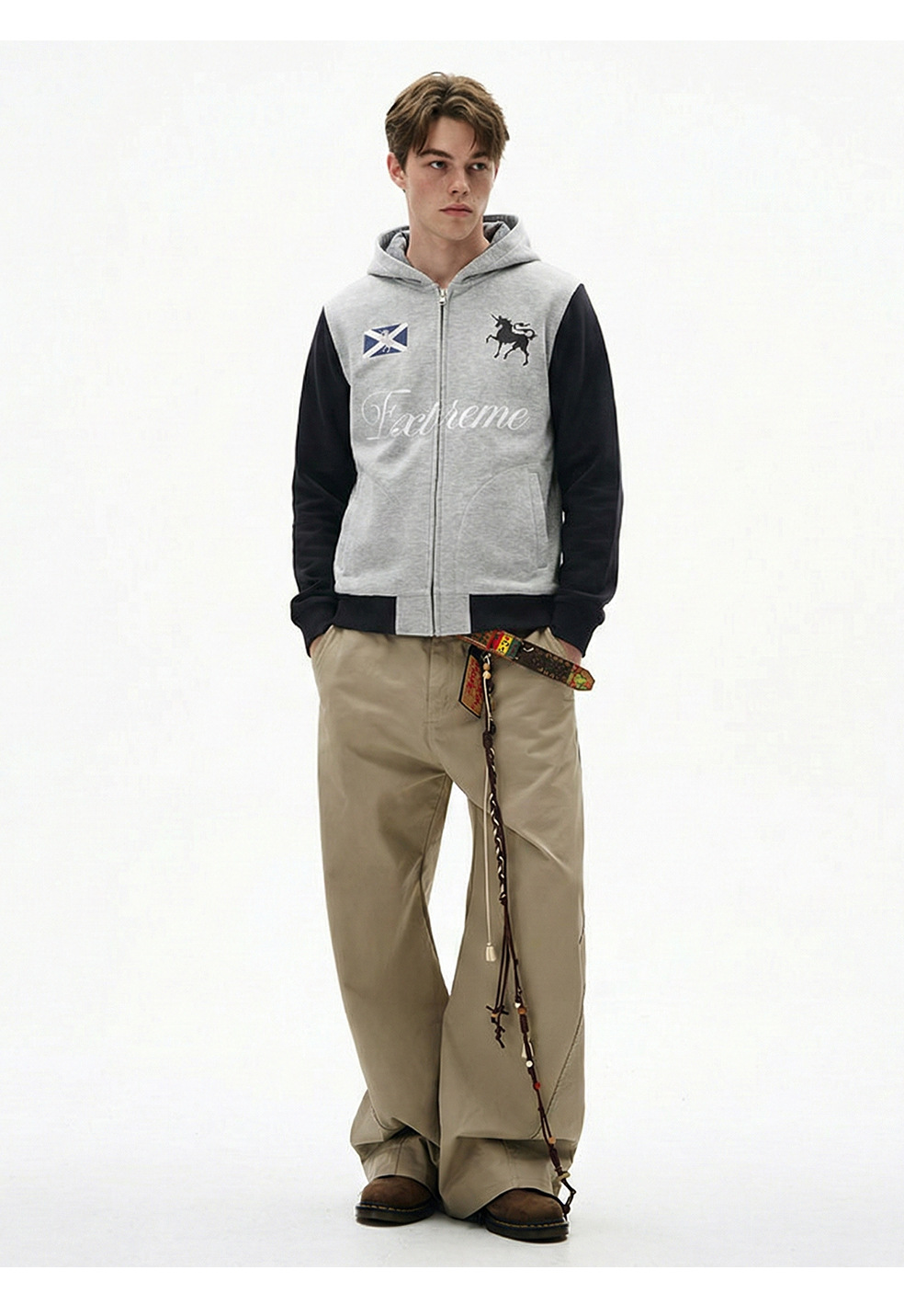 易盛易 370g战马绣花美式复古撞色通勤休闲宽松连帽卫衣外套男女