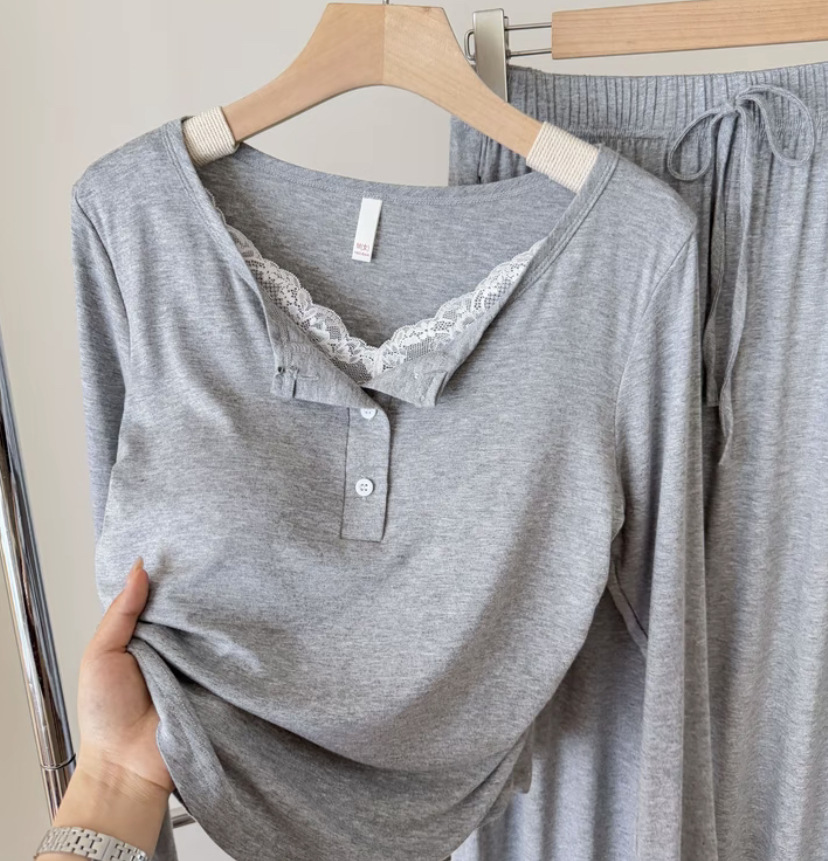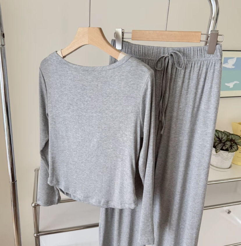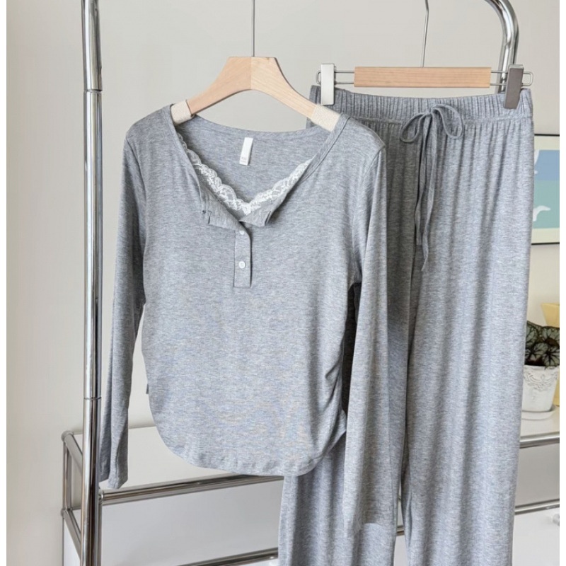 带胸垫蕾丝长袖莫代尔睡衣女薄款可外穿家居服两件套少女简约宿舍