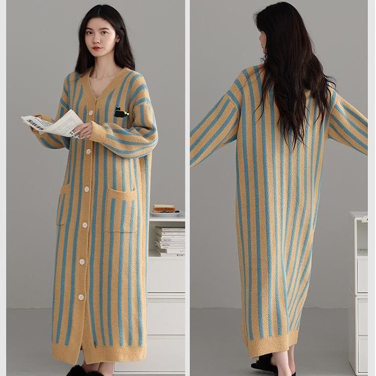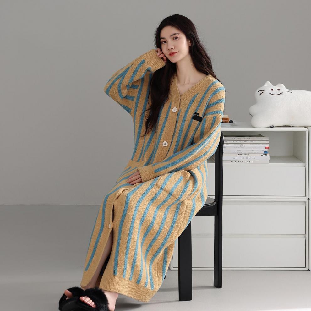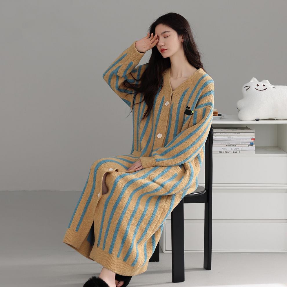 商品名称:冬季新款加厚半边绒条纹V领开衫睡裙女家居服