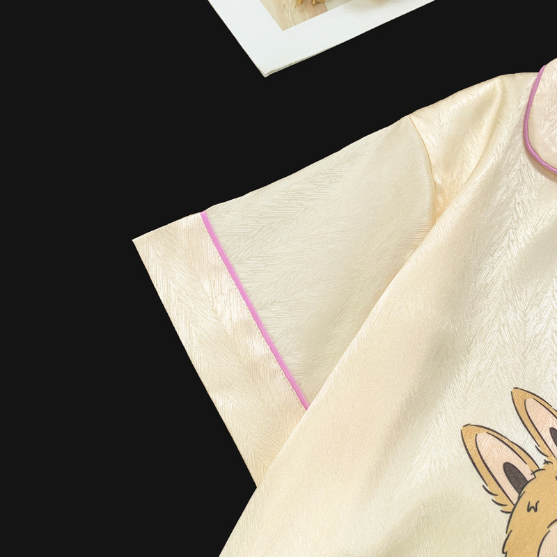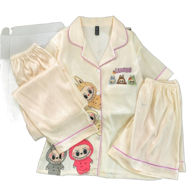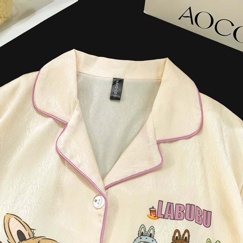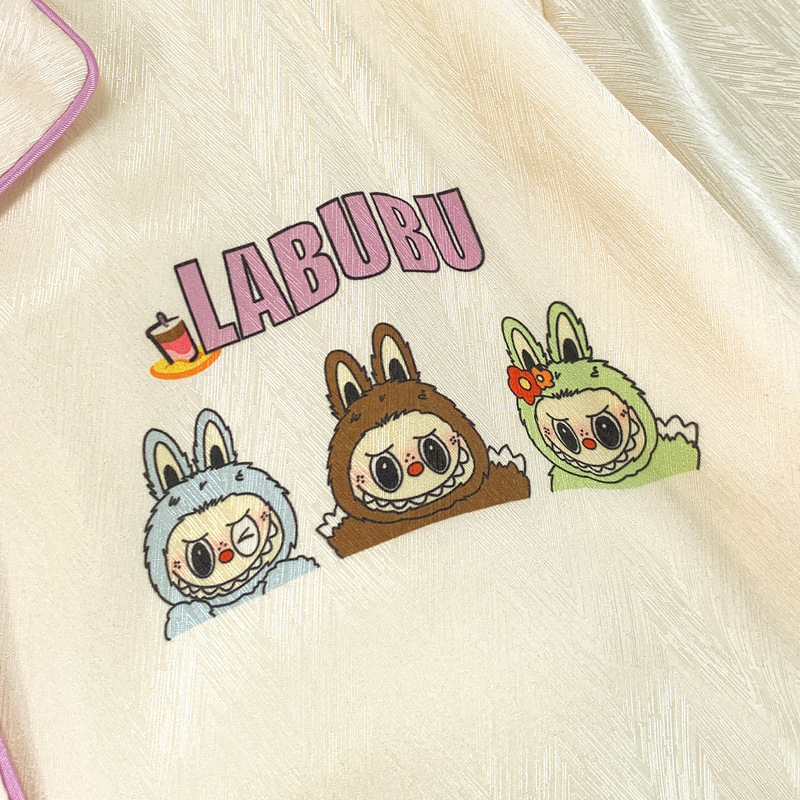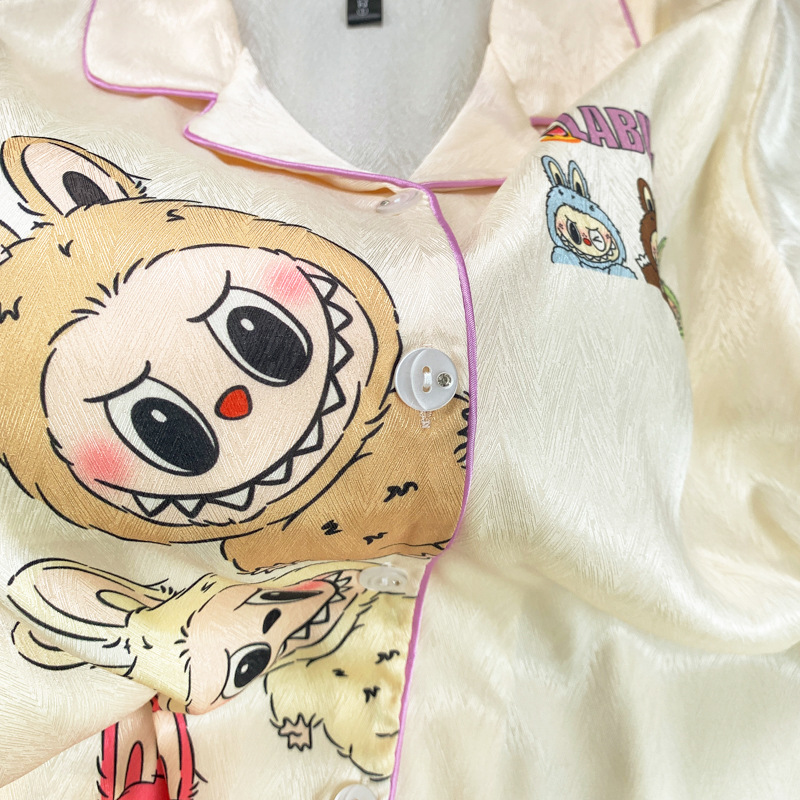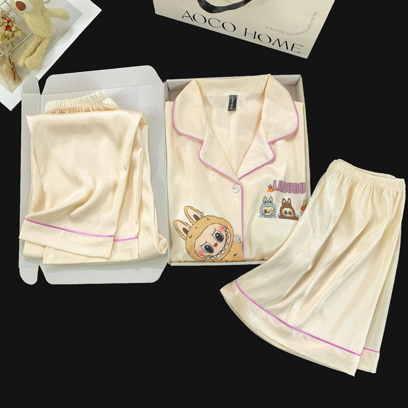 商品名称:实拍#冰丝带胸垫睡衣三件套女士家居服套装开衫拉布布杏色卡通