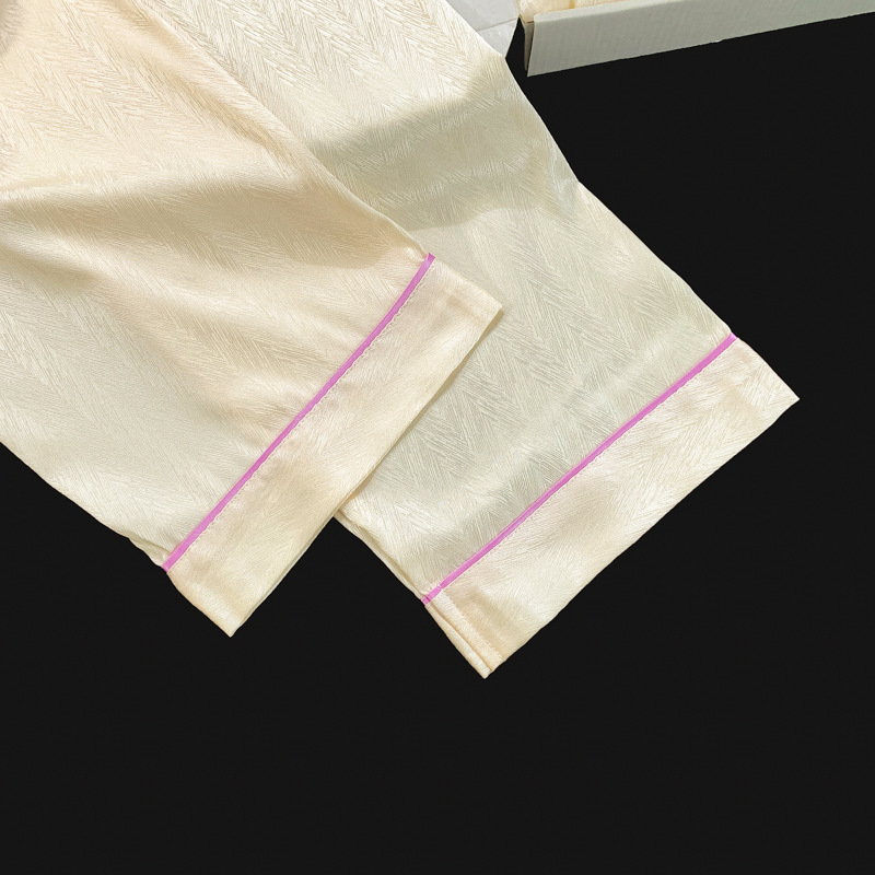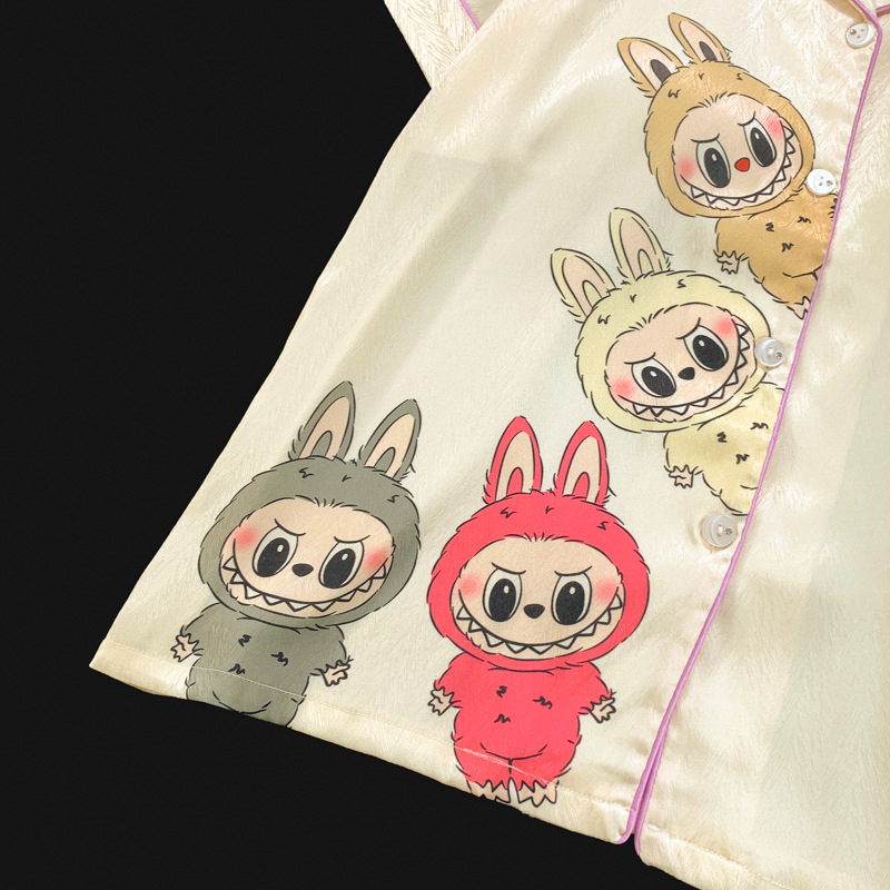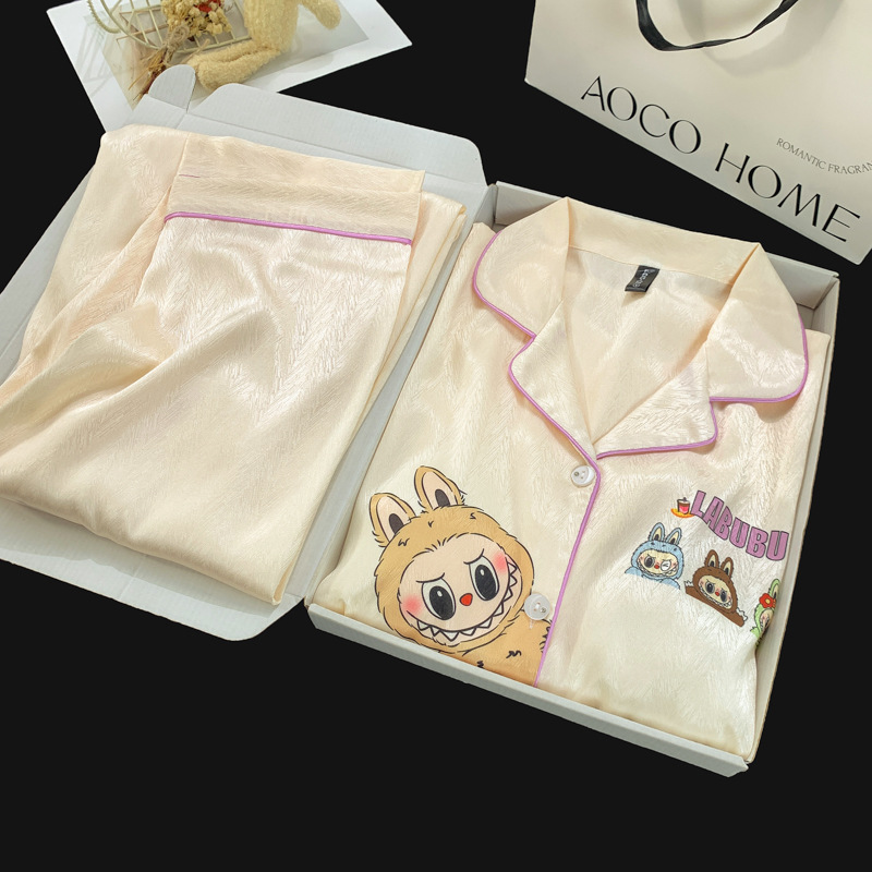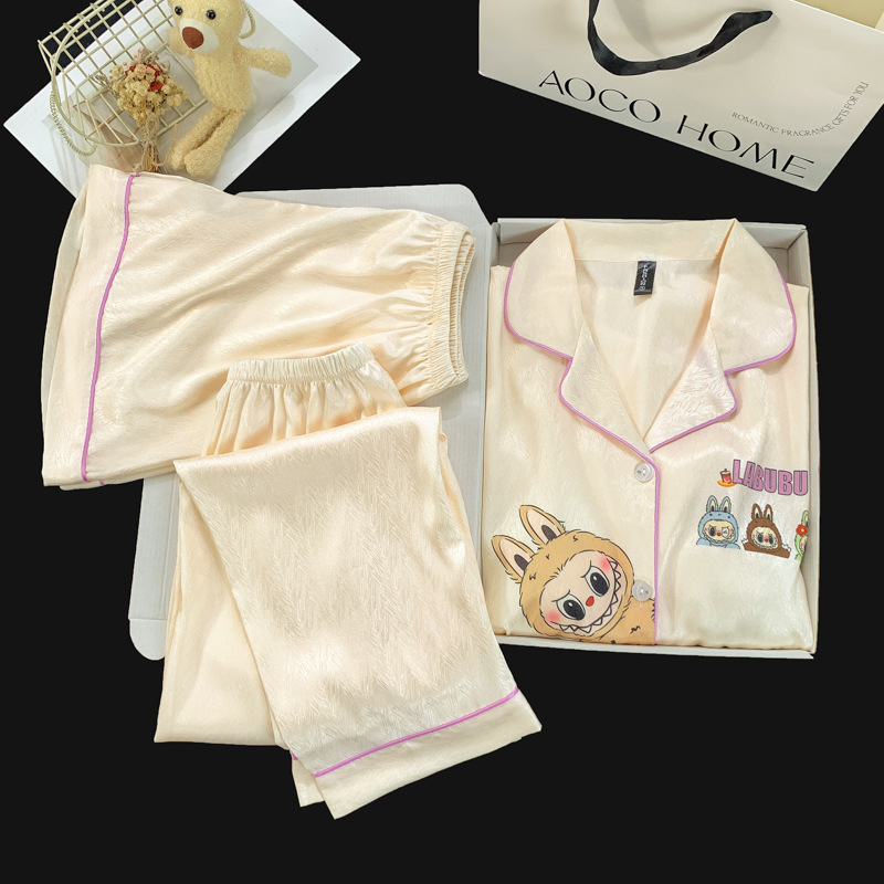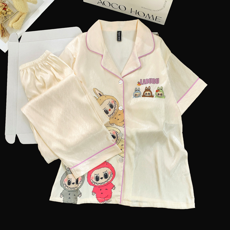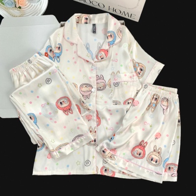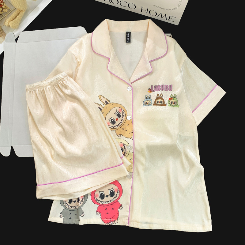 商品名称:实拍#冰丝带胸垫睡衣三件套女士家居服套装开衫拉布布杏色卡通