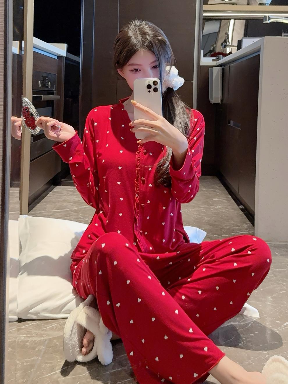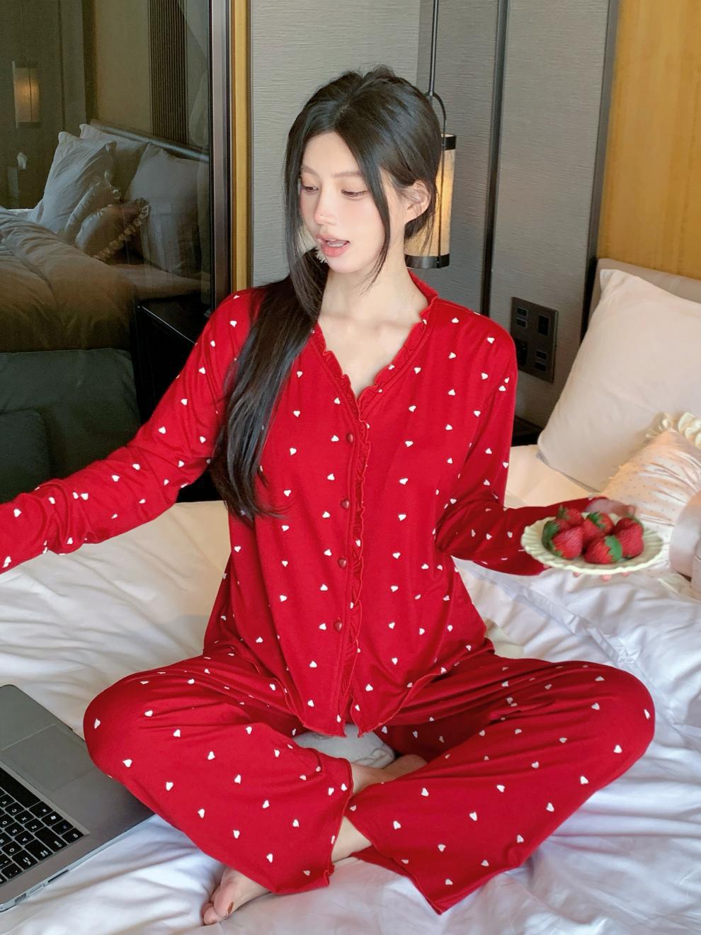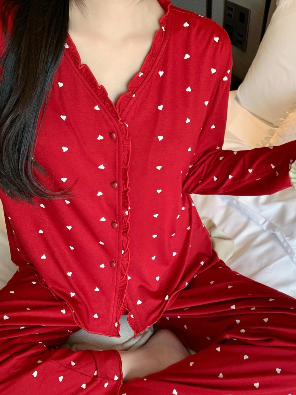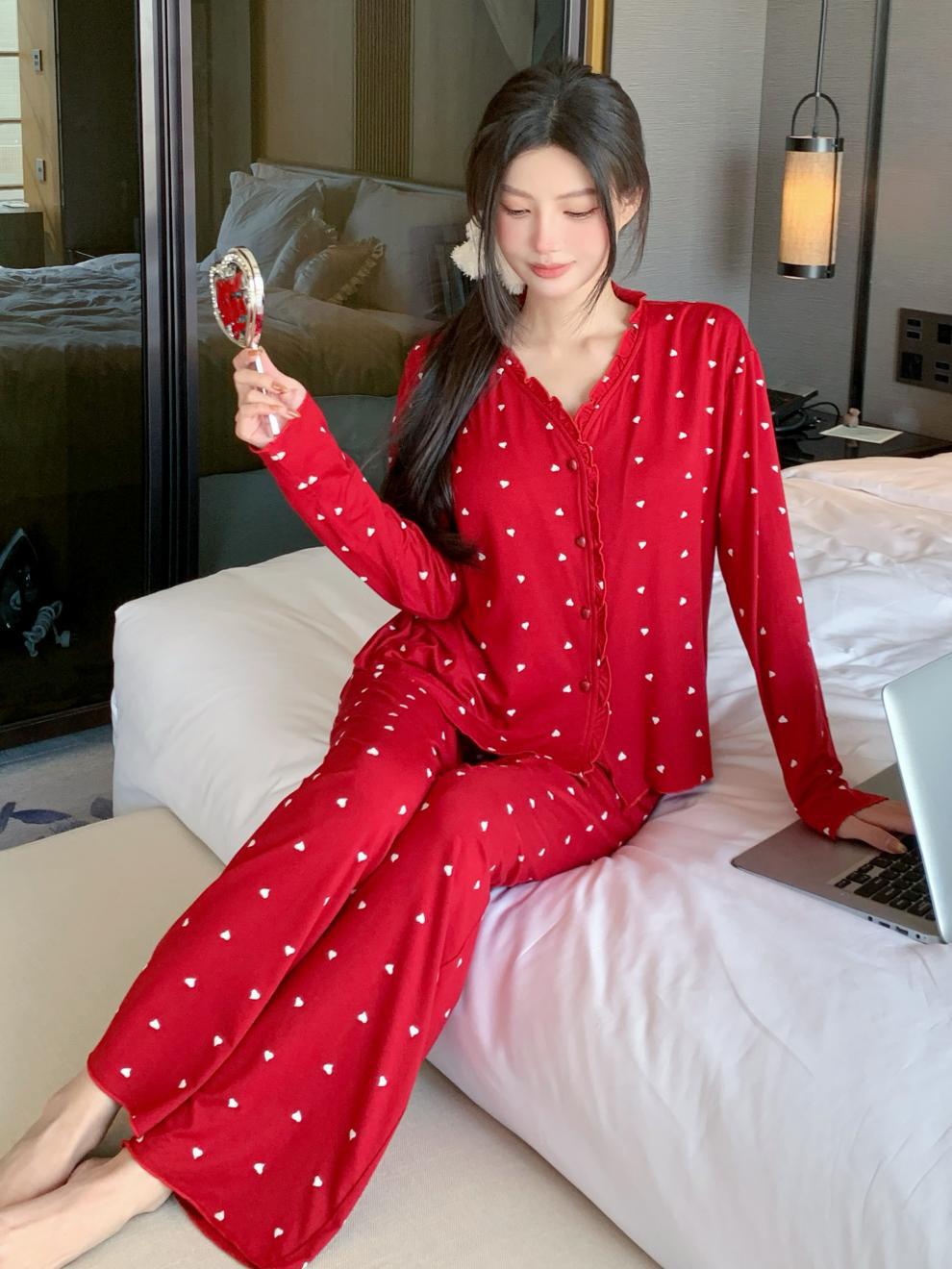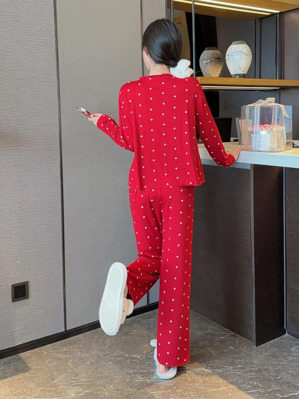 莫代尔睡衣女春秋季带胸垫爱心长袖本命年红色家居服套装