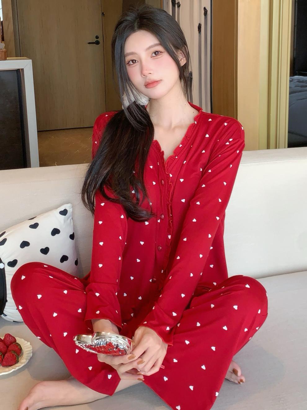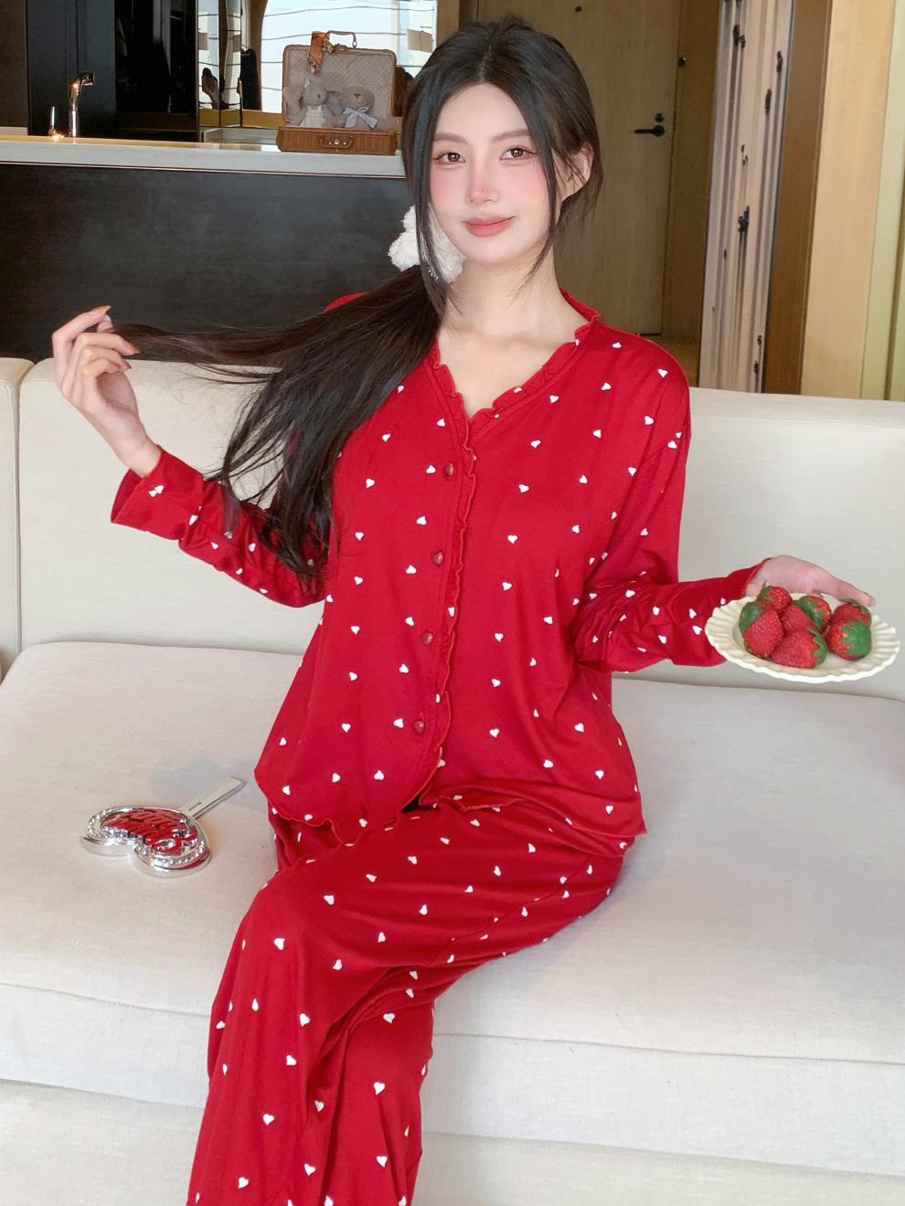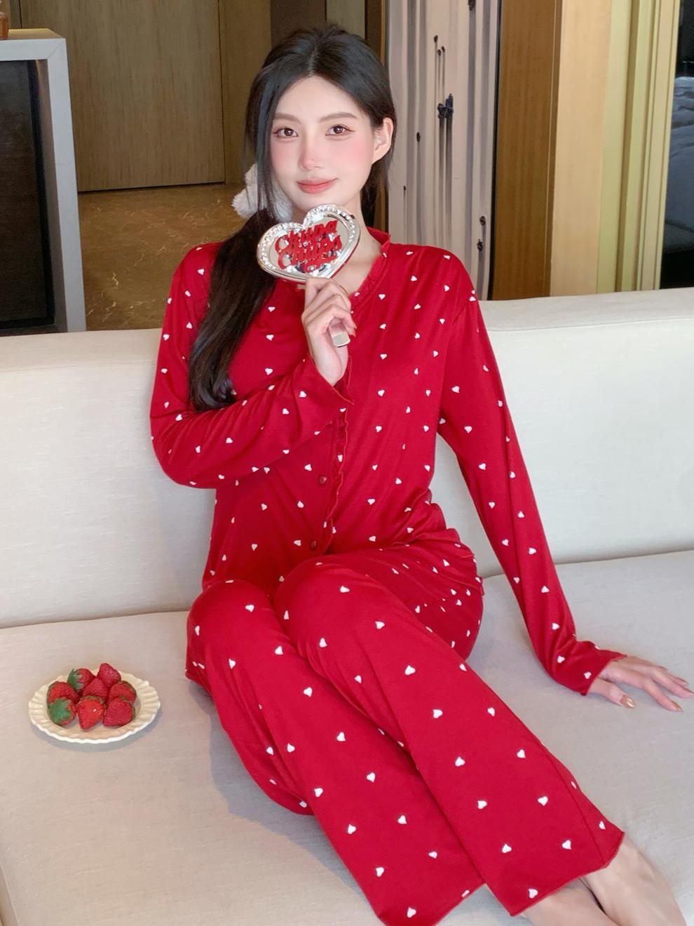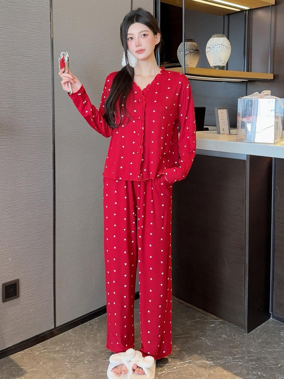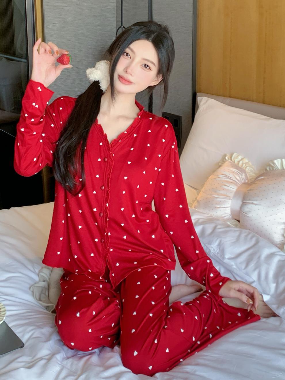 莫代尔睡衣女春秋季带胸垫爱心长袖本命年红色家居服套装