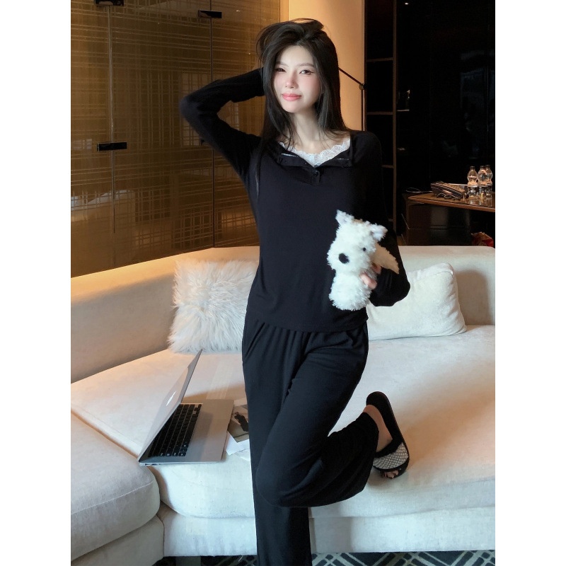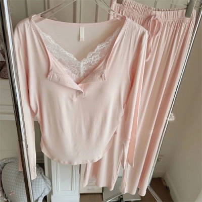 带胸垫莫代尔睡衣女蕾丝长袖长裤春秋可外穿家居服两件套