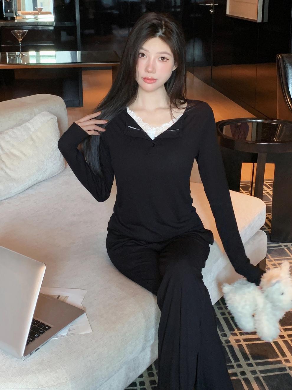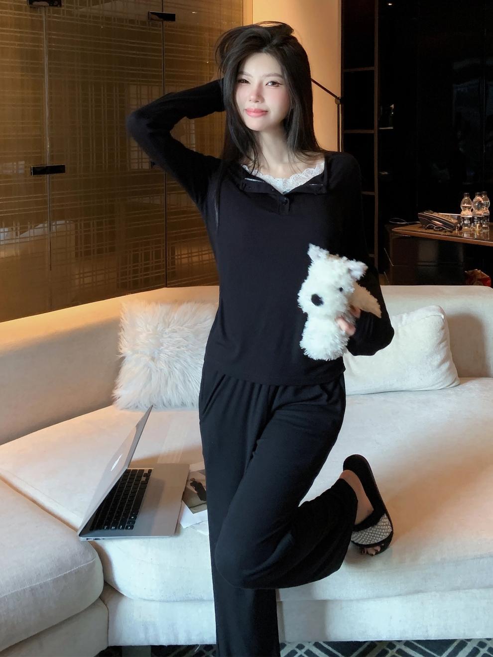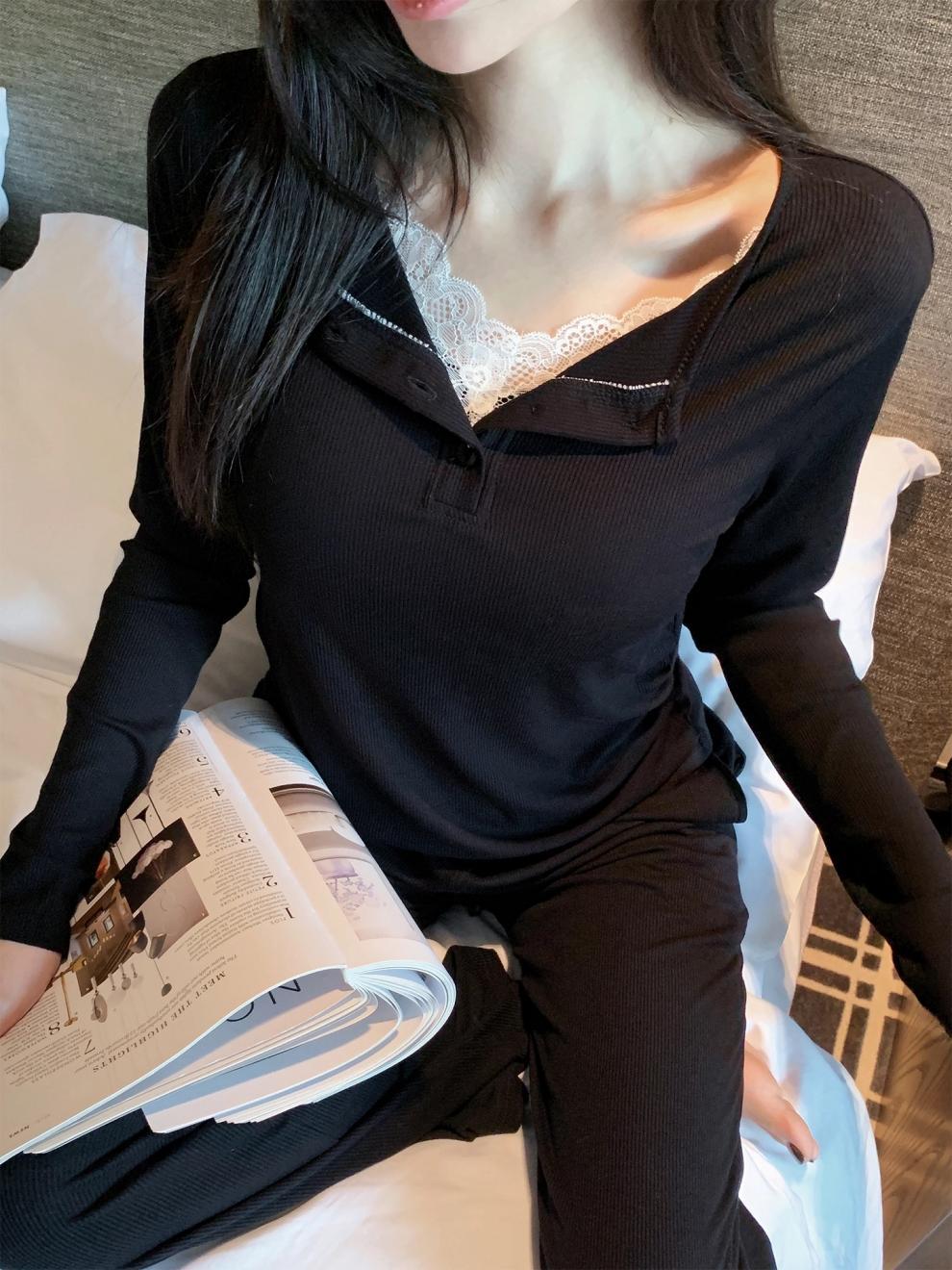 商品名称:带胸垫莫代尔睡衣女蕾丝长袖长裤春秋可外穿家居服两件套
