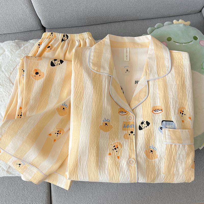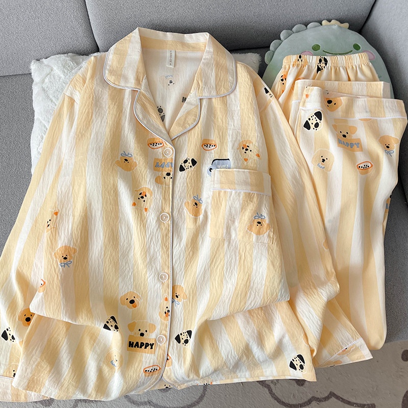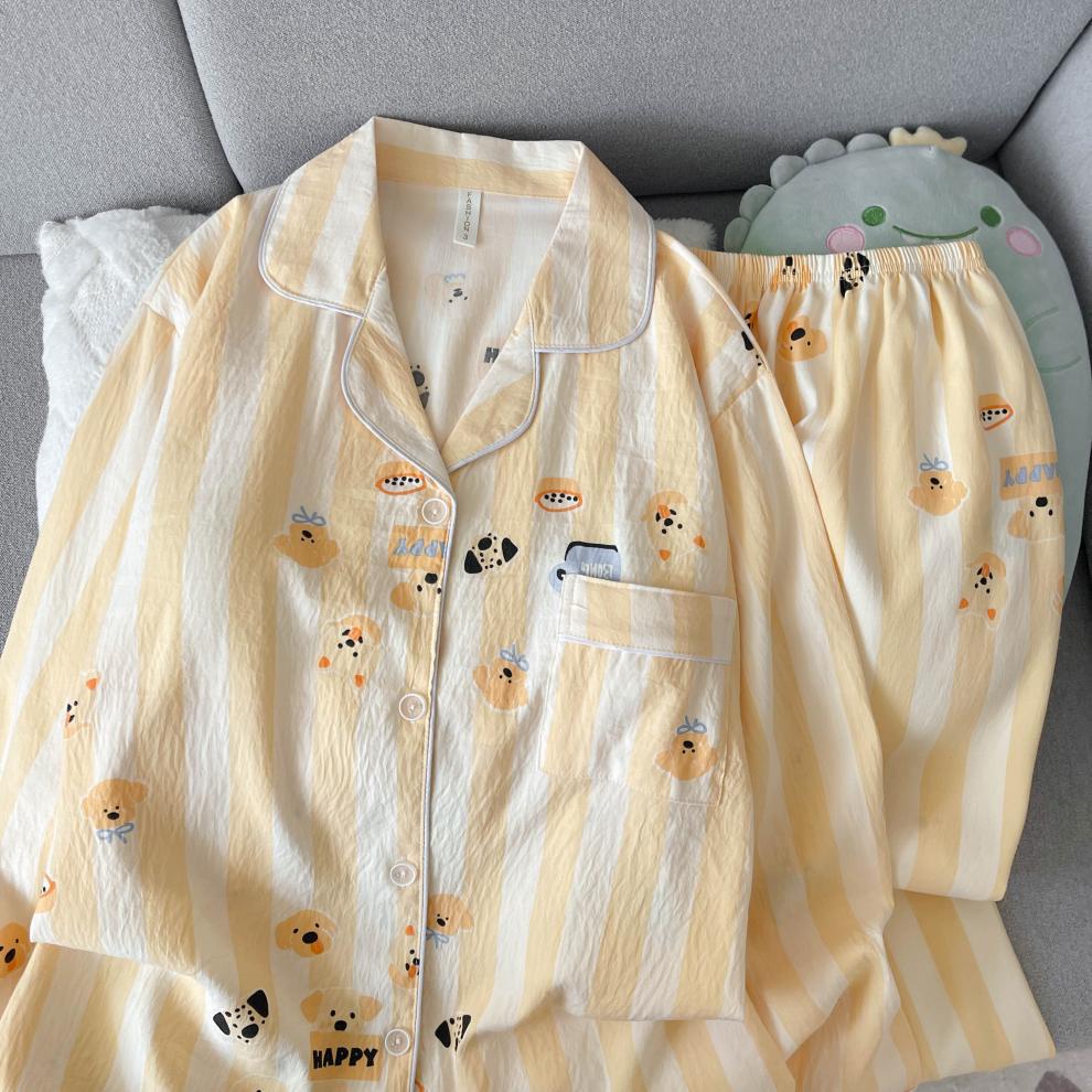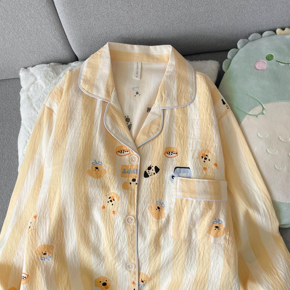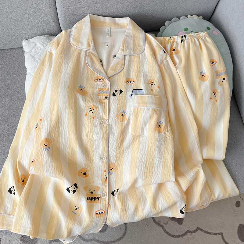 黄条圈圈熊睡衣女春秋长袖长裤两件套卡通甜美可爱家居服