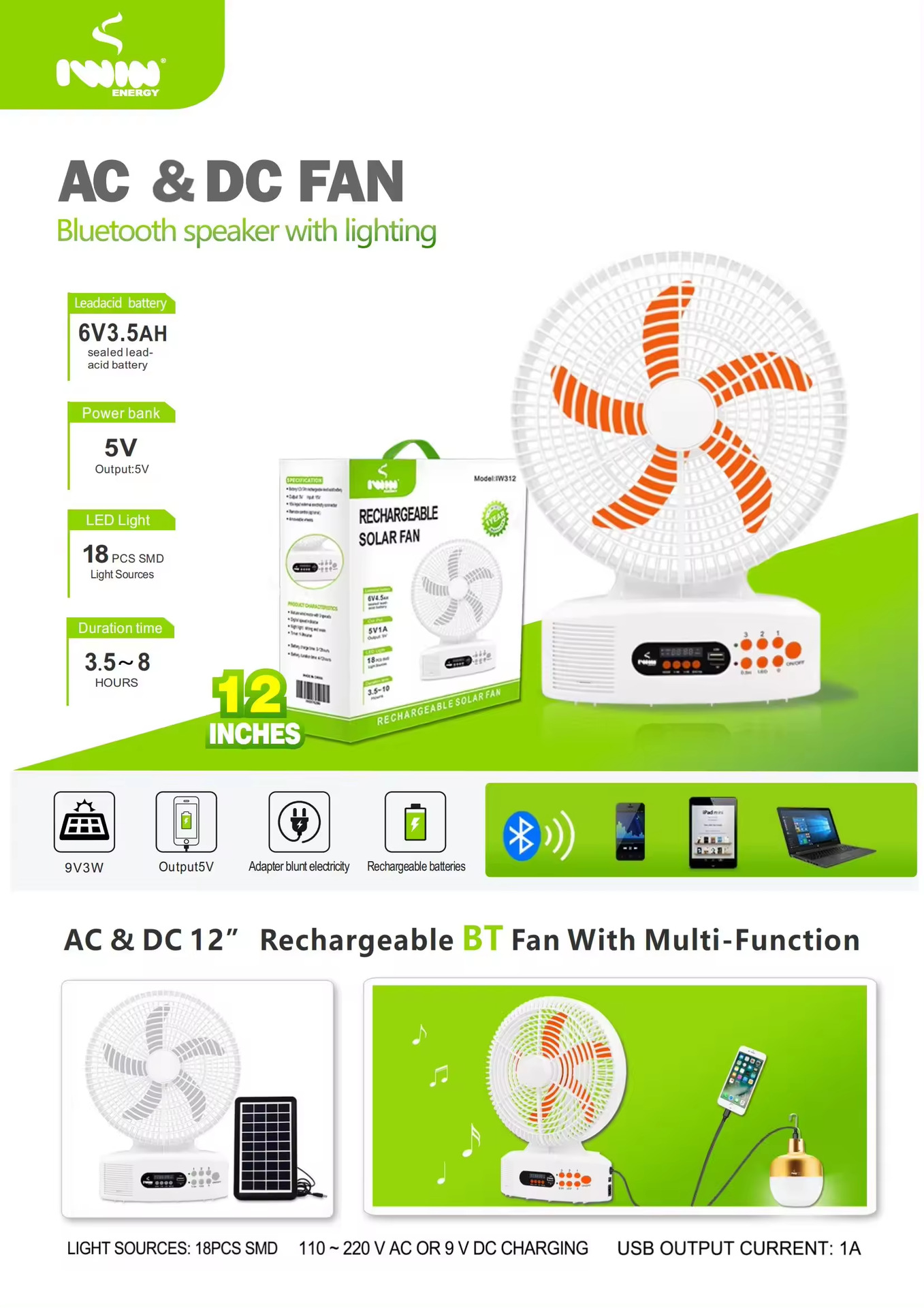 IWIN 12英寸 太阳能风扇充电带灯 和无线扬声器东南亚太阳能风扇